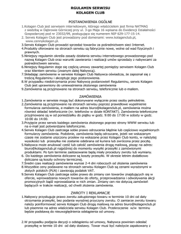 RGULAMIN SERWISU KOLAGEN CLUB POSTANOWIENIA OGÓLNE 1.Kolagen Club jest serwisem internetowym, którego właścicielem jest firma NATMAG z siedzibą w Dąbrowie Górniczej przy ul. 3-go Maja 16 wpisana do Ewidencji Działalności Gospodarczej pod nr 23032/99, posługująca się numerem NIP 629-177-15-14. 2. Serwis Kolagen Club jest prowadzony pod domenami: www.kolagenclub.pl, www.cennykolagen.pl. 3.Serwis Kolagen Club prowadzi sprzedaż towarów za pośrednictwem sieci Internet. 4.Produkty oferowane na stronach serwisu są fabrycznie nowe, wolne od wad fizycznych i prawnych. 5.Niniejszy regulamin określa zasady działania serwisu internetowego prowadzonego pod nazwą Kolagen Club oraz warunki zawierania i realizacji umów sprzedaży z nabywcami za pośrednictwem serwisu. 6.Niniejszy Regulamin staje się częścią umowy zawartej pomiędzy serwisem Kolagen Club oraz klientem serwisu (zwanym dalej Nabywcą). 7.Składając zamówienie w serwisie Kolagen Club Nabywca oświadcza, że zapoznał się z treścią Regulaminu i akceptuje jego postanowienia. 8.W przypadku niedotrzymania przez Nabywcę postanowień Regulaminu, serwis Kolagen Club jest uprawniony do unieważnienia złożonego zamówienia 9.Zamówienia są przyjmowane na stronach serwisu, telefonicznie lub e-mailem. ZAMÓWIENIA 1.Zamówienia w serwisie mogą być dokonywane wyłącznie przez osoby pełnoletnie. 2.Zamówienia są przyjmowane na stronach serwisu poprzez prawidłowe wypełnienie formularza zamówienia, e-mailem na adres [email protected], zamówienia można również składać telefonicznie (nr. telefonów w dziale KONTAKT). Zamówienia telefoniczne przyjmowane są w od poniedziałku do piątku w godz. 9:00 do 17:00 w soboty w godz. 10:00 do 14:00. 3.Przyjęcie przez serwis każdego zamówienia złożonego poprzez strony WWW serwisu lub na e-mail jest potwierdzane telefonicznie. 4.Serwis Kolagen Club zastrzega sobie prawo odrzucenia błędnie lub częściowo wypełnionych formularzy zamówienia. Podobnie, zamówienia będą odrzucane, jeżeli we wskazanym czasie nie zostanie uiszczony przelew na wskazane przez Kolagen Club konto, w należytej wysokości lub przesyłka nie zostanie odebrana od kuriera lub zwrócona przez pocztę. 5.Nabywca może anulować cześć lub całość zamówienia drogą mailową, pisząc na adres: [email protected] najpóźniej do momentu wysyłki przesyłki z zamówionymi produktami. Po tym terminie zastosowanie będą miały procedury zwrotu lub wymiany. 6. Do każdego zamówienia doliczane są koszty przesyłki. W okresie letnim dodatkowo doliczane są koszty ochrony termicznej. 7.Średni czas realizacji zamówienia wynosi 2-4 dni roboczych od złożenia zamówienia 8.Wszystkie ceny podawane na stronach serwisu Kolagen Club są cenami wyrażonymi w złotych polskich (PLN) i zawierają podatek VAT. 9.Serwis Kolagen Club zastrzega sobie prawo do zmiany cen towarów znajdujących się w ofercie, wprowadzania nowych towarów do oferty, przeprowadzania i odwoływania akcji promocyjnych bądź wprowadzania w nich zmian. Zmiany cen nie dotyczą zamówień będących w trakcie realizacji, od chwili złożenia zamówienia. ZWROTY I REKLAMACJE 1.Nabywcy przysługuje prawo zwrotu zakupionego towaru w terminie 10 dni od daty otrzymania przesyłki, bez podania wyraźnej przyczyny zwrotu. O zamiarze zwrotu towaru należy poinformować serwis Kolagen Club drogą mailową na adres [email protected] lub pisemnie na adres właściciela serwisu Kolagen Club. Przekroczenie w/w terminu będzie podstawą do nieuwzględnienia odstąpienia od umowy. 2.W przypadku podjęcia decyzji o odstąpieniu od umowy, Nabywca powinien odesłać przesyłkę w termie 10 dni od daty dostawy. Towar musi być należycie zapakowany z dołączonym dokumentem zakupu. Koszty przesyłki pokrywa Nabywca. Nie przyjmujemy przesyłek odesłanych na koszt serwisu lub wysłanych bez powiadomienia. 3.Zwroty dopuszczalne są tylko towaru w oryginalnym, nieuszkodzonym opakowaniu, z kompletną jego zawartością, a sam produkt oraz akcesoria nie mogą nosić śladów użytkowania 4.Serwis Kolagen Club zobowiązuje się rozpatrzyć zgłoszenie zwrotu w ciągu 2 dni od dnia dostarczenia przesyłki do serwisu, jeśli wszystkie ww. warunki zwrotu towaru zostaną spełnione, zwrot pieniędzy w wysokości ceny odesłanego towaru (zwrotowi nie podlegają koszty dostawy), nastąpi w terminie do 7 dni od daty otrzymania zwracanego towaru, na wskazane przez Nabywcę konto bankowe. 5.Towar, którego zwrot nie zostanie uznany zostanie odesłany do Nabywcy na jego koszt. 6.Jeżeli po otrzymaniu towaru Nabywca znajdzie w nim wady, powinien skontaktować się niezwłocznie telefonicznie i odesłać go przesyłką pocztową na adres wskazany przez konsultanta. Wszelkie reklamacje rozpatrywane są najpóźniej do 2 dni roboczych od ich wpłynięcia. Uszkodzony produkt zostanie wymieniony na inny lub na życzenie Nabywcy serwis Kolagen Club zwróci nabywcy równowartość ceny produktu ewentualnie zaoferuje mu inne, dostępne produkty do wyboru. 7.Jeżeli zamówione produkty kolagenowe uległy uszkodzeniu (mechanicznie, despiralizacja) z winy Nabywcy serwis Kolagen Club ma prawo odmówić uznania reklamacji. Dodatkowo każdy Nabywca zostaje dokładnie poinformowany o sposobie używania oraz przechowywania produktów kolagenowych słownie oraz poprzez załączone do każdego produktu ulotki informacyjne. 8.Koszt dostawy i odesłania towaru nie podlega zwrotowi w przypadku uszkodzenia towaru przez Nabywcę. 9.Serwis Kolagen Club nie ponosi odpowiedzialności za uszkodzenie paczki oraz nieterminowe dostarczenie przesyłek powstałe na skutek działania firmy kurierskiej. Nabywca jest zobowiązany sprawdzić stan przesyłki podczas odbioru w obecności pracownika firmy kurierskiej. W przypadku stwierdzenia uszkodzenia przesyłki Nabywca zobowiązany jest zgłosić ten fakt kurierowi i nie przyjmując towaru niezwłocznie sporządzić protokół reklamacyjny oraz poinfor