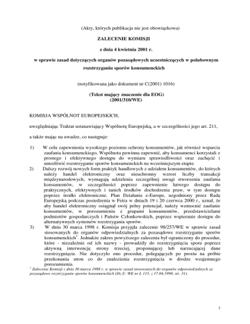 (Akty, których publikacja nie jest obowiązkowa) ZALECENIE KOMISJI z dnia 4 kwietnia 2001 r. w sprawie zasad dotyczących organów pozasądowych uczestniczących w polubownym rozstrzyganiu sporów konsumenckich (notyfikowana jako dokument nr C(2001) 1016) (Tekst mający znaczenie dla EOG) (2001/310/WE) KOMISJA WSPÓLNOT EUROPEJSKICH, uwzględniając Traktat ustanawiający Wspólnotę Europejską, a w szczególności jego art. 211, a także mając na uwadze, co następuje: 1) 2) 3) W celu zapewnienia wysokiego poziomu ochrony konsumentów, jak również wsparcia zaufania konsumenckiego, Wspólnota powinna zapewnić, aby konsumenci korzystali z prostego i efektywnego dostępu do wymiaru sprawiedliwości oraz zachęcić i umożliwić rozstrzyganie sporów konsumenckich na wcześniejszym etapie. Dalszy rozwój nowych form praktyk handlowych z udziałem konsumentów, do których należy handel elektroniczny oraz nieuchronny wzrost liczby transakcji międzynarodowych, wymagają udzielenia szczególnej uwagi stworzeniu zaufania konsumentów, w szczególności poprzez zapewnienie łatwego dostępu do praktycznych, efektywnych i tanich środków dochodzenia praw, w tym dostępu poprzez środki elektroniczne. Plan Działania e-Europe, uzgodniony przez Radę Europejską podczas posiedzenia w Feira w dniach 19 i 20 czerwca 2000 r., uznał, że aby handel elektroniczny osiągnął swój pełny potencjał, należy wzmocnić zaufanie konsumentów, w porozumieniu z grupami konsumentów, przedstawicielami podmiotów gospodarczych i Państw Członkowskich, poprzez wspieranie dostępu do alternatywnych systemów rozstrzygania sporów. W dniu 30 marca 1998 r. Komisja przyjęła zalecenie 98/257/WE w sprawie zasad stosowanych do organów odpowiedzialnych za pozasądowe rozstrzyganie sporów konsumenckich1. Jednakże zakres powyższego zalecenia był ograniczony do procedur, które - niezależnie od ich nazwy - prowadziły do rozstrzygnięcia sporu poprzez aktywną interwencję strony trzeciej, proponującej lub narzucającej dane rozstrzygnięcie. Nie dotyczyło ono procedur, polegających po prostu na próbie przekonania stron co do znalezienia rozstrzygnięcia w drodze wzajemnego porozumienia. 1 Zalecenie Komisji z dnia 30 marca 1988 r. w sprawie zasad stosowanych do organów odpowiedzialnych za pozasądowe rozstrzyganie sporów konsumenckich (Dz.U. WE nr L 115, z 17.04.1998, str. 31). 1 4) W swojej uchwale z dnia 25 maja 2000 r. w sprawie wspólnotowej sieci organów krajowych przeznaczonych do pozasądowego rozstrzygania sporów konsumenckich", Rada odnotowała, że powyższe pozasądowe organy pozostające poza zakresem działania zalecenia 98/257/WE odgrywają pożyteczną rolę dla konsumenta oraz wezwała Komisję do wypracowania, w ścisłej współpracy z Państwami Członkowskimi, wspólnych kryteriów dla oceny takich organów, które powinny zapewnić między innymi ich jakość, uczciwość i efektywność. W szczególności Rada wskazała, że Państwa Członkowskie stosują powyższe kryteria w celu włączenia takich organów lub mechanizmów do sieci, o których mowa w dokumencie roboczym Komisji w sprawie stworzenia europejskiej sieci pozasądowej (EEJ-Net) . 5) Art. 17 dyrektywy 2000/31/WE Parlamentu Europejskiego i Rady z dnia 8 czerwca 2000 r. w sprawie niektórych aspektów usług prawnych społeczeństwa informacyjnego, a w szczególności handlu elektronicznego na rynku wewnętrznym internetowym4 postanawia, że Państwa Członkowskie powinny zapewnić, aby ich przepisy ustawowe nie stanowiły przeszkody dla wykorzystywania mechanizmów pozasądowych do rozstrzygania sporów dostępnych zgodnie z prawem krajowym. 6) Handel elektroniczny ułatwia transakcje międzynarodowe pomiędzy podmiotami gospodarczymi a konsumentami. Takie transakcje charakteryzują się często niską wartością, co oznacza, że rozstrzygnięcie jakiegokolwiek sporu z nich wynikającego powinno być proste, szybkie i tanie. Nowa technologia może wnieść wkład do rozwoju elektronicznych systemów rozstrzygania sporów, zapewniając skuteczny mechanizm dla rozstrzygania sporów między różnymi systemami prawnymi bez konieczności kontaktu bezpośredniego. Należy zachęcić do wykorzystywania takich technologii poprzez stworzenie zasad zapewniających spójne i rzetelne standardy zwiększające zaufanie wszystkich konsumentów. 7) We wnioskach przyjętych 29 maja 2000 r.5 Rada wezwała Komisję do przygotowania Zielonej Księgi w sprawie alternatywnych metod rozstrzygania sporów na mocy prawa cywilnego i handlowego, w celu uwzględnienia aktualnej sytuacji i dokonania jej analizy oraz zainicjowania szerokich konsultacji. 8) Parlament Europejski w swojej opinii na temat wniosku w sprawie wydania rozporządzenia dotyczącego jurysdykcji oraz uznawania i wykonywania orzeczeń w sprawach cywilnych i handlowych6 wezwał do szerokiego wykorzystania pozasądowego rozstrzygania sporów w przypadku transakcji konsumenckich, w szczególności w sytuacjach kiedy strony zamieszkują w Państwach Członkowskich, mając na uwadze koszty i opóźnienia związane z procedurami sądowymi. Rada i Komisja w swoich oświadczeniach towarzyszących przyjęciu wyżej wymienionego rozporządzenia podkreśliły, że generalnie w interesie konsumentów i przedsiębiorstw leży staranie się o polubowne rozstrzyganie sporów, zanim skorzystają z drogi sądowej, - Dz.U. WE nr C 155, str. 6.06.2000, str. 1. ' SEC(2000) 405. Zob. strona internetowa: http://europa.eu.int/comm/consumers/policy/developments/accejust/acce Just06_en.pdf 4 Dz.U. WE nr L 178, z 17.07.2000, str. 1. 5 81(2000)519. 6 Opinia wydana dnia 21 września 2000 r. dotycząca rozporządzenia (WE) nr 44/2001 (Dz.U. WE nr E 12. z 16.01.2001. str. 1). 2 jak również podkreśliły znaczenie kontynuacji prac w zakresie alternatywnych metod rozstrzygania sporów na poziomie Wspólnoty Europejskiej. 9) Zasady określone w niniejszym zaleceniu nie wpływają na zasady ustanow