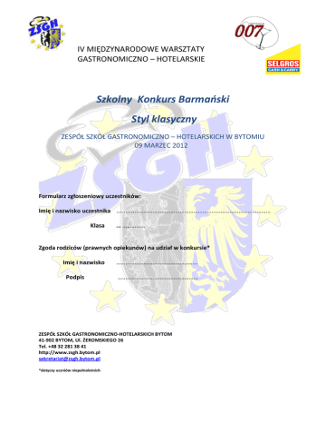 IV MIĘDZYNARODOWE WARSZTATY GASTRONOMICZNO – HOTELARSKIE Szkolny Konkurs Barmański Styl klasyczny ZESPÓŁ SZKÓŁ GASTRONOMICZNO – HOTELARSKICH W BYTOMIU 09 MARZEC 2012 Formularz zgłoszeniowy uczestników: Imię i nazwisko uczestnika ………………………………………………………………………………………… Klasa … …………… Zgoda rodziców (prawnych opiekunów) na udział w konkursie* Imię i nazwisko Podpis ………………………………………........ …………………………………………….. ZESPÓŁ SZKÓŁ GASTRONOMICZNO-HOTELARSKICH BYTOM 41-902 BYTOM, Ul. ŻEROMSKIEGO 26 Tel. +48 32 281 38 41 http://www.zsgh.bytom.pl [email protected] *dotyczy uczniów niepełnoletnich
