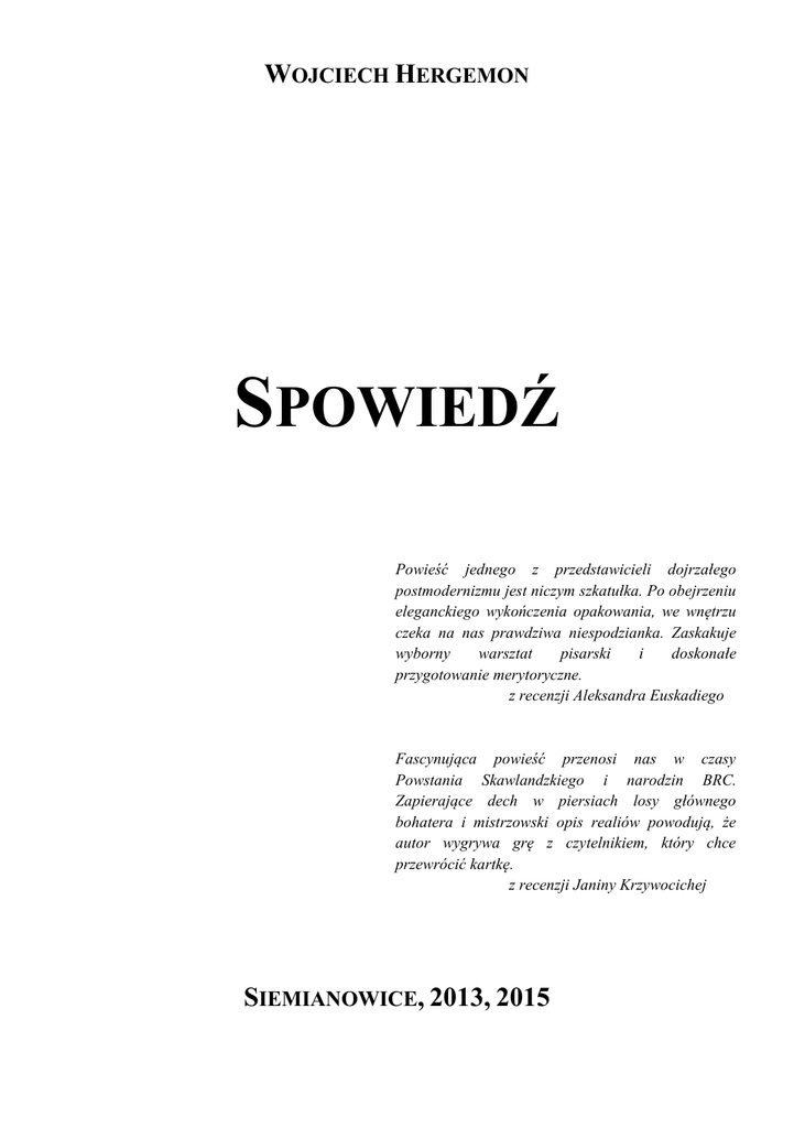 WOJCIECH HERGEMON SPOWIEDŹ Powieść jednego z przedstawicieli dojrzałego postmodernizmu jest niczym szkatułka. Po obejrzeniu eleganckiego wykończenia opakowania, we wnętrzu czeka na nas prawdziwa niespodzianka. Zaskakuje wyborny warsztat pisarski i doskonałe przygotowanie merytoryczne. z recenzji Aleksandra Euskadiego Fascynująca powieść przenosi nas w czasy Powstania Skawlandzkiego i narodzin BRC. Zapierające dech w piersiach losy głównego bohatera i mistrzowski opis realiów powodują, że autor wygrywa grę z czytelnikiem, który chce przewrócić kartkę. z recenzji Janiny Krzywocichej SIEMIANOWICE, 2013, 2015 2|Strona Autobiografia – kartki z pamiętnika Tak, tak, to właśnie ja stałem wtedy w tłumie skandując „precz z panami i bananową młodzieżą”. Nie, żebych lubił Surmeńczyków, którzy stali na podwyższeniu i gorąco zachęcali do wzięcia sprawy w swoje ręce. W zasadzie to nawet trochę ich nie lubiłem, ale tych wszystkich właścicieli, intelektualistów i bananowej młodzieży to ja nie znosiłem szczerze. Najbardziej wkurwiały mnie wykształciuchy, zwłaszcza że często zarzucali mi brak jakiegokolwiek wykształcenia. A to nie była prawda, bo skończyłem siedem klas podstawówki (w tym trzecią dwa razy) i moje siedem klas wartało więcej niż te ich magistry i doktoraty załatwione przez mamusie i tatusiów, bo co też oni wiedzieli o życiu? Nic. W przeciwieństwie do nich, ja zawsze brałem życie w swoje ręce, kiedy oni bezmyślnie czytali bezsensowne podręczniki ja pracowałem już w tartaku i potajemnie szkoliłem się na cieślę okrętowego (tworząc modele z trocin i innych resztek), aż w końcu znałem się na budowie statków chyba najlepiej w całej wsi. Wtedy też poszłem do właściciela, oczekując że zatrudni mnie zgodnie z moją wiedzą i umiejętnościami. Do dziś pamiętam jak ta gruba spasiona świnia, nawet nie spoglądając na mnie zza gazety powiedziała mi, że przecież w promieniu setek kilometrów nie ma żadnego morza i że mam wracać do rąbania drewna, bo to wychodzi mnie znacznie lepiej niż myślenie. Gówno mnie to obchodzi, że Ciprofloksja nie miała i nie ma morza, to wina nieudolnych rządów, a nie moja. Chciałem budować statki i taką zgodną z moją wiedzą pracę, powinni mi byli dać. No bo po to chyba te rządy są, tak se myślę. Nic więc dziwnego, że z radością przyłączyłem się do surmeńskich soldatów, pięknie opowiadających o solidarności i wspólnym dobrze. Tak właśnie powinno być, rząd powinien zarządzać naszym wspólnym wszystkim, a każdy powinien mieć tylko tyle ile potrzebuje. Pierwszy zginął rządca folwarku, który w swojej głupocie chciał z nami rozmawiać. Przypomniało mi się wtedy, jak kiedyś strzelił mnie batem przez pysk, tylko za to, że nie ściągnąłem czapki, kiedy obok przejeżdżała kareta jaśnie panów nierobów. Oż, ty skurwysynu myślałem tłukąc go z innymi sztachetą. Nie tylko jego chcieliśmy zatłuc, bo na pieńku mieliśmy zwłaszcza z jaśnie państwem. Niestety, jaśnie państwo tchórzliwe zwiało, zostawiając dwór i folwark. Surmeńscy żołnierze przekonali nas jednak, że lepiej będzie jeżeli oni sprawiedliwie podzielą miedzy nami pozostawione tam dobra. Dostałem później święty obrazek i pierzową poduszkę, niestety śmierdzącą kocim moczem. Ale inni też dostali podobnie, także podział musiał być sprawiedliwy. 3|Strona W każdym razie, dzień po wygonieniu panów wszyscy zebrali się pod głównym magazynem, na którego ścianie Surmeńczycy wymalowali nowe prawa, tj. m.in. że brak jest własności prywatnej, a także, że wszelkie jedzenie należy niszczyć, a pod karą śmierci zabronione jest jego spożycie. Podobno powstał też nowy chłopsko-robotniczy rząd pod przywództwem Eleny Petrescu. Jako, że Surmeńczykom bardzo podobało się, jak tłukłem zarządcę folwarku mianowali mnie ludowym komisarzem na całą wieś, surmeński pułkownik nakazał mi produkcję broni, a także przekazywanie wszelkich produktów spożywczych wojsku, w celu wywiezienia i zniszczenia go w ustronnym miejscu. Wojsko zabrało też ze sobą wszelkie bydło i zapasy, aby wypuścić je na pustych, niezaludnionych łąkach. Natomiast w końcu doceniony ja, jak tylko wyjechali, wprowadziłem w życie nowy plan zarzadzania folwarkiem. Zakazałem produkcji różnych burżuazyjnych dupereli, a wszystkich zdolnych do pracy zagospodarowałem przy budowie trójmasztowego bojowego żaglowca. Projekt był oczywiście mojego autorstwa, zawsze lubiłem rysować. Musiałem też pilnować przestrzegania naszych nowych, prawdziwych praw. Już pierwszego tygodnia wielką przykrość sprawił mi stolarz, u którego w domu straże znalazły pół bochenka chleba i plaster szynki. Oczywiście, pomimo zakazu każdy trochę podjadał, ale potajemnie i chyba wszyscy wierzyliśmy, że stopniowo rezygnując z jedzenia w końcu oduczymy się tego pańskiego nawyku. W każdym razie nakazałem stolarza związać i wraz z jedzeniem wrzucić do rzeki. Odbiło się to negatywnie na konstrukcji okrętu, bo nikt poza nim nie potrafił robić desek. Na szczęście i tym razem wykazałem się wyjątkowym sprytem – nakazałem rozebrać cały dach magazynu, w którym armia zostawiła amunicję i proch. Przecież z powietrza by i tak nikt tego nie ukradł. Tydzień później okazało się, jak bardzo myliłem się w stosunku do surmeńskich wojskowych. Wracające wojsko oskarżyło mnie o sabotaż produkcji oraz pozbawienie zmagazynowanego u nas prochu, który rzekomo zamókł. Na moją propozycję, żeby zapalić w koło beczek ogniska i czekać aż wyschnie pułkownik strzelił mnie w pysk, kazał zamknąć w wychodku i nazajutrz rozstrzelać. Wtedy dopiero załapałem, że niczym nie różni się on od ciprofloksjańskiego jaśnie państwa, zajadającego się ananasami i innymi słodkościami, na które ja całe dnie pracowałem. 4|Strona Ostat