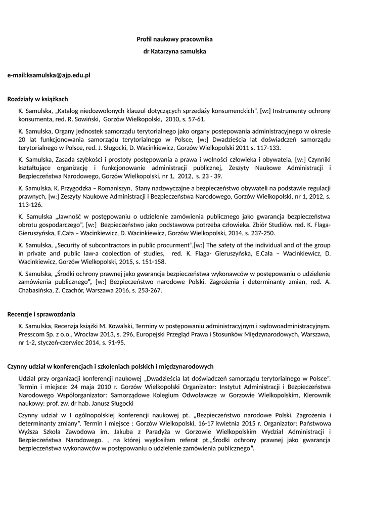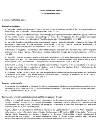 Profil naukowy pracownika dr Katarzyna samulska e-mail:[email protected] Rozdziały w książkach K. Samulska, „Katalog niedozwolonych klauzul dotyczących sprzedaży konsumenckich”, [w:] Instrumenty ochrony konsumenta, red. R. Sowiński, Gorzów Wielkopolski, 2010, s. 57-61. K. Samulska, Organy jednostek samorządu terytorialnego jako organy postepowania administracyjnego w okresie 20 lat funkcjonowania samorządu terytorialnego w Polsce, [w:] Dwadzieścia lat doświadczeń samorządu terytorialnego w Polsce, red. J. Sługocki, D. Wacinkiewicz, Gorzów Wielkopolski 2011 s. 117-133. K. Samulska, Zasada szybkości i prostoty postępowania a prawa i wolności człowieka i obywatela, [w:] Czynniki kształtujące organizację i funkcjonowanie administracji publicznej, Zeszyty Naukowe Administracji i Bezpieczeństwa Narodowego, Gorzów Wielkopolski, nr 1, 2012, s. 23 - 39. K. Samulska, K. Przygodzka – Romaniszyn, Stany nadzwyczajne a bezpieczeństwo obywateli na podstawie regulacji prawnych, [w:] Zeszyty Naukowe Administracji i Bezpieczeństwa Narodowego, Gorzów Wielkopolski, nr 1, 2012, s. 113-126. K. Samulska „Jawność w postępowaniu o udzielenie zamówienia publicznego jako gwarancja bezpieczeństwa obrotu gospodarczego”, [w:] Bezpieczeństwo jako podstawowa potrzeba człowieka. Zbiór Studiów. red. K. FlagaGieruszyńska, E.Cała – Wacinkiewicz, D. Wacinkiewicz, Gorzów Wielkopolski, 2014, s. 237-250. K. Samulska, „Security of subcontractors in public procurment”,[w:] The safety of the individual and of the group in private and public law-a coolection of studies, red. K. Flaga- Gieruszyńska, E.Cała – Wacinkiewicz, D. Wacinkiewicz, Gorzów Wielkopolski, 2015, s. 151-158. K. Samulska, „Środki ochrony prawnej jako gwarancja bezpieczeństwa wykonawców w postępowaniu o udzielenie zamówienia publicznego”, [w:] Bezpieczeństwo narodowe Polski. Zagrożenia i determinanty zmian, red. A. Chabasińska, Z. Czachór, Warszawa 2016, s. 253-267. Recenzje i sprawozdania K. Samulska, Recenzja książki M. Kowalski, Terminy w postępowaniu administracyjnym i sądowoadministracyjnym. Presscom Sp. z o.o., Wrocław 2013, s. 296, Europejski Przegląd Prawa i Stosunków Międzynarodowych, Warszawa, nr 1-2, styczeń-czerwiec 2014, s. 91-95. Czynny udział w konferencjach i szkoleniach polskich i międzynarodowych Udział przy organizacji konferencji naukowej „Dwadzieścia lat doświadczeń samorządu terytorialnego w Polsce”. Termin i miejsce: 24 maja 2010 r. Gorzów Wielkopolski Organizator: Instytut Administracji i Bezpieczeństwa Narodowego Współorganizator: Samorządowe Kolegium Odwoławcze w Gorzowie Wielkopolskim, Kierownik naukowy: prof. zw. dr hab. Janusz Sługocki Czynny udział w I ogólnopolskiej konferencji naukowej pt. „Bezpieczeństwo narodowe Polski. Zagrożenia i determinanty zmiany”. Termin i miejsce : Gorzów Wielkopolski, 16-17 kwietnia 2015 r. Organizator: Państwowa Wyższa Szkoła Zawodowa im. Jakuba z Paradyża w Gorzowie Wielkopolskim Wydział Administracji i Bezpieczeństwa Narodowego. , na której wygłosiłam referat pt.„Środki ochrony prawnej jako gwarancja bezpieczeństwa wykonawców w postępowaniu o udzielenie zamówienia publicznego”. Wyróżnienia Rozprawa doktorska pt. Zasada szybkości postępowania administracyjnego w prawie polskim, została uznana za wyróżniającą na mocy uchwały nr 95/2015/2016 Rady Wydziału i Administracji Uniwersytetu Szczecińskiego z dnia 20 maja 2016 r. …………………………………………… podpis pracownika