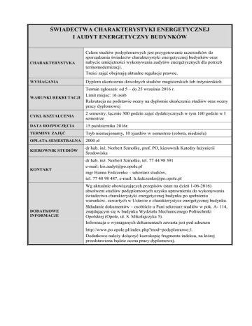 ŚWIADECTWA CHARAKTERYSTYKI ENERGETYCZNEJ I AUDYT ENERGETYCZNY BUDYNKÓW CHARAKTERYSTYKA Celem studiów podyplomowych jest przygotowanie uczestników do sporządzania świadectw charakterystyki energetycznej budynków oraz nabycie umiejętności wykonywania audytów energetycznych dla potrzeb termomodernizacji. Treści zajęć obejmują aktualne regulacje prawne. WYMAGANIA Dyplom ukończenia dowolnych studiów magisterskich lub inżynierskich WARUNKI REKRUTACJI Termin zgłoszeń: od 5 – do 25 września 2016 r. Limit miejsc: 16 osób Rekrutacja na podstawie oceny na dyplomie ukończenia studiów oraz oceny pracy dyplomowej CYKL KSZTAŁCENIA 2 semestry; łącznie 300 godzin zajęć dydaktycznych w tym 160 godzin w I semestrze DATA ROZPOCZĘCIA 15 października 2016r. TERMINY ZAJĘĆ Tryb niestacjonarny, 10 zjazdów w semestrze (sobota, niedziela) OPŁATA SEMESTRALNA 2000 zł KIEROWNIK STUDIÓW dr hab. inż. Norbert Szmolke, prof. PO, kierownik Katedry Inżynierii Środowiska KONTAKT dr hab. inż. Norbert Szmolke, tel. 77 44 98 391 e-mail: [email protected] mgr Hanna Fedczenko – sekretarz studiów, tel. 77 48 98 487, e-mail: [email protected] DODATKOWE INFORMACJE Wg aktualnie obowiązujących przepisów (stan na dzień 1-06-2016) absolwent studiów podyplomowych uzyska uprawnienia do wykonywania świadectwa charakterystyki energetycznej budynku po spełnieniu warunków, zawartych w Ustawie o charakterystyce energetycznej budynku. Składanie dokumentów – osobiście u Pani sekretarz studiów w pok. A- 114, znajdującym się w budynku Wydziału Mechanicznego Politechniki Opolskiej (Opole, ul. S. Mikołajczyka 5). Informacja o wymaganych dokumentach zawarta jest pod adresem http://www.po.opole.pl/index.php?mod=podyplomowe;1. Dodatkowo należy dołączyć kserokopię fragmentu indeksu, na której przedstawiona będzie ocena pracy dyplomowej.
