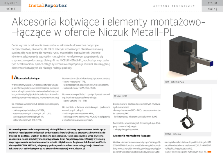 01/2017 a r t y k u ł HOME t e c h n i c z n y s tr. 34 dalej Akcesoria kotwiące i elementy montażowo-łączące w ofercie Niczuk Metall-PL Coraz wyższe oczekiwania inwestorów w sektorze budownictwa dotyczące bezpieczeństwa, ekonomii, ale także estetyki wznoszonych obiektów stanowią swoistą siłę napędową dla rozwoju rynku materiałów budowlanych. Obecnie klientom zależy przede wszystkim na szybkim i komfortowym zaopatrzeniu się u sprawdzonego dostawcy, dlatego firma NICZUK METALL-PL, wychodząc naprzeciw tym oczekiwaniom, oprócz całego systemu zawiesi proponuje również szeroką gamę elementów kotwiących do różnego rodzaju podłoży. Akcesoria kotwiące W ofercie firmy w dziale „Akcesoria kotwiące” znajdują się informacje dotyczące przeznaczenia, rozmiarów kotew, ich wytrzymałości w zależności od rodzaju podłoża, minimalnych głębokości kotwienia, a także wskazówki i parametry montażu (np. moment dokręcania). Do montażu w betonie lub żelbecie proponujemy stosowanie: - tulei rozprężnych stalowych TRSA, - kotew rozporowych stalowych ULT i ULS, - tulei rozprężnych mosiężnych TR, - kotew chemicznych ZKC + PKC. Do montażu w płytach kanałowych przeznaczone są: - kotwy rozporowe TTRB, - tulei rozprężnych stalowych TRSK (z kołnierzem), - śrub do betonu TSMW, TSM, TSMK. Do montażu w podłożach z pustymi przestrzeniami (np. blacha trapezowa) firma oferuje: - kotwy uchylne TRV i TRP. Do montażu w betonie komórkowym i podłożach ceramicznych pełnych: - kołki rozporowe metalowe KRM, - kołki rozporowe z tworzywa KR, KRG w połączeniu z wkrętami dwugwintowymi WK. W ramach poszerzania kompleksowej obsługi klienta, możemy zaproponować dobór optymalnych rozwiązań technicznych podwieszenia instalacji wraz z propozycją kotwienia adekwatną do podłoża, w jakim będzie ono zamocowane. Takie opracowanie wraz z wyceną, w oparciu o nasze produkty może przygotować Dział Projektowy. Specyfikację wyjściową do przygotowania zestawienia można ustalić z Opiekunami Regionów lub Doradcami Technicznymi NICZUK METALL, obejmującymi swym działaniem teren całego kraju. Dane kontaktowe tych osób dostępne są na stronie internetowej www.niczuk.pl. TSM – schemat A2,0 Montaż NZ-10 Do montażu w podłożach ceramicznych murowanych z otworami: - kotwy chemiczne ZKC + PKC z zastosowaniem tulei siatkowej TKC, - kołki ramowe z wkrętem sześciokątnym (KRK). Do montażu w konstrukcjach drewnianych (np. dźwigary z drewna klejonego): - wkręty dwugwintowe WK. Akcesoria montażowo-łączące W dziale „Akcesoria montażowo-łączące” katalogu NICZUK METALL-PL można znaleźć elementy, które umożliwią montaż kanałów wentylacyjnych czy rurociągów do konstrukcji stalowej obiektu budowlanego. Są to : TSMW – schemat - klamry żeliwne lub stalowe do profili hutniczych KLM, - zaciski nośne żeliwne i stalowe KLZ, KLP, HKH i ZNP, - nakładki zabezpieczające NZ, - klamry żeliwne do profili hutniczych (KLM-M).