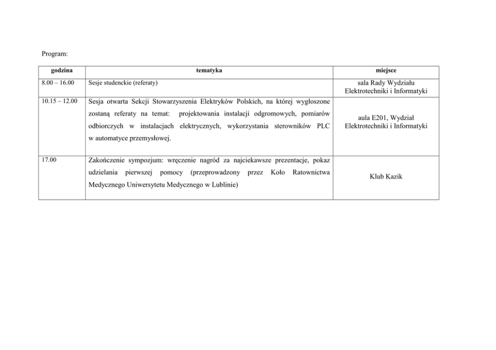 Program: godzina tematyka miejsce 8.00 – 16.00 Sesje studenckie (referaty) 10.15 – 12.00 Sesja otwarta Sekcji Stowarzyszenia Elektryków Polskich, na której wygłoszone sala Rady Wydziału Elektrotechniki i Informatyki zostaną referaty na temat: projektowania instalacji odgromowych, pomiarów odbiorczych w instalacjach elektrycznych, wykorzystania sterowników PLC aula E201, Wydział Elektrotechniki i Informatyki w automatyce przemysłowej. 17.00 Zakończenie sympozjum: wręczenie nagród za najciekawsze prezentacje, pokaz udzielania pierwszej pomocy (przeprowadzony Medycznego Uniwersytetu Medycznego w Lublinie) przez Koło Ratownictwa Klub Kazik