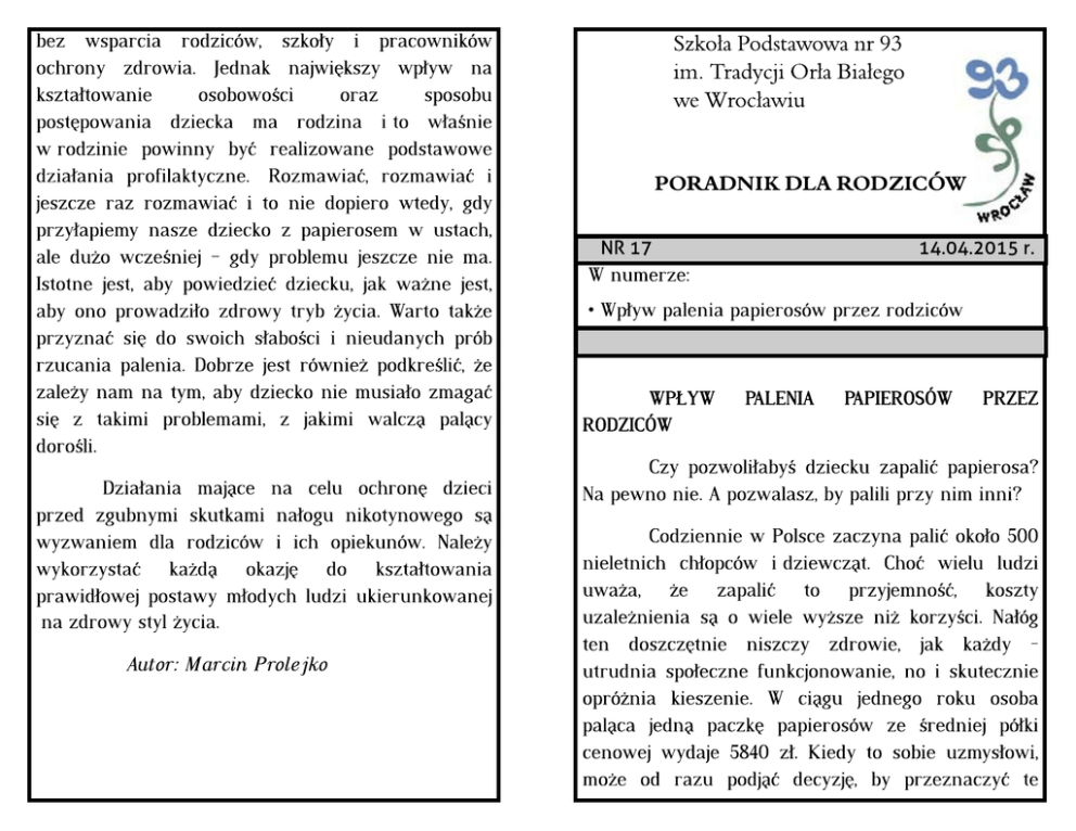 bez wspar cia r odziców, szko?y i pr acowników ochr ony zdr owia. Jednak najwi?kszy wp?yw na kszta?towanie osobowo?ci or az sposobu post?powania dziecka ma r odzina i to w?a?nie w r odzinie powinny by? r ealizowane podstawowe dzia?ania pr ofilaktyczne. Rozmawia?, r ozmawia? i jeszcze r az r ozmawia? i to nie dopier o wtedy, gdy pr zy?apiemy nasze dziecko z papier osem w ustach, ale du?o wcze?niej ? gdy pr oblemu jeszcze nie ma. Istotne jest, aby powiedzie? dziecku, jak wa?ne jest, aby ono pr owadzi?o zdr owy tr yb ?ycia. War to tak?e pr zyzna? si? do swoich s?abo?ci i nieudanych pr ób r zucania palenia. Dobr ze jest r ównie? podkr e?li?, ?e zale?y nam na tym, aby dziecko nie musia?o zmaga? si? z takimi pr oblemami, z jakimi walcz? pal?cy dor o?li. Dzia?ania maj?ce na celu ochr on? dzieci pr zed zgubnymi skutkami na?ogu nikotynowego s? wyzwaniem dla r odziców i ich opiekunów. Nale?y wykor zysta? ka?d? okazj? do kszta?towania pr awid?owej postawy m?odych ludzi ukier unkowanej na zdr owy styl ?ycia. Aut or : Mar cin Prol ej ko Szko?a Podstawowa nr 93 im. Tradycji O r?a Bia?ego we Wroc?awiu POR AD N I K D LA ROD Z I CÓW NR 17 W numer ze: 14.04.2015 r. - Wp?yw palenia papier osów pr zez r odziców WP?YW RODZICÓW PALENIA PAPIEROSÓW PRZEZ Czy pozwoli?aby? dziecku zapali? papier osa? Na pewno nie. A pozwalasz, by palili pr zy nim inni? Codziennie w Polsce zaczyna pali? oko?o 500 nieletnich ch?opców i dziewcz?t. Cho? wielu ludzi uwa?a, ?e zapali? to pr zyjemno??, koszty uzale?nienia s? o wiele wy?sze ni? kor zy?ci. Na?óg ten doszcz?tnie niszczy zdr owie, jak ka?dy utr udnia spo?eczne funkcjonowanie, no i skutecznie opr ó?nia kieszenie. W ci?gu jednego r oku osoba pal?ca jedn? paczk? papier osów ze ?r edniej pó?ki cenowej wydaje 5840 z?. Kiedy to sobie uzmys?owi, mo?e od r azu podj?? decyzj?, by pr zeznaczy? te pieni?dze na co? innego, a tym samym po?egna? si? z paleniem. Dziecko, któr ego r odzice pal? pr zy nim w domu, bez w?tpienia staje si? bier nym palaczem. Skutkiem jest nie tylko obni?ona odpor no??, pojawienie si? dolegliwo?ci ze str ony uk?adu oddechowego. Wdychana nikotyna wp?ywa tak?e na obni?enie poziomu zdolno?ci poznawczych u dzieci i m?odzie?y. Poza tym, palenie pr zez osoby dor os?e z otoczenia dziecka wp?ywa na kszta?towanie si? postaw i zachowa? wobec substancji uzale?niaj?cych u dzieci w pr zysz?o?ci. Rodzice, któr zy sami pal?, zw?aszcza pr zy dzieciach w domu, tr ac? wiar ygodno??. Tr udno ?ywi? oczekiwanie, ?e dziecko nie b?dzie pali?o papier osów, skor o jego matka czy ojciec lub te? oboje wychowuj? je w atmosfer ze pr zyzwolenia. Ojciec, któr y jest autor ytetem i wzor em dla syna mo?e wyr obi? w swoim dziecku nawyk palenia. Podobnie - matka w stosunku do swojej cór ki. Obser wacja r odziców-palaczy wp?ywa na postaw? dziecka, któr e uczy si? popr zez modelowanie. Jest ono bar dziej sk?onne do si?gania po papier osy du?o wcze?niej ni? jego r ówie?nicy i ?atwiej uzale?nia si? od nikotyny. Badania jednoznacznie wskazuj?, ?e pr awdopodobie?stwo palenia tytoniu wzr asta wtedy, gdy pal? sami r odzice lub star sze r odze?stwo, jak r ównie? wtedy, gdy postawa dor os?ych wskazuje na pr zejawy toler ancji wobec na?ogowych zachowa? w?asnego potomstwa. Czy tego chcemy, czy nie - dziecko uczy si? g?ównie dzi?ki temu, co widzi, a nie dzi?ki temu, co s?yszy. Zatem je?li pomi?dzy naszymi s?owami a zachowaniem jest r ozbie?no?? ? wi?ksz? wag? nasze pociechy b?d? pr zywi?zywa?y do tego, co widz?. Pal?cy ojciec czy matka, któr zy daj? swojemu dziecku 'kazanie' na temat szkodliwo?ci palenia, mo?e spotka? si? z lekcewa?eniem ze str ony nastolatka. Opr ócz szkodliwo?ci dla zdr owia dzieci palenia czynnego, tr zeba pami?ta? o r ównie szkodliwym wp?ywie na or ganizm palenia bier nego. Nie ryzykuj! Dziecko nie powinno mie? w ogóle kontaktu z dymem papier osowym. Jest bar dziej wr a?liwe na dzia?anie zawar tych w dymie tr ucizn ni? dor os?y. Szacunkowo w Polsce oko?o 3 mln dzieci to bier ni palacze. Boczny str umie? dymu tytoniowego zawier a 35 r azy wi?cej dwutlenku w?gla i 4 r azy wi?cej nikotyny ni? dym wdychany pr zez aktywnych palaczy. Zawier a on r ównie? wiele substancji aler gizuj?cych, powoduj?cych ?zawienie oczu, kaszel, nawr acaj?ce infekcje dr óg oddechowych. Bier ne palenie powoduje niemal takie same skutki zdr owotne jak palenie aktywne. Co mo?na zatem zr obi?? Skutecznej pr ofilaktyki nie sposób r ealizowa?