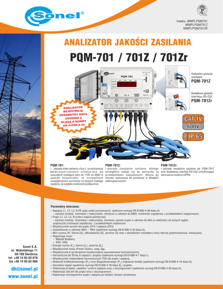 Indeks: WMPLPQM701 WMPLPQM701Z WMPLPQM701ZR ANALIZATOR JAKOŚCI ZASILANIA PQM-701 / 701Z / 701Zr Oddzielne gniazdo zasilające PQM-701Z Dodatkowe gniazdo interfejsu RS-232 PQM-701Zr ANALIZATOR REJESTRUJE PARAMETRY SIECI ZGODNIE Z KLASĄ A NORMY EN 61000-4-30 IP 65 PQM-701: PQM-701Z: ! posiada stałe zasilanie z fazy L i przeznaczony jest do w y k o r z y s t a n i a p r a k t y c z n i e w e wszystkich rodzajach sieci od 110V do 690V w sposób bezpośredni, ze szczególnym uwzględnieniem pomiarów na słupach niskiego napięcia, ze względu na łatwość podłączenia. ! posiada niezależne zasilanie, dlatego ! posiada niezależne zasilanie jak PQM-701Z szczególnie nadaje się do pomiarów za oraz dodatkowy interfejs RS-232 umożliwiający przekładnikami napięciowymi. Można go sterowanie modemu GPRS również zastosować do pomiarów w układach stałonapięciowych. PQM-701Zr: Parametry mierzone: Sonel S.A. ul. Wokulskiego 11 58-100 Świdnica tel. +48 74 85 83 878 fax +48 74 85 83 808 [email protected] www.sonel.pl · Napięcia L1, L2, L3, N-PE (pięć wejść pomiarowych, spełnione wymogi EN 61000-4-30 klasa A) – wartości średnie, minimalne i maksymalne, chwilowe w zakresie do 690V, możliwość współpracy z przekładnikami napięciowymi, · Prądy L1, L2, L3, N (cztery wejścia pomiarowe) – wartości średnie, minimalne i maksymalne, chwilowe, pomiar prądu w zakresie do 3kA (w zależności od użytych cęgów prądowych),możliwość współpracy z przekładnikami prądowymi, · Współczynniki szczytu dla prądu (CFI) i napięcia (CFU), · Częstotliwość w zakresie 40Hz – 70Hz (spełnione wymogi EN 61000-4-30 klasa A), · Moc czynna (P), bierna (Q), odkształcenia (D), pozorna (S) wraz z określeniem charakteru mocy biernej (pojemnościowa, indukcyjna), · Rejestracja mocy: – Metoda Budeanu, – IEEE 1459, · Energia czynna (EP), bierna (Eq), pozorna (ES), · Współczynnik mocy (Power Factor), cosφ, tgφ, · Współczynnik K (przeciążenie transformatora spowodowane harmonicznymi), · Harmoniczne do 50-tej w napięciu i prądzie (spełnione wymogi EN 61000-4-7 klasa I), · Współczynnik zniekształceń harmonicznych THD dla prądu i napięcia, · Wskaznik krótkookresowego (PST) oraz długookresowego (PLT) migotania światła (spełnione wymogi EN 61000-4-15 klasa A), · Asymetria napięć (spełnione wymogi EN 61000-4-30 klasa A) i prądów, · Rejestracja przepięć, zapadów i przerw napięcia wraz z oscylogramami (spełnione wymogi EN 61000-4-30 klasa A), · Rejestracja zdarzeń dla prądu wraz z oscylogramami, · Rejestracja oscylogramów prądu i napięcia po każdym okresie uśredniania. Analizator jakości zasilania PQM-701 / 701Z / 701Zr Przyrząd przewidziany jest do pracy w sieciach: Układy obsługiwanych sieci: · o częstotliwości znamionowej 50/60Hz. · o napięciach znamionowych: 110/190V; 115/200V; 127/220V; 220/380V; 230/400V; 240/415V; 254/440V; 400/690V. · jednofazowy, · dwufazowy ze wspólnym N, · trójfazowy gwiazda z i bez przewodu N, · trójfazowy trójkąt. Parametry analizatora PQM-701: Zakres pomiarowy Maks. rozdzielczość Błąd podstawowy Napięcie przemienne (TRMS) Parametr — 0,0…690,0V 0,01 % Un ±0,1% Un Współczynnik Napięcie 1,00…10,00 (≤1,65 dla napięcia 690V) 0,01 ±5% szczytu (Crest Factor) Prąd 1,00…10,00 (≤3,6 Inom) 0,01 ± 5% w.m. — w zależności od cęgów* 0,01 % zakresu nominalnego Prąd przemienny TRMS Częstotliwość Moc czynna,bierna, pozorna i odkształcenia Energia czynna bierna i pozorna — — — ±0,1% zakresu nominalnego (błąd nie uwzględnia błędu cęgów) 40,00...70,00 Hz 0,01Hz ±0,01 Hz w zależności od konfiguracji do czterech w zależności od konfiguracji (przekładniki, cęgi) (przekładniki, cęgi) miejsc po przecinku w zależności od konfiguracji do czterech (przekładniki, cęgi) miejsc po przecinku jak błąd mocy Cosφ i współczynnik mocy (PF) — 0,00...1,00 0,01 ±0,03 Tgφ — 0,00...10,00 0,01 zależy od błędu mocy czynnej i biernej Napięcie taki sam jak napięcia przemiennego taka sama jak napięcia ±5% Uh dla Uh<1% Un True RMS przemiennego True RMS ±0,05% Un dla Uh<1% Un Harmoniczne Prąd THD Moc czynna i bierna harmonicznych Kąt pomiędzy harmonicznymi prądu i napięcia taki sam jak prądu przemiennego taka sama jak prądu ± 5% Ih dla Ih<3% In True RMS przemiennego True RMS ± 0,15% In dla Ih<3% In ±5% Napięcie 0,0..100,0% Prąd (względem wartości skutecznej) — — 0,1% zależna od wartości (przekładniki, cęgi) minimalnych prądu i napięcia -180,0…+180,0° 0,1° ±(h x 1°) ±10% Współczynnik K (K-Factor) — 1,0...50,0 0,1 Wskaźnik migotania światła (flicker) — 0,20...10,00 0,01 Asymetria napięcia Napięcie oraz prąd ±5% w zależności od konfiguracji — ±5% ±0,15% 0,1% 0,0...20,0% (błąd bezwzględny) *Cęgi F-1, F-2, F-3:0..3000A (10000Ap-p) *Cęgi C-4: 0..1000A (3600Ap-p)*Cęgi C-5: 0..1000A (3600Ap-p)*Cęgi C-6: 0..10A (36Ap-p) (bez przekładników prądowych) Wyposażenie standardowe analizatorów PQM-701 / 701Z / 701Zr: - przewód 2.2m czarny zakończony wtykami bananowymi (PQM-701 - 3 szt, PQM-701Z - 4 szt.), - przewód 2.2m żółty zakończony wtykami bananowymi, - przewód 2.2m niebieski zakończony wtykami bananowymi (PQM-701 - 1 szt, PQM-701Z - 2 szt.) - przewód RS-232 do podłączenia modemu GPRS (PQM-701Zr) - krokodylek czarny K01 (PQM-701 - 3 szt, PQM-701Z - 4 szt.), - krokodylek żółty K02, - krokodylek niebieski K02 (PQM-701 - 1 szt, PQM-701Z - 2 szt.), - przewód do transmisji danych USB, WAPRZ2X2BLBB - wtyk sieciowy z wej. bananowymi (L1 oraz N) do zasilania analizatora, WAADAAZ1 - rozdzielacz fazy AC-16 WAADAAC16 WAADAUSBOR1 WAPRZ2X2YEBB - adapter OR-1 - odbiornik USB do transmisji radiowej WAPOZSD1 WAPRZ2X2BUBB - karta SD, - twarda walizka, WAWALXL1 WAPOZOPAKPL WAPRZRS232 - opaska do mocowania na słupie, WAPOZUCH2 WAKROBL20K01 - zaczep do mocowania miernika na szynie DIN (ISO) (2 szt.) WAKROYE20