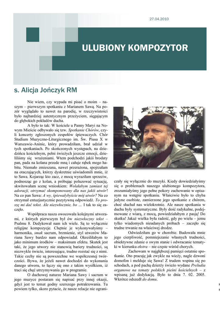 27.04.2010 ULUBIONY KOMPOZYTOR s. Alicja Jończyk RM Nie wiem, czy wypada mi pisać o moim – naszym – pierwszym spotkaniu z Marianem Sawą. Na pozór wyglądało to nawet na parodię, w rzeczywistości było najbardziej autentycznym przeżyciem, sięgającym do głębokich pokładów ducha. A było to tak: W kościele u Panny Maryi na Nowym Mieście odbywało się tzw. Spotkanie Chórów, czyli koncerty zgłoszonych zespołów śpiewaczych. Chór Studium Muzyczno-Liturgicznego im. Św. Piusa X w Warszawie-Aninie, który prowadziłam, brał udział w tych spotkaniach. Po skończonych występach, na dziedzińcu kościelnym, pełni świeżych jeszcze emocji, dzieliliśmy się wrażeniami. Wtem podchodzi jakiś brodaty pan, pada na kolana przede mną i całuje rąbek mego habitu. Niemało zmieszana, nawet przerażona, spojrzałam na otaczających, którzy dyskretnie uświadomili mnie, iż to Sawa. Kojarząc kto zacz, z mocą wyraziłam sprzeciw, podnosząc go z kolan, a próbując poluzować sytuację, skwitowałam scenę wnioskiem: Wolałabym zamiast tej adoracji, otrzymać skomponowany dla nas jakiś utwór! Na co pan Sawa: A wy, śpiewałybyście mój utwór? Na co otrzymał entuzjastycznie pozytywną odpowiedź. To proszę mi dać tekst. Ale niezwłocznie, bo … I tak to się zaczęło. Współpraca nasza owocowała kolejnymi utworami, z których pierwszym był ów niezwłoczny tekst – Psalmu 8. Dedykował nam ich wiele. Są to wyłącznie religijne kompozycje. Chętnie je wykonywałyśmy – harmonika, smak sacrum, brzmienie, styl utworów Mariana Sawy bardzo nam odpowiadał. Określiłabym to jako minimum środków – maksimum efektu. Skutek jest taki, że jego utwory nie stanowią bariery trudności, są niezwykle świeże, interesujące, trudno rozstać się z nimi. Takie cechy nie są powszechne we współczesnej twórczości. Bywa, że jeżeli nawet dochodzi do wykonania danego utworu, to łączy się ono z takim wysiłkiem, iż traci się chęć utrzymywania go w programie. O duchowej naturze Mariana Sawy i sacrum w jego muzyce postaram się napisać przy innej okazji, gdyż jest to temat godny szerszego potraktowania. Tu powiem tylko, skoro pytacie, że nasze relacje nie ograni- czały się wyłącznie do muzyki. Kiedy dowiedziałyśmy się o problemach naszego ulubionego kompozytora, zrozumiałyśmy jego pełne pokory zachowanie w opisanym na wstępie spotkaniu. Właściwie było to chyba jedyne osobiste, zamierzone jego spotkanie z chórem, choć słuchał nas wielokrotnie. Ale nasze spotkania w duchu były systematyczne. Były dość radykalne, podejmowane z wiarą, z mocą, powiedziałabym z pasją! Do skutku! Jakaż wielka była radość, gdy po wielu – jemu tylko wiadomych nieudanych próbach – zaczęło się trudne trwanie na właściwej drodze. Odwiedziłam go w chorobie. Budowała mnie jego cierpliwość, pomniejszanie własnych trudności, obiektywne zdanie o swym stanie i odwracanie tematyki w kierunku ekstra – nie częste wśród chorych. Zachowam w najgłębszej pamięci ostatnie spotkanie. Oto pracuję jak zwykle na wieży, nagle dzwoni domofon i melduje się Sawa! Z trudem wspina się po schodach, a pod pachą dzierży świeżo wydane Preludia organowe na tematy polskich pieśni kościelnych – z wpisaną już dedykacją. Było to dnia 7. 02. 2005. Wkrótce odszedł do domu. s s