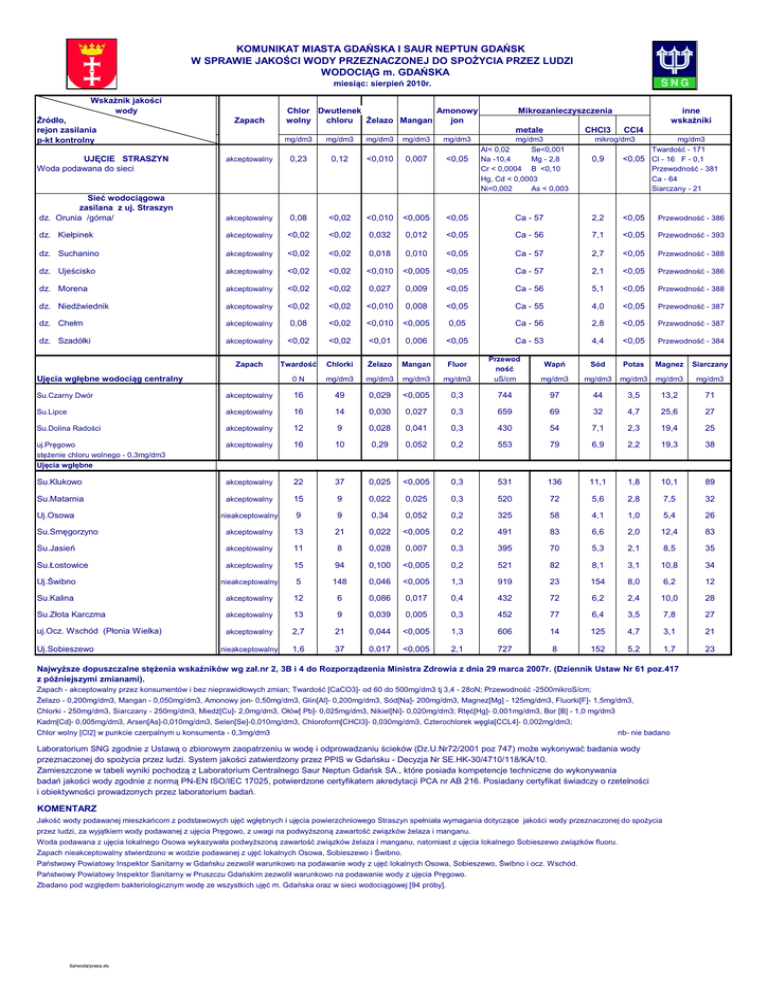 KOMUNIKAT MIASTA GDAŃSKA I SAUR NEPTUN GDAŃSK W SPRAWIE JAKOŚCI WODY PRZEZNACZONEJ DO SPOŻYCIA PRZEZ LUDZI WODOCIĄG m. GDAŃSKA miesiąc: sierpień 2010r. Wskaźnik jakości wody Źródło, rejon zasilania p-kt kontrolny Zapach Chlor Dwutlenek Amonowy wolny chloru Żelazo Mangan jon Mikrozanieczyszczenia metale CHCl3 CCl4 mg/dm3 mg/dm3 mg/dm3 mg/dm3 mg/dm3 akceptowalny 0,23 0,12 <0,010 0,007 <0,05 Sieć wodociągowa zasilana z uj. Straszyn dz. Orunia /górna/ akceptowalny 0,08 <0,02 <0,010 <0,005 <0,05 Ca - 57 2,2 <0,05 Przewodność - 386 dz. Kiełpinek akceptowalny <0,02 <0,02 0,032 0,012 <0,05 Ca - 56 7,1 <0,05 Przewodność - 393 dz. Suchanino akceptowalny <0,02 <0,02 0,018 0,010 <0,05 Ca - 57 2,7 <0,05 Przewodność - 388 dz. Ujeścisko akceptowalny <0,02 <0,02 <0,010 <0,005 <0,05 Ca - 57 2,1 <0,05 Przewodność - 386 dz. Morena akceptowalny <0,02 <0,02 0,027 0,009 <0,05 Ca - 56 5,1 <0,05 Przewodność - 388 dz. Niedźwiednik akceptowalny <0,02 <0,02 <0,010 0,008 <0,05 Ca - 55 4,0 <0,05 Przewodność - 387 dz. Chełm akceptowalny 0,08 <0,02 <0,010 <0,005 0,05 Ca - 56 2,8 <0,05 Przewodność - 387 dz. Szadółki akceptowalny <0,02 <0,02 <0,01 0,006 <0,05 Ca - 53 4,4 <0,05 Przewodność - 384 Zapach Twardość Chlorki Żelazo Mangan Fluor 0N mg/dm3 mg/dm3 mg/dm3 UJĘCIE STRASZYN Woda podawana do sieci Ujęcia wgłębne wodociąg centralny mg/dm3 Al< 0,02 Se<0,001 Na -10,4 Mg - 2,8 Cr < 0,0004 B <0,10 Hg, Cd < 0,0003 Ni<0,002 As < 0,003 inne wskaźniki mikrog/dm3 0,9 mg/dm3 Twardość - 171 <0,05 Cl - 16 F - 0,1 Przewodność - 381 Ca - 64 Siarczany - 21 Wapń Sód Potas Magnez Siarczany mg/dm3 Przewod ność uS/cm mg/dm3 mg/dm3 mg/dm3 mg/dm3 mg/dm3 Su.Czarny Dwór akceptowalny 16 49 0,029 <0,005 0,3 744 97 44 3,5 13,2 71 Su.Lipce akceptowalny 16 14 0,030 0,027 0,3 659 69 32 4,7 25,6 27 Su.Dolina Radości akceptowalny 12 9 0,028 0,041 0,3 430 54 7,1 2,3 19,4 25 uj.Pręgowo stężenie chloru wolnego - 0,3mg/dm3 Ujęcia wgłębne akceptowalny 16 10 0,29 0,052 0,2 553 79 6,9 2,2 19,3 38 Su.Klukowo akceptowalny 22 37 0,025 <0,005 0,3 531 136 11,1 1,8 10,1 89 Su.Matarnia akceptowalny 15 9 0,022 0,025 0,3 520 72 5,6 2,8 7,5 32 nieakceptowalny 9 9 0,34 0,052 0,2 325 58 4,1 1,0 5,4 26 Su.Smęgorzyno akceptowalny 13 21 0,022 <0,005 0,2 491 83 6,6 2,0 12,4 83 Su.Jasień akceptowalny 11 8 0,028 0,007 0,3 395 70 5,3 2,1 8,5 35 Uj.Osowa Su.Łostowice akceptowalny 15 94 0,100 <0,005 0,2 521 82 8,1 3,1 10,8 34 Uj.Świbno nieakceptowalny 5 148 0,046 <0,005 1,3 919 23 154 8,0 6,2 12 Su.Kalina akceptowalny 12 6 0,086 0,017 0,4 432 72 6,2 2,4 10,0 28 Su.Złota Karczma akceptowalny 13 9 0,039 0,005 0,3 452 77 6,4 3,5 7,8 27 uj.Ocz. Wschód (Płonia Wielka) akceptowalny 2,7 21 0,044 <0,005 1,3 606 14 125 4,7 3,1 21 nieakceptowalny 1,6 37 0,017 <0,005 2,1 727 8 152 5,2 1,7 23 Uj.Sobieszewo Najwyższe dopuszczalne stężenia wskaźników wg zał.nr 2, 3B i 4 do Rozporządzenia Ministra Zdrowia z dnia 29 marca 2007r. (Dziennik Ustaw Nr 61 poz.417 z późniejszymi zmianami). Zapach - akceptowalny przez konsumentów i bez nieprawidłowych zmian; Twardość [CaCO3]- od 60 do 500mg/dm3 tj 3,4 - 28oN; Przewodność -2500mikroS/cm; Żelazo - 0,200mg/dm3, Mangan - 0,050mg/dm3, Amonowy jon- 0,50mg/dm3, Glin[Al]- 0,200mg/dm3, Sód[Na]- 200mg/dm3, Magnez[Mg] - 125mg/dm3, Fluorki[F]- 1,5mg/dm3, Chlorki - 250mg/dm3, Siarczany - 250mg/dm3, Miedź[Cu]- 2,0mg/dm3, Ołów[ Pb]- 0,025mg/dm3, Nikiel[Ni]- 0,020mg/dm3; Rtęć[Hg]- 0,001mg/dm3, Bor [B] - 1,0 mg/dm3 Kadm[Cd]- 0,005mg/dm3, Arsen[As]-0,010mg/dm3, Selen[Se]-0,010mg/dm3, Chloroform[CHCl3]- 0,030mg/dm3, Czterochlorek węgla[CCL4]- 0,002mg/dm3; Chlor wolny [Cl2] w punkcie czerpalnym u konsumenta - 0,3mg/dm3 nb- nie badano Laboratorium SNG zgodnie z Ustawą o zbiorowym zaopatrzeniu w wodę i odprowadzaniu ścieków (Dz.U.Nr72/2001 poz 747) może wykonywać badania wody przeznaczonej do spożycia przez ludzi. System jakości zatwierdzony przez PPIS w Gdańsku - Decyzja Nr SE.HK-30/4710/118/KA/10. Zamieszczone w tabeli wyniki pochodzą z Laboratorium Centralnego Saur Neptun Gdańsk SA., które posiada kompetencje techniczne do wykonywania badań jakości wody zgodnie z normą PN-EN ISO/IEC 17025, potwierdzone certyfikatem akredytacji PCA nr AB 216. Posiadany certyfikat świadczy o rzetelności i obiektywności prowadzonych przez laboratorium badań. KOMENTARZ Jakość wody podawanej mieszkańcom z podstawowych ujęć wgłębnych i ujęcia powierzchniowego Straszyn spełniała wymagania dotyczące jakości wody przeznaczonej do spożycia przez ludzi, za wyjątkiem wody podawanej z ujęcia Pręgowo, z uwagi na podwyższoną zawartość związków żelaza i manganu. Woda podawana z ujęcia lokalnego Osowa wykazywała podwyższoną zawartość związków żelaza i manganu, natomiast z ujęcia lokalnego Sobieszewo związków fluoru. Zapach nieakceptowalny stwierdzono w wodzie podawanej z ujęć lokalnych Osowa, Sobieszewo i Świbno. Państwowy Powiatowy Inspektor Sanitarny w Gdańsku zezwolił warunkowo na podawanie wody z ujęć lokalnych Osowa, Sobieszewo, Świbno i ocz. Wschód. Państwowy Powiatowy Inspektor Sanitarny w Pruszczu Gdańskim zezwolił warunkowo na podawanie wody z ujęcia Pręgowo. Zbadano pod względem bakteriologicznym wodę ze wszystkich ujęć m. Gdańska oraz w sieci wodociągowej [94 próby]. tta/woda/prasa.xls