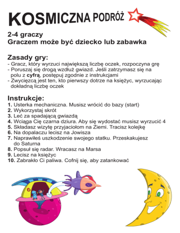 2-4 graczy Graczem mo¿e byæ dziecko lub zabawka Zasady gry: - Gracz, który wyrzuci najwiêksz¹ liczbê oczek, rozpoczyna grê - Poruszaj siê drog¹ wzd³u¿ gwiazd. Jeœli zatrzymasz siê na polu z cyfr¹, postêpuj zgodnie z instrukcjami - Zwyciêzc¹ jest ten, kto pierwszy dotrze na ksiê¿yc, wyrzucaj¹c dok³adn¹ liczbê oczek Instrukcje: 1. Usterka mechaniczna. Musisz wróciæ do bazy (start) 2. Wykorzystaj skrót 3. Leæ za spadaj¹c¹ gwiazd¹ 4. Wci¹ga Ciê czarna dziura. Aby siê wydostaæ musisz wyrzuciæ 4 5. Sk³adasz wizytê przyjacio³om na Ziemi. Tracisz kolejkê 6. Na dopalaczu lecisz na Jowisza 7. Naprawi³eœ uszkodzenie swojego statku. Przeskakujesz do Saturna 8. Popsu³ siê radar. Wracasz na Marsa 9. Lecisz na ksiê¿yc 10. Zabrak³o Ci paliwa. Cofnij siê, aby zatankowaæ