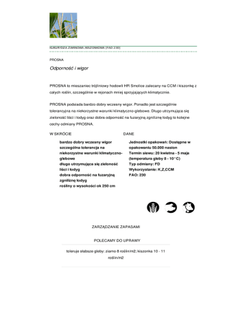 KUKURYDZA ZIARNOWA /KISZONKOWA [FAO 230] PROSNA Odporność i wigor PROSNA to mieszaniec trójliniowy hodowli HR Smolice zalecany na CCM i kiszonkę z całych roślin, szczególnie w rejonach mniej sprzyjających klimatycznie. PROSNA podsiada bardzo dobry wczesny wigor. Ponadto jest szczególnie tolerancyjna na niekorzystne warunki klimatyczno-glebowe. Długo utrzymująca się zieloność liści i łodyg oraz dobra odporność na fuzaryjną zgniliznę łodyg to kolejne cechy odmiany PROSNA. W SKRÓCIE DANE bardzo dobry wczesny wigor Jednostki opakowań: Dostępne w szczególna tolerancja na opakowaniu 50.000 nasion niekorzystne warunki klimatyczno- Termin siewu: 20 kwietna - 5 maja glebowe (temperatura gleby 8 - 10°C) długo utrzymująca się zieloność Typ odmiany: FD liści i łodyg Wykorzystanie: K,Z,CCM dobra odporność na fuzaryjną FAO: 230 zgniliznę łodyg rośliny o wysokości ok 250 cm ZARZĄDZANIE ZAPASAMI POLECAMY DO UPRAWY toleruje słabsze gleby: ziarno 8 roślin/m2; kiszonka 10 - 11 roślin/m2