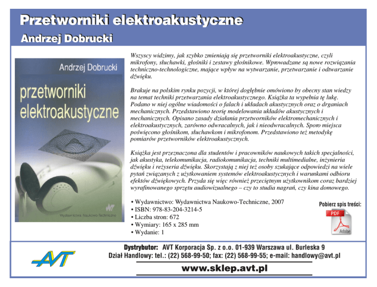 Przetworniki elektroakustyczne Andrzej Dobrucki Wszyscy widzimy, jak szybko zmieniaj¹ siê przetworniki elektroakustyczne, czyli mikrofony, s³uchawki, g³oœniki i zestawy g³oœnikowe. Wprowadzane s¹ nowe rozwi¹zania techniczno-technologiczne, maj¹ce wp³yw na wytwarzanie, przetwarzanie i odtwarzanie dŸwiêku. Brakuje na polskim rynku pozycji, w której dog³êbnie omówiono by obecny stan wiedzy na temat techniki przetwarzania elektroakustycznego. Ksi¹¿ka ta wype³nia tê lukê. Podano w niej ogólne wiadomoœci o falach i uk³adach akustycznych oraz o drganiach mechanicznych. Przedstawiono teoriê modelowania uk³adów akustycznych i mechanicznych. Opisano zasady dzia³ania przetworników elektromechanicznych i elektroakustycznych, zarówno odwracalnych, jak i nieodwracalnych. Sporo miejsca poœwiêcono g³oœnikom, s³uchawkom i mikrofonom. Przedstawiono te¿ metodykê pomiarów przetworników elektroakustycznych. Ksi¹¿ka jest przeznaczona dla studentów i pracowników naukowych takich specjalnoœci, jak akustyka, telekomunikacja, radiokomunikacja, techniki multimedialne, in¿ynieria dŸwiêku i re¿yseria dŸwiêku. Skorzystaj¹ z niej te¿ osoby szukaj¹ce odpowiedzi na wiele pytañ zwi¹zanych z u¿ytkowaniem systemów elektroakustycznych i warunkami odbioru efektów dŸwiêkowych. Przyda siê wiêc równie¿ przeciêtnym u¿ytkownikom coraz bardziej wyrafinowanego sprzêtu audiowizualnego – czy to studia nagrañ, czy kina domowego. • Wydawnictwo: Wydawnictwa Naukowo-Techniczne, 2007 • ISBN: 978-83-204-3214-5 • Liczba stron: 672 • Wymiary: 165 x 285 mm • Wydanie: 1 Pobierz spis treœci: Dystrybutor: AVT Korporacja Sp. z o.o. 01-939 Warszawa ul. Burleska 9 Dzia³ Handlowy: tel.: (22) 568-99-50; fax: (22) 568-99-55; e-mail: [email protected] www.sklep.avt.pl