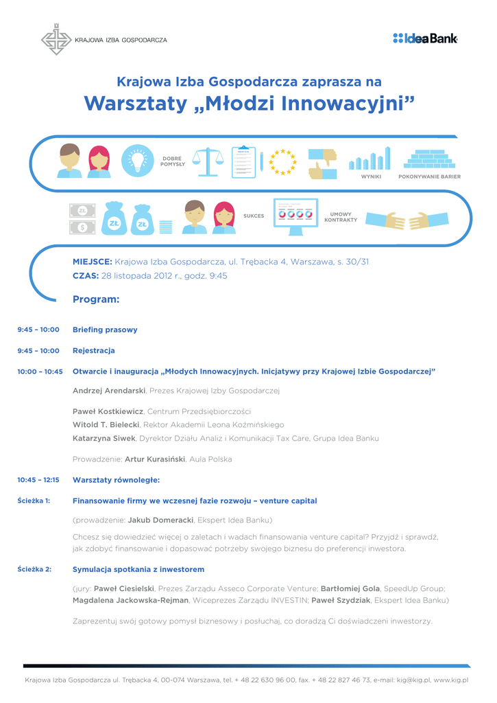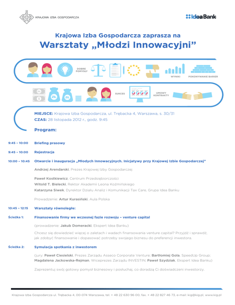 Krajowa Izba Gospodarcza zaprasza na Warsztaty „Młodzi Innowacyjni” DOBRE POMYSŁY 1 2 3 4 5 6 WYNIKI POKONYWANIE BARIER RACHUNKI / FAKTURY BILANSE SUKCES 30% / 40% 10% / 70% 30% / 40% 10% / 70% UMOWY KONTRAKTY MIEJSCE: Krajowa Izba Gospodarcza, ul. Trębacka 4, Warszawa, s. 30/31 CZAS: 28 listopada 2012 r., godz. 9:45 Program: 9:45 – 10:00 Briefing prasowy 9:45 – 10:00 Rejestracja 10:00 – 10:45 Otwarcie i inauguracja „Młodych Innowacyjnych. Inicjatywy przy Krajowej Izbie Gospodarczej” Andrzej Arendarski, Prezes Krajowej Izby Gospodarczej Paweł Kostkiewicz, Centrum Przedsiębiorczości Witold T. Bielecki, Rektor Akademii Leona Koźmińskiego Katarzyna Siwek, Dyrektor Działu Analiz i Komunikacji Tax Care, Grupa Idea Banku Prowadzenie: Artur Kurasiński, Aula Polska 10:45 – 12:15 Warsztaty równoległe: Ścieżka 1: Finansowanie firmy we wczesnej fazie rozwoju – venture capital (prowadzenie: Jakub Domeracki, Ekspert Idea Banku) Chcesz się dowiedzieć więcej o zaletach i wadach finansowania venture capital? Przyjdź i sprawdź, jak zdobyć finansowanie i dopasować potrzeby swojego biznesu do preferencji inwestora. Ścieżka 2: Symulacja spotkania z inwestorem (jury: Paweł Ciesielski, Prezes Zarządu Asseco Corporate Venture; Bartłomiej Gola, SpeedUp Group; Magdalena Jackowska-Rejman, Wiceprezes Zarządu INVESTIN; Paweł Szydziak, Ekspert Idea Banku) Zaprezentuj swój gotowy pomysł biznesowy i posłuchaj, co doradzą Ci doświadczeni inwestorzy. Krajowa Izba Gospodarcza ul. Trębacka 4, 00-074 Warszawa, tel. + 48 22 630 96 00, fax. + 48 22 827 46 73, e-mail: [email protected], www.kig.pl Ścieżka 3: Wizualna komunikacja marki (prowadzenie: Dawid Korzekwa, Prezes Stowarzyszenia Twórców Grafiki Użytkowej) Przyjdź i posłuchaj, jak zaprojektować dobry logotyp i interfejs strony internetowej. Następnie sam zaprezentuj swój gotowy projekt i skonsultuj go ze specjalistą. 12:30 – 13:00 Wykład: Realia zabezpieczania swojego pomysłu (prowadzenie: Paweł Przybyszewski, Kamil Ślesiński, Eksperci INVESTIN) 13:00 – 14:00 Lunch Zgłoszenia wraz z wybraną ścieżką (1, 2 lub 3) prosimy nadsyłać na adres mailowy: [email protected] / Udział jest bezpłatny / Liczba miejsc ograniczona Główny Partner „Młodych Innowacyjnych. Inicjatywy przy Krajowej Izbie Gospodarczej” Partnerzy „Młodych Innowacyjnych. Inicjatywy przy Krajowej Izbie Gospodarczej” Patroni medialni Krajowa Izba Gospodarcza ul. Trębacka 4, 00-074 Warszawa, tel. + 48 22 630 96 00, fax. + 48 22 827 46 73, e-mail: [email protected], www.kig.pl