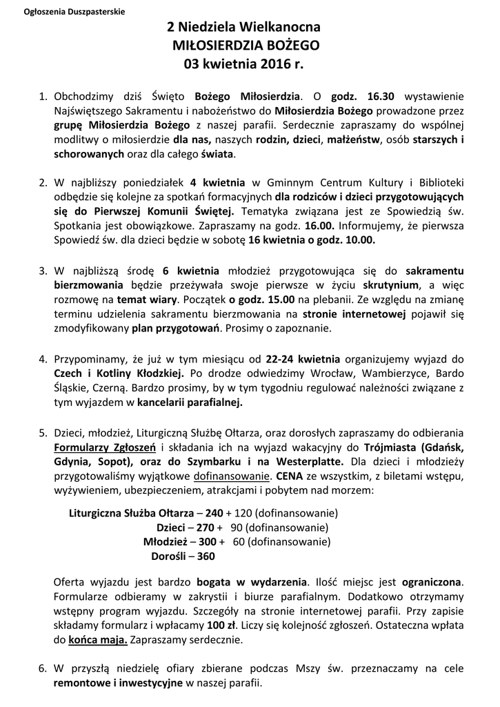 Ogłoszenia Duszpasterskie 2 Niedziela Wielkanocna MIŁOSIERDZIA BOŻEGO 03 kwietnia 2016 r. 1. Obchodzimy dziś Święto Bożego Miłosierdzia. O godz. 16.30 wystawienie Najświętszego Sakramentu i nabożeostwo do Miłosierdzia Bożego prowadzone przez grupę Miłosierdzia Bożego z naszej parafii. Serdecznie zapraszamy do wspólnej modlitwy o miłosierdzie dla nas, naszych rodzin, dzieci, małżeostw, osób starszych i schorowanych oraz dla całego świata. 2. W najbliższy poniedziałek 4 kwietnia w Gminnym Centrum Kultury i Biblioteki odbędzie się kolejne za spotkao formacyjnych dla rodziców i dzieci przygotowujących się do Pierwszej Komunii Świętej. Tematyka związana jest ze Spowiedzią św. Spotkania jest obowiązkowe. Zapraszamy na godz. 16.00. Informujemy, że pierwsza Spowiedź św. dla dzieci będzie w sobotę 16 kwietnia o godz. 10.00. 3. W najbliższą środę 6 kwietnia młodzież przygotowująca się do sakramentu bierzmowania będzie przeżywała swoje pierwsze w życiu skrutynium, a więc rozmowę na temat wiary. Początek o godz. 15.00 na plebanii. Ze względu na zmianę terminu udzielenia sakramentu bierzmowania na stronie internetowej pojawił się zmodyfikowany plan przygotowao. Prosimy o zapoznanie. 4. Przypominamy, że już w tym miesiącu od 22-24 kwietnia organizujemy wyjazd do Czech i Kotliny Kłodzkiej. Po drodze odwiedzimy Wrocław, Wambierzyce, Bardo Śląskie, Czerną. Bardzo prosimy, by w tym tygodniu regulowad należności związane z tym wyjazdem w kancelarii parafialnej. 5. Dzieci, młodzież, Liturgiczną Służbę Ołtarza, oraz dorosłych zapraszamy do odbierania Formularzy Zgłoszeo i składania ich na wyjazd wakacyjny do Trójmiasta (Gdaosk, Gdynia, Sopot), oraz do Szymbarku i na Westerplatte. Dla dzieci i młodzieży przygotowaliśmy wyjątkowe dofinansowanie. CENA ze wszystkim, z biletami wstępu, wyżywieniem, ubezpieczeniem, atrakcjami i pobytem nad morzem: Liturgiczna Służba Ołtarza – 240 + 120 (dofinansowanie) Dzieci – 270 + 90 (dofinansowanie) Młodzież – 300 + 60 (dofinansowanie) Dorośli – 360 Oferta wyjazdu jest bardzo bogata w wydarzenia. Ilośd miejsc jest ograniczona. Formularze odbieramy w zakrystii i biurze parafialnym. Dodatkowo otrzymamy wstępny program wyjazdu. Szczegóły na stronie internetowej parafii. Przy zapisie składamy formularz i wpłacamy 100 zł. Liczy się kolejnośd zgłoszeo. Ostateczna wpłata do kooca maja. Zapraszamy serdecznie. 6. W przyszłą niedzielę ofiary zbierane podczas Mszy św. przeznaczamy na cele remontowe i inwestycyjne w naszej parafii.