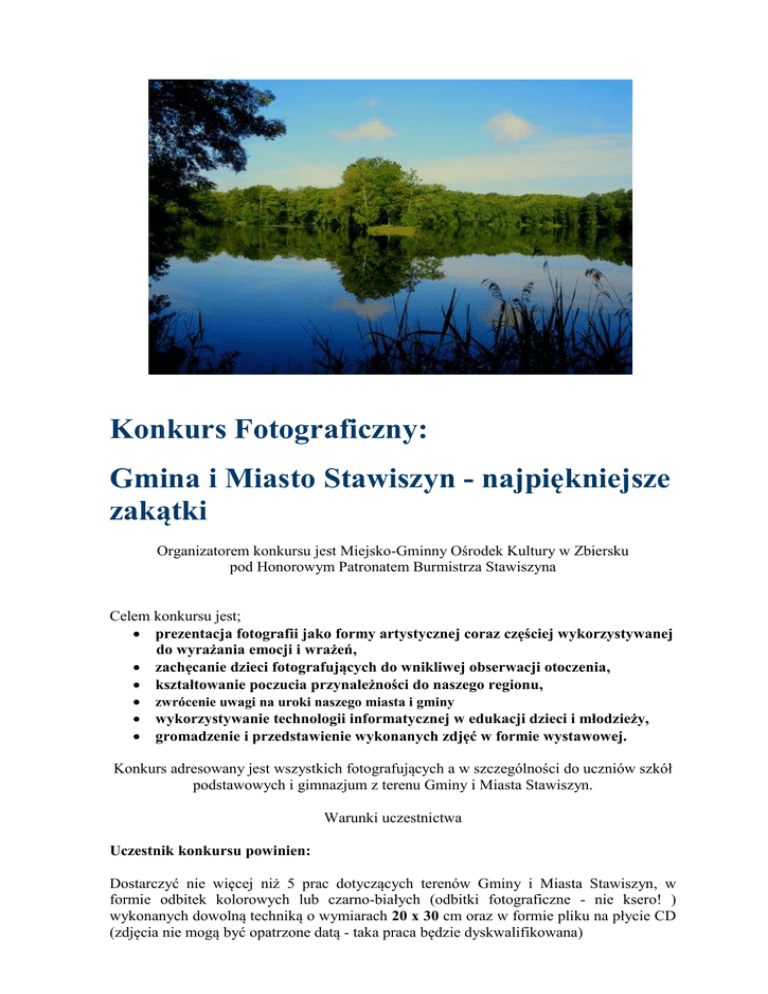Konkurs Fotograficzny: Gmina i Miasto Stawiszyn - najpiękniejsze zakątki Organizatorem konkursu jest Miejsko-Gminny Ośrodek Kultury w Zbiersku pod Honorowym Patronatem Burmistrza Stawiszyna Celem konkursu jest; prezentacja fotografii jako formy artystycznej coraz częściej wykorzystywanej do wyrażania emocji i wrażeń, zachęcanie dzieci fotografujących do wnikliwej obserwacji otoczenia, kształtowanie poczucia przynależności do naszego regionu, zwrócenie uwagi na uroki naszego miasta i gminy wykorzystywanie technologii informatycznej w edukacji dzieci i młodzieży, gromadzenie i przedstawienie wykonanych zdjęć w formie wystawowej. Konkurs adresowany jest wszystkich fotografujących a w szczególności do uczniów szkół podstawowych i gimnazjum z terenu Gminy i Miasta Stawiszyn. Warunki uczestnictwa Uczestnik konkursu powinien: Dostarczyć nie więcej niż 5 prac dotyczących terenów Gminy i Miasta Stawiszyn, w formie odbitek kolorowych lub czarno-białych (odbitki fotograficzne - nie ksero! ) wykonanych dowolną techniką o wymiarach 20 x 30 cm oraz w formie pliku na płycie CD (zdjęcia nie mogą być opatrzone datą - taka praca będzie dyskwalifikowana) Prosimy o dostarczenie fotografii również na płycie CD w celu umieszczenia ich w ealbumie. Pliki na płycie CD powinny być przeskanowane do rozdzielczości 800x600. W nazwie pliku prosimy podać nazwisko uczestnika, numer pliku. Każda z prac powinna zostać opisana (imię, nazwisko, klasa, szkoła) PROSIMY NIE NAKLEJAĆ KARTEK Z OPISEM NA FOTOGRAFIACH! Uczestnik Konkursu może zgłosić prace konkursowe będące przejawem jego indywidualnej twórczości. Uczestnik Konkursu nie może zgłaszać prac konkursowych będących opracowaniem innej fotografii, w szczególności jej przeróbki lub adaptacji. Prace konkursowe należy dostarczyć do 1 czerwca 2015 roku: Sekretariat Urzędu Gminy i Miasta Stawiszyn lub Miejsko-Gminny Ośrodek Kultury w Zbiersku Cukrowni 237. Zgłoszenie prac do konkursu jest równoznaczne z przekazaniem do nich praw autorskich na rzecz organizatora. Organizator zastrzega sobie prawo do bezpłatnej reprodukcji prac na stronie internetowej z zaznaczeniem nazwiska autora. Dane osobowe uczestników będą wykorzystywane wyłącznie w celu wyłonienia zwycięzców i ewentualne przyznanie nagrody. Warunki przyznawania nagród O wyłonieniu zwycięzców konkursu decyduje powołane w tym celu przez Organizatora JURY. Spośród zgłoszonych do konkursu prac JURY wybierze i przyzna trzy nagrody za najciekawszą pracę. Ocenie będą podlegać: o Jakość i estetyka wykonanej fotografii o Pomysłowość i oryginalność wyboru obiektu fotografowanego O przyznaniu nagród Laureaci Konkursu zostaną powiadomieni pisemnie lub telefonicznie. Ogłoszenie wyników konkursu nastąpi 20 czerwca 2015r. podczas obchodów „Dni Stawiszyna”. NAGRODY I miejsce – Aparat cyfrowy II miejsce – Ramka do zdjęć (cyfrowa) III miejsce - odtwarzacz MP4 Dodatkowo wszyscy uczestnicy otrzymają dyplom. Przewidziane są również wyróżnienia w formie nagród rzeczowych i książkowych.
