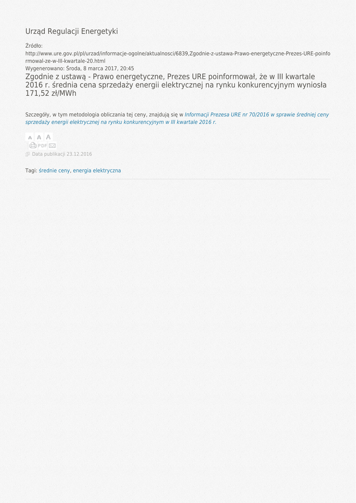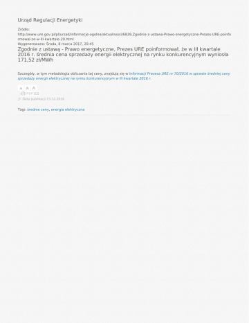 Urząd Regulacji Energetyki Źródło: http://www.ure.gov.pl/pl/urzad/informacje-ogolne/aktualnosci/6839,Zgodnie-z-ustawa-Prawo-energetyczne-Prezes-URE-poinfo rmowal-ze-w-III-kwartale-20.html Wygenerowano: Środa, 8 marca 2017, 20:45 Zgodnie z ustawą - Prawo energetyczne, Prezes URE poinformował, że w III kwartale 2016 r. średnia cena sprzedaży energii elektrycznej na rynku konkurencyjnym wyniosła 171,52 zł/MWh Szczegóły, w tym metodologia obliczania tej ceny, znajdują się w Informacji Prezesa URE nr 70/2016 w sprawie średniej ceny sprzedaży energii elektrycznej na rynku konkurencyjnym w III kwartale 2016 r. Data publikacji 23.12.2016 Tagi: średnie ceny, energia elektryczna