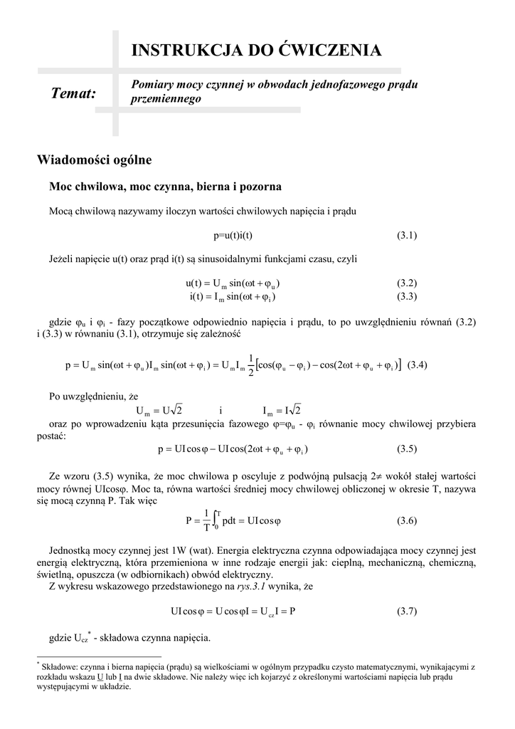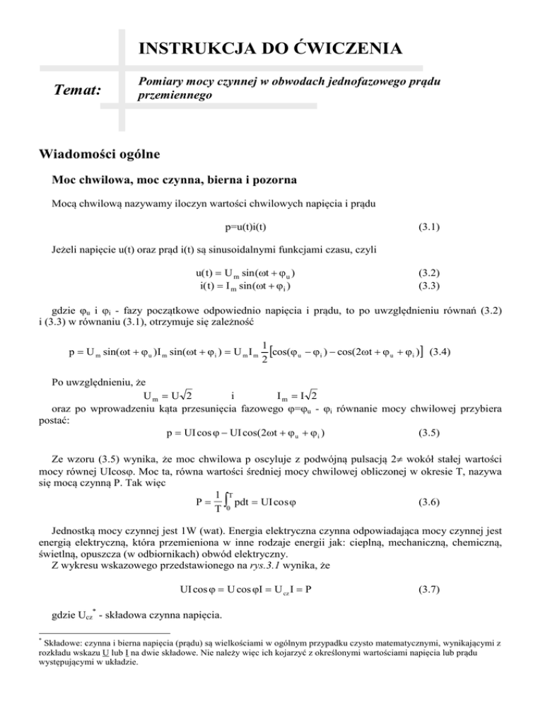 INSTRUKCJA DO ĆWICZENIA Temat: Pomiary mocy czynnej w obwodach jednofazowego prądu przemiennego Wiadomości ogólne Moc chwilowa, moc czynna, bierna i pozorna Mocą chwilową nazywamy iloczyn wartości chwilowych napięcia i prądu p=u(t)i(t) (3.1) Jeżeli napięcie u(t) oraz prąd i(t) są sinusoidalnymi funkcjami czasu, czyli u( t) = U m sin(ωt + ϕ u ) i( t) = I m sin(ωt + ϕ i ) (3.2) (3.3) gdzie ϕu i ϕi - fazy początkowe odpowiednio napięcia i prądu, to po uwzględnieniu równań (3.2) i (3.3) w równaniu (3.1), otrzymuje się zależność p = U m sin(ωt + ϕ u )I m sin(ωt + ϕ i ) = U m I m 1 [cos(ϕ u − ϕ i ) − cos(2ωt + ϕ u + ϕi )] (3.4) 2 Po uwzględnieniu, że Um = U 2 i Im = I 2 oraz po wprowadzeniu kąta przesunięcia fazowego ϕ=ϕu - ϕi równanie mocy chwilowej przybiera postać: p = UI cos ϕ − UI cos(2ωt + ϕ u + ϕ i ) (3.5) Ze wzoru (3.5) wynika, że moc chwilowa p oscyluje z podwójną pulsacją 2π wokół stałej wartości mocy równej UIcosϕ. Moc ta, równa wartości średniej mocy chwilowej obliczonej w okresie T, nazywa się mocą czynną P. Tak więc 1 T P = ∫ pdt = UI cosϕ (3.6) T 0 Jednostką mocy czynnej jest 1W (wat). Energia elektryczna czynna odpowiadająca mocy czynnej jest energią elektryczną, która przemieniona w inne rodzaje energii jak: cieplną, mechaniczną, chemiczną, świetlną, opuszcza (w odbiornikach) obwód elektryczny. Z wykresu wskazowego przedstawionego na rys.3.1 wynika, że UI cos ϕ = U cos ϕI = U cz I = P (3.7) gdzie Ucz* - składowa czynna napięcia. * Składowe: czynna i bierna napięcia (prądu) są wielkościami w ogólnym przypadku czysto matematycznymi, wynikającymi z rozkładu wskazu U lub I na dwie składowe. Nie należy więc ich kojarzyć z określonymi wartościami napięcia lub prądu występującymi w układzie. Rys.3.1. Wykres wskazowy napięcia i prądu opisanych równaniami (3.2) i (3.3) Druga ze składowych napięcia to składowa bierna Ub* - odpowiada ona mocy biernej Q, którą oblicza się ze wzoru: Q = U b I = U sin ϕI = UI sin ϕ (3.8) Jednostką mocy biernej jest 1var (war). W odróżnieniu od energii czynnej, energia bierna nie jest rozpraszana w odbiorniku. Odpowiadająca jej moc bierna pozostaje w układzie źródło-odbiornik powodując dodatkowe obciążenie linii zasilającej. Mimo to jest ona potrzebna do wytworzenia np. zmiennego pola magnetycznego w urządzeniach takich jak transformatory, silniki elektryczne itp. Mocą pozorną (S) nazywa się iloczyn wartości skutecznych napięcia i prądu S = UI = P 2 + Q 2 (3.9) Jednostką mocy pozornej jest 1 V ⋅ A (woltoamper). Na podstawie zależności (3.6), (3.8) i (3.9) można zauważyć, że wielkości P, Q i S są bokami trójkąta prostokątnego o kącie ostrym ϕ. Nazwano go trójkątem mocy (rys.3.2). Rys.3.2. Trójkąt mocy Poprawa współczynnika mocy Bilans energetyczny w sieci prądu przemiennego jest bardziej skomplikowany niż w układzie prądu stałego. Polega on bowiem na pokryciu potrzeb zarówno w zakresie mocy czynnej (P) jak i mocy biernej (Q) (rys. 3.3a). * patrz poprzedni przypis Rys.3.3. Schematyczne przedstawienie przepływu mocy w układzie źródło-odbiornik: a) sieć prądu stałego b) sieć prądu przemiennego; W sieci prądu stałego bilans dotyczy tylko mocy jednego rodzaju (P). Sytuację tę przedstawiono na rys.3.3a. Najczęściej odbiorniki w praktyce są charakteru rezystancyjno -indukcyjnego i dlatego w układzie prądu przemiennego (rys.3.3b) źródło musi dysponować oprócz mocy czynnej, również pewnym "zapasem" mocy biernej indukcyjnej. Wzajemna relacja między wartościami P i Q źródła, zależy od mocy pozornej źródła oraz od cos zwanego współczynnikiem mocy, przy czym (rys.3.2) P = S cosϕ, Q = S sin ϕ (3.10) Jeżeli współczynnik mocy odbiornika cosϕ0 ma wartość mniejszą od współczynnika mocy źródła cosϕ, to występuje: 1. niepełne wykorzystanie mocy czynnej generatora, 2. zwiększenie natężenia prądu przy danej mocy czynnej odbiornika, a w konsekwencji wzrost spadku napięcia i strat mocy w liniach przesyłowych. Obydwa skutki zostaną dokładniej omówione poniżej Ad.1 Na rysunku 3.4 przedstawiono trójkąt mocy generatora (P,Q,S) oraz równoważnego pod względem mocy pozornej, ale niedopasowanego pod względem współczynnika mocy odbiornika (P0,Q0,S0). Rys.3.4. Trójkąt mocy: a) generatora; b) odbiornika W tym przypadku, pomimo spełnienia warunku S0=S, zbyt mała wartość cosϕ0 powoduje następujące negatywne zjawiska: • niedociążenie generatora mocą czynną (P0<P), • przeciążenie generatora mocą bierną (Q0>Q). Tak więc mamy do czynienia z ,,zamrożeniem'' części mocy czynnej generatora oraz przekroczeniem jego znamionowych możliwości dotyczących mocy biernej. Wskutek rozmagnesowującego oddziaływania zbyt dużej składowej indukcyjnej prądu obciążenia maleje napięcie na zaciskach generatora, co w ostatecznym wyniku może doprowadzić do jego wypadnięcia z synchronicznej pracy w sieci elektroenergetycznej. Ad.2 Wartość skuteczna prądu pobieranego przez odbiornik o mocy czynnej P0 może być obliczona ze wzoru P0 I= (3.11) U cosϕ0 Mniejsza wartość cosϕ0, której odpowiada większa wartość Q0 przy P0=const wywołuje więc większą wartość prądu, a tym samym wzrost spadku napięcia ∆U oraz strat mocy ∆P w sieci przesyłowej, bowiem obowiązują zależności ∆U ≅ IZ p , ∆P = I 2 R p (3.12) gdzie Rp, Zp - rezystancja i impedancja linii przesyłowej. Przyczyną zbyt małej wartości współczynnika mocy są te odbiorniki, których zasada działania wymaga udziału strumienia magnetycznego. Odzwierciedleniem tego faktu jest odpowiednio duży przepływ mocy biernej indukcyjnej. Do głównych urządzeń elektrycznych kreujących moc bierną indukcyjną zalicza się silniki asynchroniczne oraz transformatory. Współczynnik mocy silników indukcyjnych w warunkach znamionowych waha się w granicach 0,8...0,9, przy 