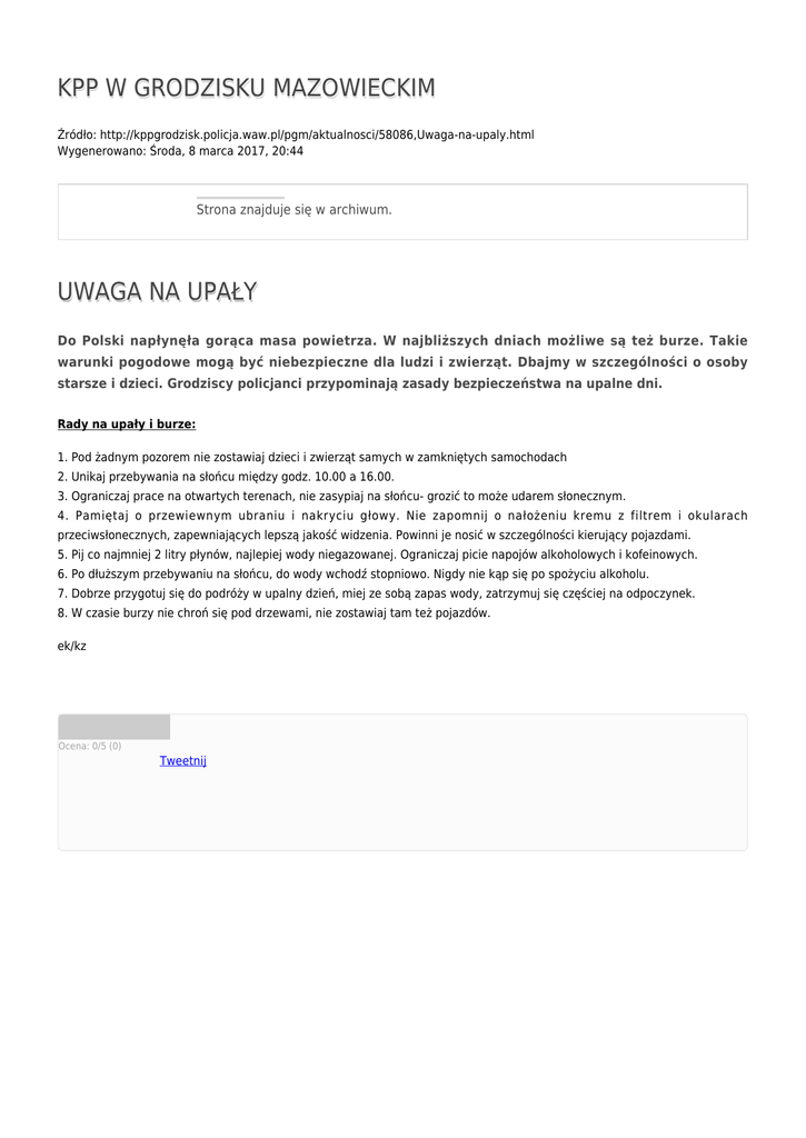 KPP W GRODZISKU MAZOWIECKIM Źródło: http://kppgrodzisk.policja.waw.pl/pgm/aktualnosci/58086,Uwaga-na-upaly.html Wygenerowano: Środa, 8 marca 2017, 20:44 Strona znajduje się w archiwum. UWAGA NA UPAŁY Do Polski napłynęła gorąca masa powietrza. W najbliższych dniach możliwe są też burze. Takie warunki pogodowe mogą być niebezpieczne dla ludzi i zwierząt. Dbajmy w szczególności o osoby starsze i dzieci. Grodziscy policjanci przypominają zasady bezpieczeństwa na upalne dni. Rady na upały i burze: 1. Pod żadnym pozorem nie zostawiaj dzieci i zwierząt samych w zamkniętych samochodach 2. Unikaj przebywania na słońcu między godz. 10.00 a 16.00. 3. Ograniczaj prace na otwartych terenach, nie zasypiaj na słońcu- grozić to może udarem słonecznym. 4. Pamiętaj o przewiewnym ubraniu i nakryciu głowy. Nie zapomnij o nałożeniu kremu z filtrem i okularach przeciwsłonecznych, zapewniających lepszą jakość widzenia. Powinni je nosić w szczególności kierujący pojazdami. 5. Pij co najmniej 2 litry płynów, najlepiej wody niegazowanej. Ograniczaj picie napojów alkoholowych i kofeinowych. 6. Po dłuższym przebywaniu na słońcu, do wody wchodź stopniowo. Nigdy nie kąp się po spożyciu alkoholu. 7. Dobrze przygotuj się do podróży w upalny dzień, miej ze sobą zapas wody, zatrzymuj się częściej na odpoczynek. 8. W czasie burzy nie chroń się pod drzewami, nie zostawiaj tam też pojazdów. ek/kz Ocena: 0/5 (0) Tweetnij