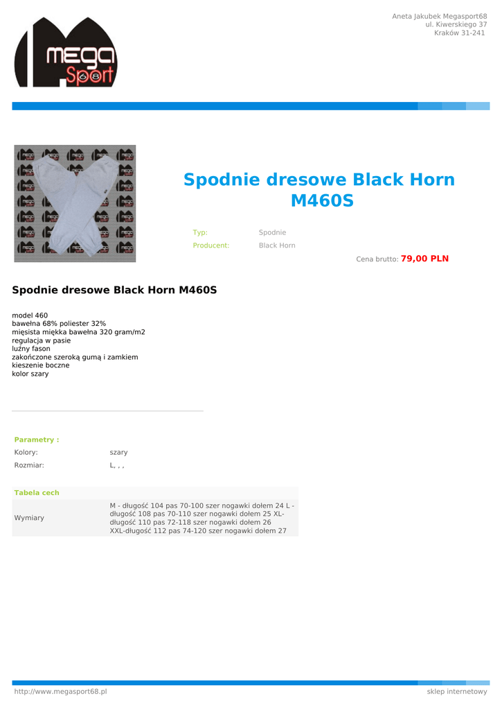 Aneta Jakubek Megasport68 ul. Kiwerskiego 37 Kraków 31-241 Spodnie dresowe Black Horn M460S Typ: Spodnie Producent: Black Horn Cena brutto: 79,00 PLN Spodnie dresowe Black Horn M460S model 460 bawełna 68% poliester 32% mięsista miękka bawełna 320 gram/m2 regulacja w pasie luźny fason zakończone szeroką gumą i zamkiem kieszenie boczne kolor szary Parametry : Kolory: szary Rozmiar: L, , , Tabela cech Wymiary http://www.megasport68.pl M - długość 104 pas 70-100 szer nogawki dołem 24 L długość 108 pas 70-110 szer nogawki dołem 25 XLdługość 110 pas 72-118 szer nogawki dołem 26 XXL-długość 112 pas 74-120 szer nogawki dołem 27 sklep internetowy