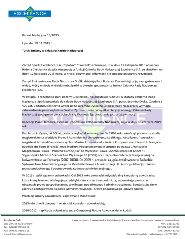 Zarząd Spółki Excellence S.A. ("Spółka", "Emitent") informuje, iż w dniu 12 listopada 2015 roku pani