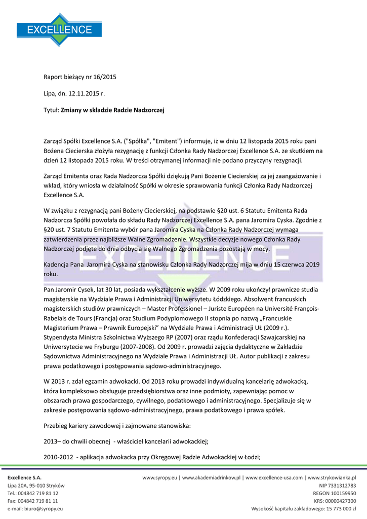 Nadzorcza Spółki powołała do składu Rady Nadzorczej Excellence S.A. pana Jaromira Cyska. Zgodnie z