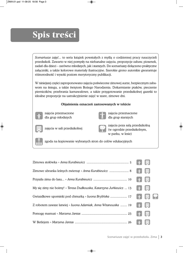 ZIMA:01.qxd 11-08-25 18:56 Page 3 Spis treÊci Scenariusze zaj´ç... to seria ksià˝ek powstałych z myÊlà o codziennej pracy nauczycieli przedszkoli. Zawarto w niej pomysły na niebanalne zaj´cia, propozycje zabaw, piosenek, zadaƒ dla dzieci – zarówno młodszych, jak i starszych. Do scenariuszy dołàczono praktyczne załàczniki, a tak˝e kolorowe materiały ilustracyjne. Szerokie grono autorskie gwarantuje ró˝norodnoÊç i wysoki poziom merytoryczny publikacji. W niniejszej cz´Êci zaproponowano zaj´cia poÊwiecone zimowej aurze, bezpiecznym zabawom na Êniegu, a tak˝e Êwi´tom Bo˝ego Narodzenia. Dokarmianie ptaków, pieczenie pierniczków, przebrania karnawałowe, a tak˝e przygotowanie przedszkolnej gazetki to idealne propozycje na uatrakcyjnienie zaj´ç w szare, zimowe dni. ObjaÊnienia oznaczeƒ zastosowanych w tekÊcie zaj´cia przeznaczone dla grup młodszych zaj´cia przeznaczone dla grup starszych zaj´cia w sali przedszkolnej zaj´cia poza salà przedszkolnà (w ogrodzie przedszkolnym, w parku, w lesie) zgoda na kopiowanie wybranych stron do celów edukacyjnych Zimowa stołówka l Anna Kurabiewicz .................................................. 5 Zimowe ubranka leÊnych zwierzàt l Anna Kurabiewicz ....................... 8 Przyszła zima do lasu... l Anna Kurabiewicz ........................................ 10 My si´ zimy nie boimy! l Teresa Dudkowska, Katarzyna Jurkiewicz ... 13 Gwiazdkowe upominki pod chmurkà l Iwona Bryliƒska .................... 17 Z robotem zawsze łatwiej l Iwona Adamiak, Anna Witanowska ........ 19 Pomog´ mamusi l Marzena Jantas ...................................................... 23 W Betlejem l Marzena Jantas .............................................................. 26 Scenariusze zaj´ç w przedszkolu. Zima 3 ZIMA:01.qxd 11-08-25 18:56 Page 4 Spis treÊci Przyjedê do nas, Mikołaju l Barbara Feduszczak ................................. 32 Bałwanek l Teresa Dudkowska, Katarzyna Jurkiewicz ........................ 37 Lody nie do lizania l Iwona Bryliƒska .................................................. 40 Âniegu nigdy za wiele l Iwona Bryliƒska.............................................. 42 Zimowe podchody l Iwona Bryliƒska .................................................. 48 Dzwonki Êwiàtecznej poczty l Zofia Makowska ................................... 51 Wkoło choinki l Zofia Makowska ......................................................... 53 Bo˝e Narodzenie dawniej i dziÊ l Zofia Makowska .............................. 55 Co tak pachnie, co tak smakuje? l Zofia Makowska ............................ 60 Zima i karnawał l Wanda Bowik........................................................... 63 Gazeta „ZIMOWE NOWINY” l Iwona Bryliƒska ................................. 69 Materiały ilustracyjne ........................................................................... 73 4 Scenariusze zaj´ç w przedszkolu. Zima ZIMA:01.qxd 11-08-25 18:57 Page 37 Bałwanek Teresa Dudkowska, Katarzyna Jurkiewicz Forma pracy z całà grupà, w zespołach Miejsce realizacji sala przedszkolna Pomoce za∏àczone Materiały do kserowania l koła (załàcznik 1) Pomoce dodatkowe l kulki z krepiny czerwonej i czarnej kulki z białej krepiny, tacki, klej, p´dzelki do kartonu, karton w kolorze niebieskim, fioletowym, granatowym i ˝ółtym dla ka˝dego zespołu dzieci l instrumenty perkusyjne: b´benek, kołatka, dwie grzechotki l Uwagi Kilka dni wczeÊniej wraz z dzieçmi zrób kulki z krepiny w kolorze białym (do wyklejenia postaci bałwana), czerwonym (na usta i nos) i czarnym (oczy). Przygotuj tak˝e 3 koła ró˝nej wielkoÊci wyklejone kulkami z krepiny. 1 ZaproÊ dzieci, ˝eby usiadły przed tablicà. Zaproponuj im odgadni´cie zagadki: Trzy białe kule, sprawa to znana, mo˝esz zamieniç zimà w … (bałwana) Kiedy uzyskasz od dzieci poprawnà odpowiedê, przypnij w dowolnych miejscach tablicy trzy ró˝nej wielkoÊci koła wypełnione kulkami białej krepiny. Zaproponuj uło˝enie z tych kół bałwana. W czasie konstruowania jego postaci zach´ç dzieci do u˝ywania okreÊleƒ: małe koło, wi´ksze koło, najwi´ksze koło, wysoko, nisko. 2 Podziel dzieci na 5-osobowe zespoły. Ka˝dy zespół b´dzie pracował przy oddzielnym stoliku. Jedna osoba zajmie si´ wyklejaniem kulkami z białej krepiny najmniejszego koła (głowy bałwana), dwie osoby b´dà wyklejaç koło wi´ksze, pozostałych dwoje dzieci wypełnia krepinà trzecie, najwi´ksze koło. Na ka˝dym kole, które b´dzie głowà bałwana, sama przyklej wczeÊniej oczy (2 kulki z czarnej krepiny), nos (2 kulki czerwone), usta (3 kulki czerwone). Zadaniem dzieci Scenariusze zaj´ç w przedszkolu. Zima 37 ZIMA:01.qxd 11-08-25 18:57 Page 38 Bałwanek b´dzie wypełnienie białymi kulkami przestrzeni pomi´dzy ju˝ przyklejonymi przez Ciebie. Wyklejone koła dzieci układajà na kolorowym kartonie tak, ˝eby powstała postaç bałwana i przyklejajà je do kartonu. Uczul dzieci na koniecznoÊç pomocy w porzàdkowaniu swojego miejsca pracy i umycia ràk po skoƒczonej pracy. Wspólnie z dzieçmi umieÊç bałwanki w galerii dzieci´cej. 3 Zaproponuj zabaw´ przy piosence pt. Bałwankowa rodzina. Dzieci ustawiajà si´ w kole. Wybierz te, które b´dà poszczególnymi członkami rodziny bałwanków – tata, mama, dwaj bracia. ZaproÊ je do Êrodka koła. Rozdaj instrumenty perkusyjne (tata – b´benek; mama – kołatka; bracia – grzechotki). 2. Ma korale z jarz´biny bałwankowa ˝ona, ale łatwo poznaç z miny, ˝e dziÊ jest zmartwiona. Oj, tak, tak! Oj, tak, tak! Mego synka jeszcze brak. Oj, tak, tak! Oj, tak, tak! Synka jeszcze brak! 3. Stoi bałwan z bałwankowà w Êrodku zaÊ bałwanek, jeszcze chwila i rozpocznà bałwankowy taniec! Oj, tak, tak! Oj, tak, tak! Przydałby si´ jeszcze brat! Oj, tak, tak! Oj, tak, tak! Przydałby si´ brat! 4. Ju˝ wesołe dwa bałwanki taƒczà z rodzicami i my tak˝e si´ pobawmy razem z bałwankami Oj, tak