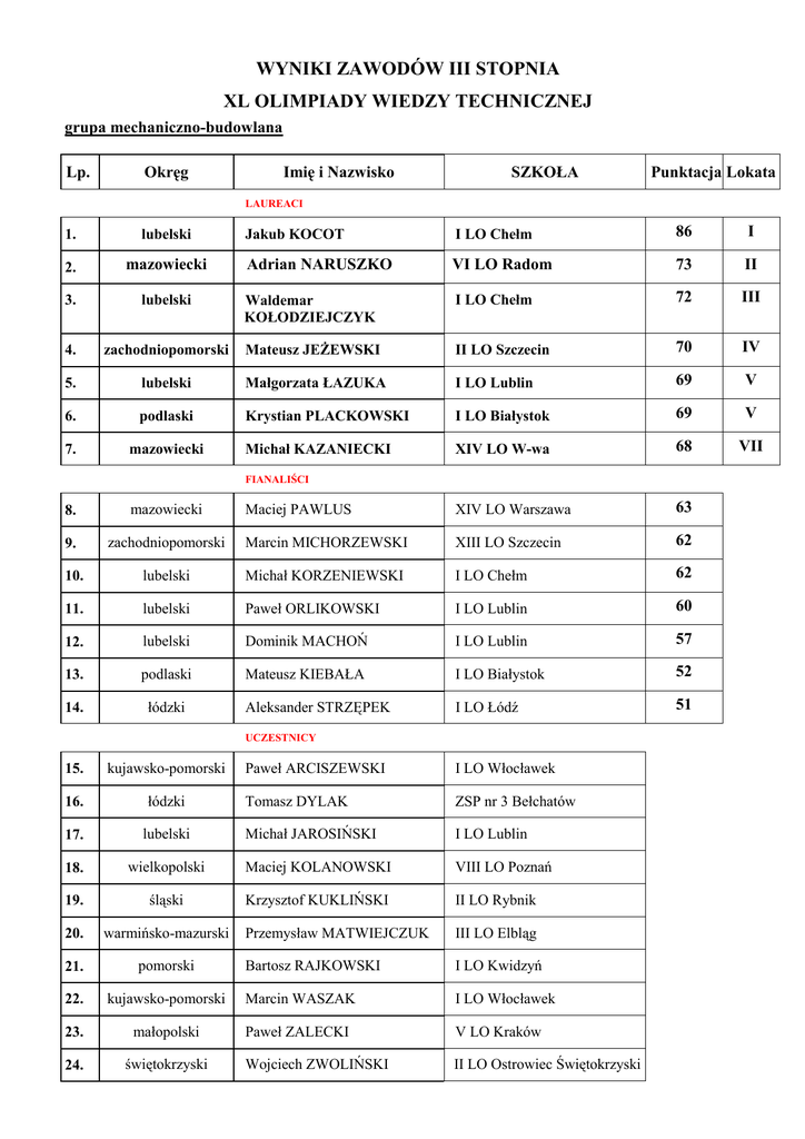 WYNIKI ZAWODÓW III STOPNIA XL OLIMPIADY WIEDZY TECHNICZNEJ grupa mechaniczno-budowlana Lp. Okręg Imię i Nazwisko SZKOŁA Punktacja Lokata LAUREACI Jakub KOCOT I LO Chełm 86 I Adrian NARUSZKO VI LO Radom 73 II lubelski Waldemar KOŁODZIEJCZYK I LO Chełm 72 III 4. zachodniopomorski Mateusz JEŻEWSKI II LO Szczecin 70 IV 5. lubelski Małgorzata ŁAZUKA I LO Lublin 69 V 6. podlaski Krystian PLACKOWSKI I LO Białystok 69 V 7. mazowiecki Michał KAZANIECKI XIV LO W-wa 68 VII Maciej PAWLUS XIV LO Warszawa 63 1. lubelski 2. mazowiecki 3. FIANALIŚCI 8. mazowiecki 9. zachodniopomorski Marcin MICHORZEWSKI XIII LO Szczecin 62 10. lubelski Michał KORZENIEWSKI I LO Chełm 62 11. lubelski Paweł ORLIKOWSKI I LO Lublin 60 12. lubelski Dominik MACHOŃ I LO Lublin 57 13. podlaski Mateusz KIEBAŁA I LO Białystok 52 14. łódzki Aleksander STRZĘPEK I LO Łódź 51 UCZESTNICY 15. kujawsko-pomorski Paweł ARCISZEWSKI I LO Włocławek 16. łódzki Tomasz DYLAK ZSP nr 3 Bełchatów 17. lubelski Michał JAROSIŃSKI I LO Lublin 18. wielkopolski Maciej KOLANOWSKI VIII LO Poznań 19. śląski Krzysztof KUKLIŃSKI II LO Rybnik 20. warmińsko-mazurski Przemysław MATWIEJCZUK III LO Elbląg 21. pomorski Bartosz RAJKOWSKI I LO Kwidzyń 22. kujawsko-pomorski Marcin WASZAK I LO Włocławek 23. małopolski Paweł ZALECKI V LO Kraków 24. świętokrzyski Wojciech ZWOLIŃSKI II LO Ostrowiec Świętokrzyski grupa elektryczno-elektroniczna Lp. Okręg Imię i Nazwisko SZKOŁA Punktacja Lokata LAUREACI 1. śląski Tomasz GOLIS ZSŁ Gliwice 98 I 2. śląski Kamil SMYCZEK ZS nr 6 Jastrzębie-Zdrój 81 II 3. podkarpacki Dariusz BROŻYNA ZS nr 3 Jasło 69 III 4. dolnośląski Dawid CHMIEL III LO Wrocław 69 III 5. małopolski Filip OLESZEK ZSŁ Kraków 64 V KLO Szczecin 64 V ZSEiT Olsztyn 62 VII Bartosz ROSADZIŃSKI ZSP nr 1 Inowrocław 59 6. 7. zachodniopomorski Mateusz RACZYŃSKI warmińskomazurski Paweł GAJEWSKI FIANALIŚCI 8. kujawsko-pomorski 9. małopolski Mateusz DUDEK ZS ME Nowy Sącz 56 10. mazowiecki Cezary PALICH ZSP nr 1 Siedlce 56 11. kujawsko-pomorski Radosław BRZOZOWSKI ZSE Bydgoszcz 54 12. lubelski Tomasz CZERWIENIEC I LO Zamość 51 13. podkarpacki Mateusz GUZEK ZSP nr 5 Krosno 51 14. małopolski Robert WIDLAK ZS ME Nowy Sącz 51 UCZESTNICY 15. kujawsko-pomorski Michał BANACH ZSE Bydgoszcz 16. zachodniopomorski Bartłomiej BŁESZYŃSKI II LO Szczecin 17. kujawsko-pom. Julia BORKOWSKA ZS UMK Toruń 18. mazowiecki Daniel GŁOGOWSKI ZSE Radom 19. śląski Adrian GÓRSKI TZN Częstochowa 20. małopolski Patryk JAROSZ ZSŁ Kraków 21. łódzki Michał KURZAWA ZSE Zduńska Wola 22. małopolski Robert ŁABUZ ZSŁ Kraków 23. śląski Mikołaj MARKIEL ZSEEiM Bielsko-Biała 24. dolnośląski Jakub MNICH II LO Wałbrzych 25. łódzki Daniel NOGAŃSKI ZS CEZiU Rawa Maz. 26. małopolski Marek NOWAK ZST Tarnów 27. łódzki Łukasz PAWLAK ZSE Zduńska Wola 28. mazowiecki Paweł PLASKOTA ZSE Radom 29. świętokrzyski Tomasz SOBOŃ ZS nr 3 Ostrowiec Świętokrzyski 30. kujawsko-pom. Michał WASZAK ZSMEiE Toruń 31. małopolski Maciej ZNAMIROWSKI ZS ME Nowy Sącz