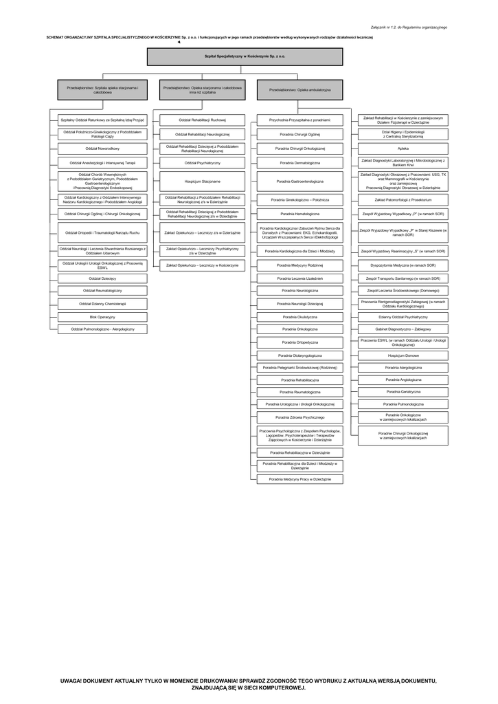 Załącznik nr 1.2. do Regulaminu organizacyjnego SCHEMAT ORGANZACYJNY SZPITALA SPECJALISTYCZNEGO W KOŚCIERZYNIE Sp. z o.o. i funkcjonujących w jego ramach przedsiębiorstw według wykonywanych rodzajów działalności leczniczej Szpital Specjalistyczny w Kościerzynie Sp. z o.o. Przedsiębiorstwo: Szpitala opieka stacjonarna i całodobowa Przedsiębiorstwo: Opieka stacjonarna i całodobowa inna niż szpitalna Przedsiębiorstwo: Opieka ambulatoryjna Szpitalny Oddział Ratunkowy ze Szpitalną Izbą Przyjęć Oddział Rehabilitacji Ruchowej Przychodnia Przyszpitalna z poradniami: Zakład Rehabilitacji w Kościerzynie z zamiejscowym Działem Fizjoterapii w Dzierżążnie Oddział Położniczo-Ginekologiczny z Pododdziałem Patologii Ciąży Oddział Rehabilitacji Neurologicznej Poradnia Chirurgii Ogólnej Dział Higieny i Epidemiologii z Centralną Sterylizatornią Oddział Noworodkowy Oddział Rehabilitacji Dziecięcej z Pododdziałem Rehabilitacji Neurologicznej Poradnia Chirurgii Onkologicznej Apteka Oddział Anestezjologii i Intensywnej Terapii Oddział Psychiatryczny Poradnia Dermatologiczna Zakład Diagnostyki Laboratoryjnej i Mikrobiologicznej z Bankiem Krwi Oddział Chorób Wewnętrznych z Pododdziałem Geriatrycznym, Pododdziałem Gastroenterologicznym i Pracownią Diagnostyki Endoskopowej Hospicjum Stacjonarne Poradnia Gastroenterologiczna Zakład Diagnostyki Obrazowej z Pracowniami: USG, TK oraz Mammografii w Kościerzynie oraz zamiejscową Pracownią Diagnostyki Obrazowej w Dzierżążnie Oddział Kardiologiczny z Oddziałem Intensywnego Nadzoru Kardiologicznego i Pododdziałem Angiologii Oddział Rehabilitacji z Pododdziałem Rehabilitacji Neurologicznej z/s w Dzierżążnie Poradnia Ginekologiczno – Położnicza Zakład Patomorfologii z Prosektorium Oddział Chirurgii Ogólnej i Chirurgii Onkologicznej Oddział Rehabilitacji Dziecięcej z Pododdziałem Rehabilitacji Neurologicznej z/s w Dzierżążnie Poradnia Hematologiczna Zespół Wyjazdowy Wypadkowy „P” (w ramach SOR) Oddział Ortopedii i Traumatologii Narządu Ruchu Zakład Opiekuńczo – Leczniczy z/s w Dzierżążnie Poradnia Kardiologiczna i Zaburzeń Rytmu Serca dla Dorosłych z Pracowniami: EKG, Echokardiografii, Urządzeń Wszczepialnych Serca i Elektrofizjologii Zespół Wyjazdowy Wypadkowy „P” w Starej Kiszewie (w ramach SOR) Oddział Neurologii i Leczenia Stwardnienia Rozsianego z Oddziałem Udarowym Zakład Opiekuńczo – Leczniczy Psychiatryczny z/s w Dzierżążnie Poradnia Kardiologiczna dla Dzieci i Młodzieży Zespół Wyjazdowy Reanimacyjny „S” (w ramach SOR) Oddział Urologii i Urologii Onkologicznej z Pracownią ESWL Zakład Opiekuńczo – Leczniczy w Kościerzynie Poradnia Medycyny Rodzinnej Dyspozytornia Medyczna (w ramach SOR) Oddział Dziecięcy Poradnia Leczenia Uzależnień Zespół Transportu Sanitarnego (w ramach SOR) Oddział Reumatologiczny Poradnia Neurologiczna Zespół Leczenia Środowiskowego (Domowego) Poradnia Neurologii Dziecięcej Pracownia Rentgenodiagnostyki Zabiegowej (w ramach Oddziału Kardiologicznego) Oddział Dzienny Chemioterapii Blok Operacyjny Poradnia Okulistyczna Dzienny Oddział Psychiatryczny Oddział Pulmonologiczno - Alergologiczny Poradnia Onkologiczna Gabinet Diagnostyczno – Zabiegowy Poradnia Ortopedyczna Pracownia ESWL (w ramach Oddziału Urologii i Urologii Onkologicznej) Poradnia Otolaryngologiczna Hospicjum Domowe Poradnia Pielęgniarki Środowiskowej (Rodzinnej) Poradnia Alergologiczna Poradnia Rehabilitacyjna Poradnia Angiologiczna Poradnia Reumatologiczna Poradnia Geriatryczna Poradnia Urologiczna i Urologii Onkologicznej Poradnia Pulmonologiczna Poradnia Zdrowia Psychicznego Poradnie Onkologiczne w zamiejscowych lokalizacjach Pracownia Psychologiczna z Zespołem Psychologów, Logopedów, Psychoterapeutów i Terapeutów Zajęciowych w Kościerzynie i Dzierżążnie Poradnie Chirurgii Onkologicznej w zamiejscowych lokalizacjach Poradnia Rehabilitacyjna w Dzierżążnie Poradnia Rehabilitacyjna dla Dzieci i Młodzieży w Dzierżążnie Poradnia Medycyny Pracy w Dzierżążnie UWAGA! DOKUMENT AKTUALNY TYLKO W MOMENCIE DRUKOWANIA! SPRAWDŹ ZGODNOŚĆ TEGO WYDRUKU Z AKTUALNĄ WERSJĄ DOKUMENTU, ZNAJDUJĄCĄ SIĘ W SIECI KOMPUTEROWEJ.