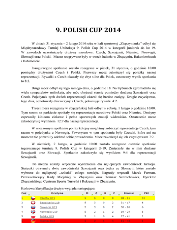 9. POLISH CUP 2014 W dniach 31 stycznia – 2 lutego 2014 roku w hali sportowej „Zbąszynianka” odbył się Międzynarodowy Turniej Unihokeja 9. Polish Cup 2014 w kategorii juniorek do lat 19. W zawodach uczestniczyły drużyny narodowe: Czech, Szwajcarii, Niemiec, Norwegii, Słowacji oraz Polski. Mecze rozgrywane były w trzech halach: w Zbąszyniu, Rakoniewicach i Babimoście. Inauguracyjne spotkanie zostało rozegrane w piątek, 31 stycznia, o godzinie 10.00 pomiędzy drużynami Czech i Polski. Pierwszy mecz zakończył się porażką naszej reprezentacji. Rywalki z Czech okazały się zbyt silne dla Polek, ostateczny wynik spotkania to 8:3. Drugi mecz odbył się tego samego dnia, o godzinie 18. Na trybunach zgromadziło się wielu sympatyków unihokeja, aby móc obejrzeć starcie pomiędzy drużyną Szwajcarii oraz Czech. Pojedynek tych dwóch reprezentacji okazał się bardzo zacięty. Drugie zwycięstwo, tego dnia, odnotowały dziewczyny z Czech, pokonując rywalki 4:2. Trzeci mecz rozegrany w zbąszyńskiej hali odbył w sobotę, 1 lutego o godzinie 10.00. Tym razem na parkiecie spotkały się reprezentacje narodowe Polski oraz Niemiec. Drużyny zapewniły kibicom ciekawe i pełne sportowych emocji widowisko. Ostatecznie mecz zakończył się wynikiem 12:7 dla naszej reprezentacji. W wieczornym spotkaniu po raz kolejny mogliśmy zobaczyć reprezentację Czech, tym razem w pojedynku z Norwegią. Faworytem w tym spotkaniu były Czeszki, które ani na moment nie pozwoliły odebrać sobie prowadzenia. Mecz zakończył się ich zwycięstwem 7:2. W niedzielę, 2 lutego, o godzinie 10.00 zostało rozegrane ostatnie spotkanie tegorocznego turnieju 9. Polish Cup w kategorii U-19. Zmierzyły się w nim drużyny Szwajcarii oraz Słowacji. Spotkanie zakończyło się wynikiem 9:4 dla reprezentacji Szwajcarii. Po meczu zostały wręczone wyróżnienia dla najlepszych zawodniczek turnieju. Statuetki otrzymały dwie zawodniczki Szwajcarii oraz jedna ze Słowacji, które zostały wybrane do najlepszej „szóstki” całego turnieju. Nagrody wręczali Marek Furman, Przewodniczący Rady Miejskiej w Zbąszyniu oraz Tomasz Szczechowicz, Dyrektor Zbąszyńskiego Centrum Sportu Turystki i Rekreacji w Zbąszyniu. Końcowa klasyfikacja drużyn wygląda następująco: Podczas trwania turnieju unihokejowego organizowana była XI już edycja konkursu „Przyjazny Kibic”. Do konkursu zgłosiło się 6 drużyn z gimnazjów w Chrośnicy i Zbąszyniu. Po zakończeniu wszystkich meczy nadszedł czas na podsumowanie oraz wręczenie nagród oraz pamiątkowych dyplomów. Poziom tej edycji przerósł oczekiwania organizatorów. Przygotowanie dopingu dla startujących drużyn było perfekcyjne, wymagało ogromnego wkładu pracy oraz poświęcenia wolnego czasu, za co należą się szczególne podziękowania. Dzięki temu zawodniczki wyjechały z naszego miasta z miłymi wspomnieniami. Konkurs były szczególnie wyrównany, dlatego komisja konkursowa zdecydowała się przyznać miejsca równorzędne. Klasyfikacja końcowa wyglądała następująco: pierwsze miejsce przyznano klasom ze zbąszyńskiego Gimnazjum, które kibicowały zawodniczkom z Czech, na drugim miejscu uplasowały się aż 4 klasy, które dopingowały drużynom: Słowacji, Polski, Szwajcarii oraz Niemiec. Na trzecim miejscu znaleźli się kibice Norwegii. W przerwach pomiędzy tercjami odbywały się występy miejscowych zespołów, Chili ze zbąszyńskiego Gimnazjum, który prowadzi Pani Jolanta Borkowska oraz Rego pod kierownictwem Pani Reginy Gołek. Dla kibiców organizowane były również konkursy, które prowadził Jakub Puchacz, pomagał mu Kamil Dąbrowski. Podziękowania należą się wszystkim, którzy pomagali przy organizacji zawodów: młodzieży obsługującej boisko, osobom prowadzącym sekretariat zawodów, zespołom tanecznym, kibicom oraz opiekunom. Dzięki Wam drużyny grające w naszym mieście zapamiętają Zbąszyń jako wyjątkowe miejsce. Zbąszyńskie Centrum Sportu, Turystki i Rekreacji zaprasza na kolejny ważne sportowe wydarzenie organizowane w naszym mieście, Mistrzostwa Świata w unihokeju kobiet, w kategorii U-19, które odbędą się na przełomie kwietnia i maja.