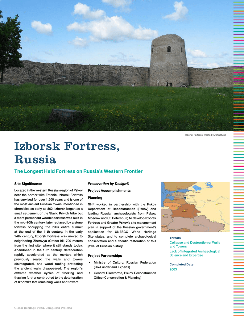 Izborsk Fortress. Photo by John Hurd Izborsk Fortress, Russia The Longest Held Fortress on Russia’s Western Frontier Site Significance Preservation by Design® Located in the western Russian region of Pskov near the border with Estonia, Izborsk Fortress has survived for over 1,500 years and is one of the most ancient Russian towns, mentioned in chronicles as early as 862. Izborsk began as a small settlement of the Slavic Krivich tribe but a more permanent wooden fortress was built in the mid-10th century, later replaced by a stone fortress occupying the hill’s entire summit at the end of the 11th century. In the early 14th century, Izborsk Fortress was moved to neighboring Zheravya (Crane) hill 700 meters from the first site, where it still stands today. Abandoned in the 16th century, deterioration rapidly accelerated as the mortars which previously sealed the walls and towers disintegrated, and wood roofing protecting the ancient walls disappeared. The region’s extreme weather cycles of freezing and thawing further contributed to the deterioration of Izborsk’s last remaining walls and towers. Project Accomplishments Global Heritage Fund, Completed Projects Planning GHF worked in partnership with the Pskov Department of Reconstruction (Pskov) and leading Russian archaeologists from Pskov, Moscow and St. Petersburg to develop Izborsk Fortress and Greater Pskov’s site management plan in support of the Russian government’s application for UNESCO World Heritage Site status, and to complete archaeological conservation and authentic restoration of this Threats jewel of Russian history. Collapse and Destruction of Walls and Towers Project Partnerships Lack of Integrated Archaeological Science and Expertise •Ministry of Culture, Russian Federation (Co-Funder and Experts) •General Directorate, Pskov Reconstruction Office (Conservation & Planning) Completed Date 2003 Conservation Science Community Conservation of the Izborsk Fortress proceeded section by section, with each area surveyed, mapped and researched, then consolidated and stabilized, with some selected towers and walls restored. Restoration used authentic materials and adhered to historic architectural design. In particular, GHF conservation efforts were targeted at the stabilization and conservation of the Nickolski Gate and walls associated with this gate, which has been achieved with a high standard of planning, documentation, craftsmanship and management. All works done are reversible and do not threaten the well-being of the historic fabric. GHF led the design and development of the first professional site interpretation system in Russian, English and other European languages, which were incorporated into an improved on-site museum. GHF further established the Izborsk Project Trust as a matching co-investment with the Russian government and GHF private-sector donors in Russia to fund and manage conservation of the entire Izborsk Fortress to the highest archaeological conservation standards, while helping to build a major tourism opportunity for Pskov. Nickolski Gate before (top) and after (bottom). Restoration of interior wall. Photo by John Hurd Recent Accomplishments •Conservation of the Nickolski Gate and its associated walls. •Stabilizaton and conservation of additional deteriorating walls and towers. •The design and development of a professional, multi-lingual site interpretation system. Photo by John Hurd Izborsk Fortess, one of the last remaining ancient fortresses which protected Russia’s since its founding in 500AD. 625 Emerson Street, Suite 200 Palo Alto, CA 94301 Global Heritage Fund, Completed Projects t 650.325.7520 f 650.325.7511 globalheritagefund.org