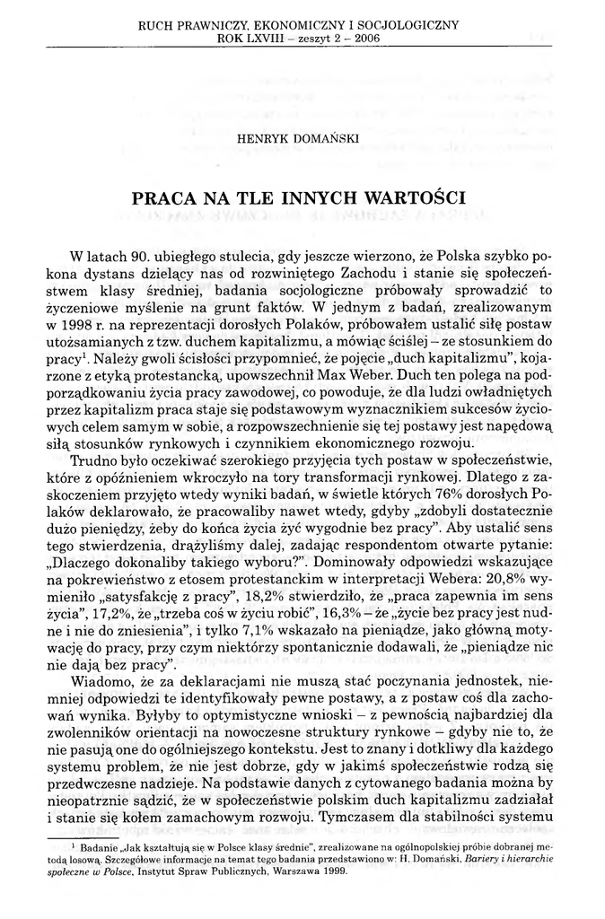 RUCH PRAWNICZY, EKONOMICZNY I SOCJOLOGICZNY ROK LXVIII - zeszyt 2 - 2006_______________ HENRYK DOMAŃSKI PRACA NA TLE INNYCH WARTOŚCI W latach 90. ubiegłego stulecia, gdy jeszcze wierzono, że Polska szybko po kona dystans dzielący nas od rozwiniętego Zachodu i stanie się społeczeń stwem klasy średniej, badania socjologiczne próbowały sprowadzić to życzeniowe myślenie na grunt faktów. W jednym z badań, zrealizowanym w 1998 r. na reprezentacji dorosłych Polaków, próbowałem ustalić siłę postaw utożsamianych z tzw. duchem kapitalizmu, a mówiąc ściślej - ze stosunkiem do pracy1. Należy gwoli ścisłości przypomnieć, że pojęcie „duch kapitalizmu”, koja rzone z etyką protestancką upowszechnił Max Weber. Duch ten polega na pod porządkowaniu życia pracy zawodowej, co powoduje, że dla ludzi owładniętych przez kapitalizm praca staje się podstawowym wyznacznikiem sukcesów życio wych celem samym w sobie, a rozpowszechnienie się tej postawy jest napędową siłą stosunków rynkowych i czynnikiem ekonomicznego rozwoju. Trudno było oczekiwać szerokiego przyjęcia tych postaw w społeczeństwie, które z opóźnieniem wkroczyło na tory transformacji rynkowej. Dlatego z za skoczeniem przyjęto wtedy wyniki badań, w świetle których 76% dorosłych Po laków deklarowało, że pracowaliby nawet wtedy, gdyby „zdobyli dostatecznie dużo pieniędzy, żeby do końca życia żyć wygodnie bez pracy” . Aby ustalić sens tego stwierdzenia, drążyliśmy dalej, zadając respondentom otwarte pytanie: „Dlaczego dokonaliby takiego wyboru?” . Dominowały odpowiedzi wskazujące na pokrewieństwo z etosem protestanckim w interpretacji Webera: 20,8% wy mieniło „satysfakcję z pracy”, 18,2% stwierdziło, że „praca zapewnia im sens życia”, 17,2%, że „trzeba coś w życiu robić”, 16,3%- ż e „życie bez pracy jest nud ne i nie do zniesienia”, i tylko 7,1% wskazało na pieniądze, jako główną moty wację do pracy, przy czym niektórzy spontanicznie dodawali, że „pieniądze nic nie dają bez pracy”. Wiadomo, że za deklaracjami nie muszą stać poczynania jednostek, nie mniej odpowiedzi te identyfikowały pewne postawy, a z postaw coś dla zacho wań wynika. Byłyby to optymistyczne wnioski - z pewnością najbardziej dla zwolenników orientacji na nowoczesne struktury rynkowe - gdyby nie to, że nie pasująone do ogólniejszego kontekstu. Jest to znany i dotkliwy dla każdego systemu problem, że nie jest dobrze, gdy w jakimś społeczeństwie rodzą się przedwczesne nadzieje. Na podstawie danych z cytowanego badania można by nieopatrznie sądzić, że w społeczeństwie polskim duch kapitalizmu zadziałał i stanie się kołem zamachowym rozwoju. Tymczasem dla stabilności systemu 1 Badanie „Jak kształtują się w Polsce klasy średnie”, zrealizowane na ogólnopolskiej próbie dobranej me todą losową. Szczegółowe informacje na temat tego badania przedstawiono w: H. Domański, Bariery i hierarchie społeczne w Polsce, Instytut Spraw Publicznych, Warszawa 1999. 120 Henryk Domański jedną z najgorszych możliwości są wygórowane aspiracje mieszkańców —jeżeli nie da się ich zaspokoić, sytuacja ta prowadzi do napięć. Dlatego należy spoj rzeć na stosunek Polaków do pracy w szerszej perspektywie przestrzennno-czasowej. Porównując ich z innymi krajami i analizując zmiany, najlepiej dowiemy się, jaką rolę odgrywa praca w życiu przeciętnego Polaka, jaką przy nosi satysfakcję i ile czasu zajmuje. I. PRACA ZACHOWUJE KLUCZOWE ZNACZENIE Nic nie wskazuje na zmniejszenie się roli pracy jako wyznacznika strategii życiowych. W świetle faktów rola jej nie maleje —do wykazania czego za chwilę przejdziemy —podważając wiarygodność niektórych teorii. To ostatnie stwier dzenie wymaga dygresji. Formułując wnioski na podstawie spekulacji myślo wych —nie badań —autorzy teorii społeczeństwa ponowoczesnego, szukający łatwych uogólnień, tacy jak Baudillard, Featherstone czy Giddens, starają się rzeczywistość uspójnić. Przejawia się to w dopasowywaniu wszystkiego, w tym również i sfery pracy, do tendencji wynikających z rosnącego oddziaływania konsumpcji. W krajach rozwiniętych ekonomicznie ludzie coraz bardziej chcą z życia coś mieć i korzystają z czasu wolnego dla zaspokojenia różnych potrzeb. Dlatego mniej absorbuje ich sfera pracy —wniosek ten jest prosty, logiczny, ale niekoniecznie prawdziwy. W przypadku Polski zaprzecza mu analiza deklaracji dotyczących wspo mnianego już problemu zinternalizowanej potrzeby pracy. Chodzi o hipote tyczną sytuację, gdy praca nie jest egzystencjalnym przymusem, ponieważ ma się środki „żeby żyć wygodnie do końca życia bez pracy”. Wiemy, że postawa ta dominowała w 1998 r., teraz prześledźmy jej dynamikę na przestrzeni lat. Ilu stracją trwałości opcji na rzecz pracy są dane Polskiego Generalnego Sondażu Społecznego, w którym pytanie to zadaje się od samego początku w ten sam sposób, co wzmacnia zaufanie do danych. Wynika z nich, że jakiekolwiek per spektywy otwierałoby dostatnie życie bez pracy, zdecydowana większość mieszkańców Polski opowiadała się za nią. W 1992 r. odsetek osób stwier dzających, że mimo wszelkich pomyślnych okoliczności pracowaliby nadal, wy nosił 74,9%. W 1993 r. wzrósł do 79,7%, utrzymując się na tym samym poziomie do 1995 r. Do 1997 r. zmniejszył się do 69,8%, a następnie trochę wzrósł, kształ tując się w 2002 r. na poziomie 72,4%. Wniosek płynący z tych danych sygnalizuje coś, co znamy z autopsji i bez sięgania do badań. Praca jest równocześnie nagrodą i karą uzależnia i działa jak narkotyk. Z jednej strony, jest czynnikiem samorealizacji, który nadaje sens poczynaniom życiowym, potwierdzającym własne „ja” —z punktu widze nia jednostki jest strategicznym celem funkcjonowania na codzień. Z drugiej, jest przyzwyczajeniem i normą społeczną akc