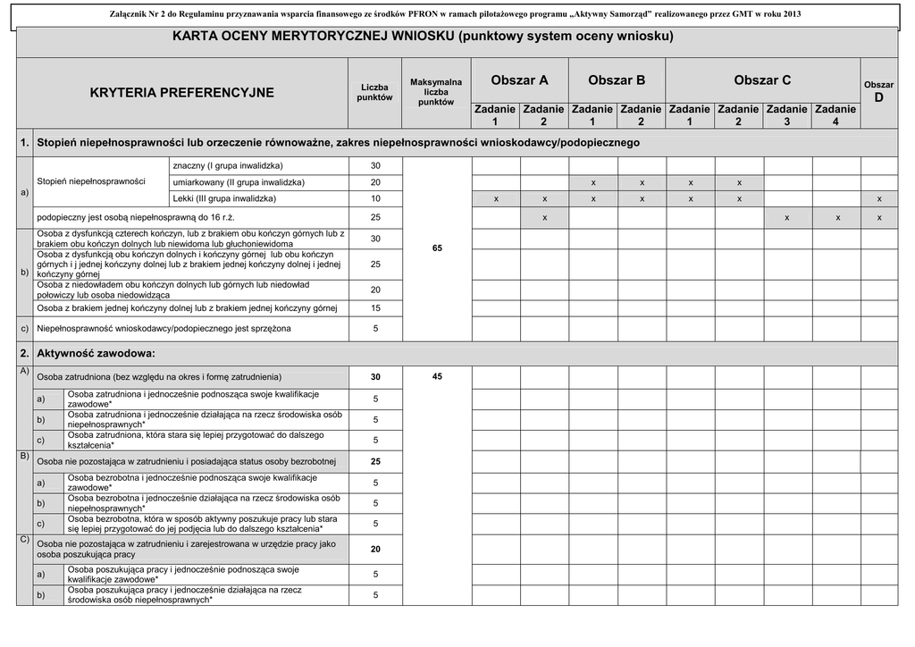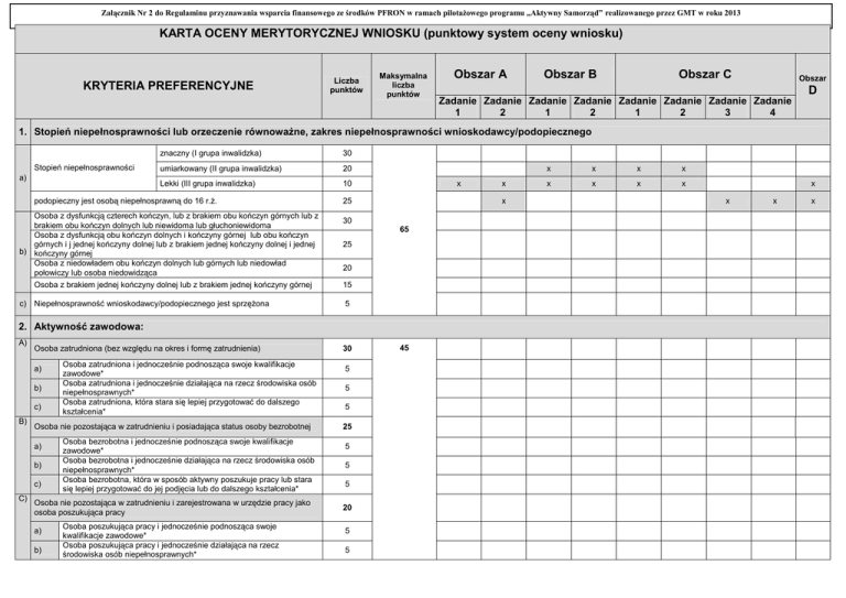 Załącznik Nr 2 do Regulaminu przyznawania wsparcia finansowego ze środków PFRON w ramach pilotażowego programu „Aktywny Samorząd” realizowanego przez GMT w roku 2013 KARTA OCENY MERYTORYCZNEJ WNIOSKU (punktowy system oceny wniosku) KRYTERIA PREFERENCYJNE Liczba punktów Maksymalna liczba punktów Obszar A Obszar B Obszar C Obszar D Zadanie Zadanie Zadanie Zadanie Zadanie Zadanie Zadanie Zadanie 1 2 1 2 1 2 3 4 1. Stopień niepełnosprawności lub orzeczenie równoważne, zakres niepełnosprawności wnioskodawcy/podopiecznego Stopień niepełnosprawności a) znaczny (I grupa inwalidzka) 30 umiarkowany (II grupa inwalidzka) 20 Lekki (III grupa inwalidzka) 10 podopieczny jest osobą niepełnosprawną do 16 r.ż. Osoba z dysfunkcją czterech kończyn, lub z brakiem obu kończyn górnych lub z brakiem obu kończyn dolnych lub niewidoma lub głuchoniewidoma Osoba z dysfunkcją obu kończyn dolnych i kończyny górnej lub obu kończyn górnych i j jednej kończyny dolnej lub z brakiem jednej kończyny dolnej i jednej b) kończyny górnej Osoba z niedowładem obu kończyn dolnych lub górnych lub niedowład połowiczy lub osoba niedowidząca Osoba z brakiem jednej kończyny dolnej lub z brakiem jednej kończyny górnej c) Niepełnosprawność wnioskodawcy/podopiecznego jest sprzężona x 25 x 30 65 25 20 15 5 2. Aktywność zawodowa: A) Osoba zatrudniona (bez względu na okres i formę zatrudnienia) a) b) c) B) Osoba nie pozostająca w zatrudnieniu i posiadająca status osoby bezrobotnej a) b) c) C) Osoba zatrudniona i jednocześnie podnosząca swoje kwalifikacje zawodowe* Osoba zatrudniona i jednocześnie działająca na rzecz środowiska osób niepełnosprawnych* Osoba zatrudniona, która stara się lepiej przygotować do dalszego kształcenia* Osoba bezrobotna i jednocześnie podnosząca swoje kwalifikacje zawodowe* Osoba bezrobotna i jednocześnie działająca na rzecz środowiska osób niepełnosprawnych* Osoba bezrobotna, która w sposób aktywny poszukuje pracy lub stara się lepiej przygotować do jej podjęcia lub do dalszego kształcenia* Osoba nie pozostająca w zatrudnieniu i zarejestrowana w urzędzie pracy jako osoba poszukująca pracy a) b) Osoba poszukująca pracy i jednocześnie podnosząca swoje kwalifikacje zawodowe* Osoba poszukująca pracy i jednocześnie działająca na rzecz środowiska osób niepełnosprawnych* 30 5 5 5 25 5 5 5 20 5 5 x 45 x x x x x x x x x x x x Załącznik Nr 2 do Regulaminu przyznawania wsparcia finansowego ze środków PFRON w ramach pilotażowego programu „Aktywny Samorząd” realizowanego przez GMT w roku 2013 c) Osoba poszukująca pracy, która w sposób aktywny poszukuje pracy lub stara się lepiej przygotować do jej podjęcia lub do dalszego kształcenia* KRYTERIA PREFERENCYJNE 5 Liczba punktów Maksymalna liczba punktów Obszar A Zadanie 1 Zadanie 2 Obszar B Zadanie 1 Zadanie 2 Obszar C Zadanie 1 Zadanie 2 Zadanie 3 Obszar Zadanie 4 D 3. Aktualnie realizowany etap kształcenia: a) Osoba rozpoczynająca i kontynuująca studia (studia wyższe, podyplomowe, studia doktoranckie, przewód doktorski) 70 b) Osoba rozpoczynająca i kontynuująca naukę w szkole ponadgimnazjalnej 60 c) Dziecko do 18 r.ż. realizujące obowiązek szkolny w tym: 50 x x x x d) osiągające dobre wyniki w nauce (średnia powyżej 4,0) lub biorące udział w konkursach albo w olimpiadach szkolnych, wyróżnienia, wolontariat* 10 x x x x x x x x x x x 4. Inne kryteria: a) Wnioskodawca/podopieczny nie otrzymał dotąd dofinansowania ze środków PFRON na zakup przedmiotu dofinansowania objętego wnioskiem 5 b) dodatkowe osoby niepełnosprawne w gospodarstwie domowym wnioskodawcy/podopiecznego 5 c) uzasadnienie wyboru danego przedmiotu dofinansowania (pkt. 3.1 wniosku) 20 d) wniosek był kompletny w dniu przyjęcia 5 e) Wnioskodawca/podopieczny nie przekracza kryterium dochodowego 10 f) szczególne utrudnienia Wnioskodawcy 5 g) dotyczy wyłącznie Obszaru C Zadanie nr 1 i 2 – w budynku, w którym mieszka Wnioskodawca nie ma barier architektonicznych (istnieje możliwość samodzielnego poruszania się wózkiem) dotyczy wyłącznie Obszaru C Zadanie nr 1 – Wnioskodawca zamierza zakupić wózek typu skuter h) 70 x 55 5 x x x x -20 x x x x 230 230 230 230 235 235 230 230 230 115 115 115 115 120 120 115 115 115 RAZEM OCENA WNIOSKU (1-4) 235 MAKSYMALNA LICZBA PUNKTÓW Minimalna liczba punktów, uprawniająca do uzyskania dofinansowania wynosi Uwagi: