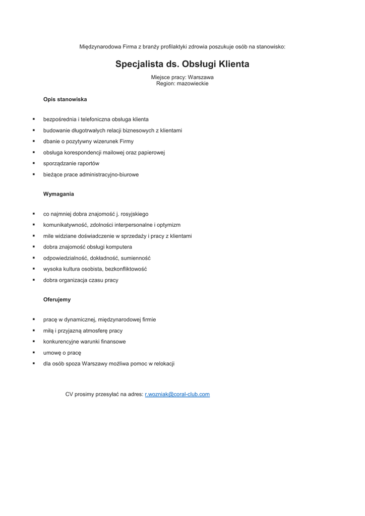 Międzynarodowa Firma z branży profilaktyki zdrowia poszukuje osób na stanowisko: Specjalista ds. Obsługi Klienta Miejsce pracy: Warszawa Region: mazowieckie Opis stanowiska bezpośrednia i telefoniczna obsługa klienta budowanie długotrwałych relacji biznesowych z klientami dbanie o pozytywny wizerunek Firmy obsługa korespondencji mailowej oraz papierowej sporządzanie raportów bieżące prace administracyjno-biurowe Wymagania co najmniej dobra znajomość j. rosyjskiego komunikatywność, zdolności interpersonalne i optymizm mile widziane doświadczenie w sprzedaży i pracy z klientami dobra znajomość obsługi komputera odpowiedzialność, dokładność, sumienność wysoka kultura osobista, bezkonfliktowość dobra organizacja czasu pracy Oferujemy pracę w dynamicznej, międzynarodowej firmie miłą i przyjazną atmosferę pracy konkurencyjne warunki finansowe umowę o pracę dla osób spoza Warszawy możliwa pomoc w relokacji CV prosimy przesyłać na adres: [email protected]
