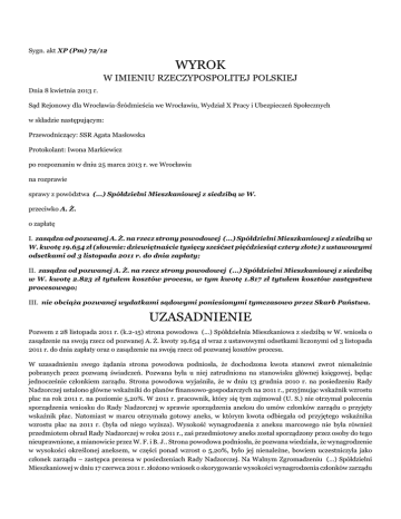 Sygn. akt XP (Pm) 72/12 WYROK W IMIENIU RZECZYPOSPOLITEJ POLSKIEJ Dnia 8 kwietnia 2013 r. Sąd Rejonowy dla Wrocławia-Śródmieścia we Wrocławiu, Wydział X Pracy i Ubezpieczeń Społecznych w składzie następującym: Przewodniczący: SSR Agata Masłowska Protokolant: Iwona Markiewicz po rozpoznaniu w dniu 25 marca 2013 r. we Wrocławiu na rozprawie sprawy z powództwa (...) Spółdzielni Mieszkaniowej z siedzibą w W. przeciwko A. Ż. o zapłatę I. zasądza od pozwanej A. Ż. na rzecz strony powodowej (...) Spółdzielni Mieszkaniowej z siedzibą w W. kwotę 19.654 zł (słownie: dziewiętnaście tysięcy sześćset pięćdziesiąt cztery złote) z ustawowymi odsetkami od 3 listopada 2011 r. do dnia zapłaty; II. zasądza od pozwanej A. Ż. na rzecz strony powodowej (...) Spółdzielni Mieszkaniowej z siedzibą w W. kwotę 2.823 zł tytułem kosztów procesu, w tym kwotę 1.817 zł tytułem kosztów zastępstwa procesowego; III. nie obciąża pozwanej wydatkami sądowymi poniesionymi tymczasowo przez Skarb Państwa. UZASADNIENIE Pozwem z 28 listopada 2011 r. (k.2-15) strona powodowa (...) Spółdzielnia Mieszkaniowa z siedzibą w W. wniosła o zasądzenie na swoją rzecz od pozwanej A. Ż. kwoty 19.654 zł wraz z ustawowymi odsetkami liczonymi od 3 listopada 2011 r. do dnia zapłaty oraz o zasądzenie na swoją rzecz od pozwanej kosztów procesu. W uzasadnieniu swego żądania strona powodowa podniosła, że dochodzona kwota stanowi zwrot nienależnie pobranych przez pozwaną świadczeń. Pozwana była u niej zatrudniona na stanowisku głównej księgowej, będąc jednocześnie członkiem zarządu. Strona powodowa wyjaśniła, że w dniu 13 grudnia 2010 r. na posiedzeniu Rady Nadzorczej ustalono główne wskaźniki do planów finansowo-gospodarczych na 2011 r., przyjmując wskaźnik wzrostu płac na rok 2011 r. na poziomie 5,20%. W 2011 r. pracownik, który się tym zajmował (U. S.) nie otrzymał polecenia sporządzenia wniosku do Rady Nadzorczej w sprawie sporządzenia aneksu do umów członków zarządu o przyjęty wskaźnik płac. Natomiast w marcu otrzymała gotowy aneks, w którym kwota odbiegała od przyjętego wskaźnika wzrostu płac na 2011 r. (była od niego wyższa). Wysokość wynagrodzenia z aneksu marcowego nie była również przedmiotem obrad Rady Nadzorczej w roku 2011 r., zaś przedmiotowy aneks został sporządzony przez osoby do tego nieuprawnione, a mianowicie przez W. F. i B. J.. Strona powodowa podniosła, że pozwana wiedziała, że wynagrodzenie w wysokości określonej aneksem, w części ponad wzrost o 5,20%, było jej nienależne, bowiem uczestniczyła jako członek zarządu – zastępca prezesa w posiedzeniach Rady Nadzorczej. Na Walnym Zgromadzeniu (...) Spółdzielni Mieszkaniowej w dniu 17 czerwca 2011 r. złożono wniosek o skorygowanie wysokości wynagrodzenia członków zarządu od 1 stycznia 2011 r. i dostosowanie go do przyjętego wskaźnika wzrostu płac. W związku z tym w dniu 29 czerwca 2011 r. spisano aneks do umowy o pracę pozwanej, ustalając wysokość wynagrodzenia w kwocie 3.840 zł. Jednocześnie zobowiązano pozwaną do zwrotu nienależnie pobranego wynagrodzenia tj. różnicy pomiędzy faktycznie otrzymanym a należnym wynagrodzeniem na podstawie aneksu z dnia 29 czerwca 2011 r. Strona powodowa wyjaśniła ponadto, że wskutek przeprowadzaj w dniach 6-29 lipca 2011 r. kontroli, Komisja Rewizyjna Rady Nadzorczej ustaliła, że na podstawie aneksu sporządzonego w marcu 2011 r., przewidującego wysokość płacy zasadniczej pozwanej na poziomie 4.200 zł, wyrównano płacę pozwanej od stycznia i na bieżąco naliczano wg niego wynagrodzenie od maja 2011 r. Wyrównanie wynagrodzenia wypłacano w kwietniu w wysokości 1.925 zł. W części (co do kwoty 1.260 zł) było ono nienależne pozwanej. Natomiast w okresie od marca do maja 2011 r. wypłacono pozwanej zawyżoną kwotę z tytułu bezprawnej podwyżki wynagrodzenia w wysokości 2.052 zł, co dało łącznie kwotę 3.312 zł. Z kolei od drugiej połowy 2008 r. do połowy 2011 r. pozwana nienależnie pobrała wynagrodzenie w kwocie 16.342 zł, które na liście płac określane było jako „inne dodatki”. W dniu 23 sierpnia 2011 r. pozwana zwróciła stronie powodowej kwotę 1.000 zł z przeznaczeniem na spłatę nienależnego wynagrodzenia, które strona powodowa zaliczyła na najdawniej wymagalne wypłacone za październik i listopad 2008 r. Wobec powyższego do zapłaty za drugie półrocze 2008 r. pozostała kwota 550 zł. W 2009 r. pozwana pobrała nienależne wynagrodzenie tytułem „innych dodatków” w kwocie 5.282 zł, w 2010 r. była to kwota 6.710 zł, a w 2011 r. – 3.800 zł. W dniu 15 września 2011 r. zarząd strony powodowej skierował do pozwanej wezwanie do zapłaty kwoty 6.832 zł. Strona powodowa wyjaśniła również, iż zasady przyznawania dodatkowego wynagrodzenia za obsługę wspólnot mieszkaniowych zostały ustalone w roku 2005 r. i nie dotyczyły członków zarządu. Podkreśliła również, że pozwana uznała roszczenie, zobowiązując się w dniu 18 lipca 2011 r. do zapłaty kwoty 10.510 zł, która stanowiła sumę wypłat z tytułu „innych dodatków” za lata 2010-2011. Odsetek strona powodowa domagała się od 3 listopada 2011 r., bowiem w dniu 2 listopada 2011 r. minął czternastodniowy termin do zapłaty określony w wezwaniu do zapłaty z dnia 18 października 2011 r. Nakazem zapłaty z 7 grudnia 2011 r. (k.262), wydanym w postępowaniu upominawczym, Sąd w całości uwzględnił powództwo. Pozwana A. Ż. wniosła sprzeciw od tego nakazu (k.265-267), domagając się oddalenia powództwa w całości oraz zasądzenia od strony powodowej na swoją rzecz kosztów procesu. Uzasadniając swoje stanowisko pozwana podniosła, że wszystkie dołączone do pozwu dowody w postaci kserokopii dokumentów nie mogły stanowić dowodu w sprawie, bowiem nie zostały potwierdzone za zgodność z oryginałem. Wnioski dowodowe w tym zakresie powinny wi