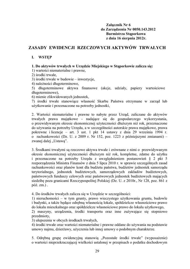 Załącznik Nr 6 do Zarządzenia Nr 0050.143.2012 Burmistrza Stąporkowa z dnia 16 sierpnia 2012r. ZASADY EWIDENCJI RZECZOWYCH AKTYWÓW TRWAŁYCH I. WSTĘP 1. Do aktywów trwałych w Urzędzie Miejskiego w Stąporkowie zalicza się: 1) wartości niematerialne i prawne, 2) środki trwałe, 3) środki trwałe w budowie – inwestycje, 4) należności długoterminowe, 5) długoterminowe aktywa finansowe (akcje, udziały, papiery wartościowe długoterminowe), 6) mienie zlikwidowanych jednostek, 7) środki trwałe stanowiące własność Skarbu Państwa otrzymane w zarząd lub użytkowanie i przeznaczone na potrzeby jednostki, 2. Wartości niematerialne i prawne to nabyte przez Urząd, zaliczane do aktywów trwałych prawa majątkowe - nadające się do gospodarczego wykorzystania, o przewidywanym okresie ekonomicznej użyteczności dłuższym niż rok, przeznaczone do używania na potrzeby Urzędu, a w szczególności autorskie prawa majątkowe, prawa pokrewne i licencje – art. 3 ust. 1 pkt 14 ustawy z dnia 29 września 1994 r. o rachunkowości (Dz. U. z 2009 r. Nr 152, poz. 1223 z późniejszymi zmianami) – zwanej dalej „Ustawą”. 3. Środkami trwałymi są rzeczowe aktywa trwałe i zrównane z nimi o przewidywanym okresie ekonomicznej użyteczności dłuższym niż rok, kompletne, zdatne do użytku i przeznaczone na potrzeby Urzędu z uwzględnieniem postanowień § 2 pkt 5 rozporządzenia Ministra Finansów z dnia 5 lipca 2010 r. w sprawie szczególnych zasad rachunkowości oraz planów kont dla budżetu państwa, budżetów jednostek samorządu terytorialnego, jednostek budżetowych, samorządowych zakładów budżetowych, państwowych funduszy celowych oraz państwowych jednostek budżetowych mających siedzibę poza granicami Rzeczypospolitej Polskiej (Dz. U. z 2010r., Nr 128, poz. 861 z póź. zm.) . 4. Do środków trwałych zalicza się w Urzędzie w szczególności: 1) nieruchomości – w tym grunty, prawo wieczystego użytkowania gruntu, budowle i budynki, a także będące odrębną własnością lokale, spółdzielcze własnościowe prawo do lokalu mieszkalnego oraz spółdzielcze własnościowe prawo do lokalu użytkowego, 2) maszyny, urządzenia, środki transportu oraz inne zużywające się stopniowo przedmioty, 3) ulepszenia w obcych środkach trwałych, 4) środki trwałe oraz wartości niematerialne i prawne oddane do używania na podstawie umowy najmu, dzierżawy, użyczenia lub innej umowy o podobnym charakterze. 5. Odrębną grupę ewidencyjną stanowią „Pozostałe środki trwałe” (wyposażenie) o wartości nieprzekraczającej wielkości ustalonej w przepisach o podatku dochodowym 29 od osób prawnych, dla których odpisy amortyzacyjne są uznawane za koszt uzyskania przychodu w 100 % ich wartości w momencie oddania do używania. Do grupy tej zalicza się przedmioty o wartości początkowej powyżej 300,00 zł. i umarza się je jednorazowo w miesiącu przyjęcia do używania. Ewidencja ilościowa takiego wyposażenia prowadzi wydział organizacyjny. 6. Środki trwałe w budowie zgodnie z art. 3 ust. 1 pkt 16 ustawy, to środki trwałe w okresie ich budowy, montażu lub ulepszenia istniejącego środka trwałego. Wszystkie nakłady poniesione przez Urząd w związku z budową i montażem nowego środka trwałego składają się na jego wartość początkową w dniu przyjęcia do użytkowania. Nakłady na ulepszenie środków trwałych ponoszone w trakcie realizacji inwestycji zalicza się do środków trwałych w budowie. Po zakończeniu ulepszenia własnych środków trwałych znajdujących się w ewidencji jednostek organizacyjnych Urzędu zwiększa się ich wartość początkową, natomiast ulepszenia w środkach trwałych (znajdujących się w ewidencji innych podmiotów) są przekazywane jednostkom ewidencjonującym te środki trwałe. Podstawę przekazania nakładów do jednostek stanowi protokół przekazania nakładów zatwierdzony przez Burmistrza lub osobę upoważnioną. 7. Do należności długoterminowych zalicza się należności Urzędu, z wyjątkiem zaliczonych do aktywów finansowych oraz dotyczących dostaw i usług, których termin spłaty przypada w okresie dłuższym niż rok od dnia bilansowego. 8. Pieczę nad składnikami majątku ujętymi w ewidencji księgowej Urzędu sprawują wydziały merytoryczne zgodnie z ich zakresem działania wynikającym z Regulaminu Organizacyjnego Urzędu. II. EWIDENCJA RZECZOWYCH AKTYWÓW TRWAŁYCH 1. Środki trwałe są ewidencjonowane analitycznie w komputerowych księgach inwentarzowych prowadzonych przez Wydział Finansowy, przy wykorzystaniu Systemu Autoryzacji ZETO Olsztyn PUMA – Nowa Gmina-Moduł „Środki trwałe” ( ewidencja analityczna) oraz ewidencja syntetyczna w Module FK: 2. Zakres informacji zawartych w księdze inwentarzowej środków trwałych określają zainteresowane wydziały (inne wydziały Urzędu). Wydziały mogą w razie potrzeby prowadzić dodatkowo pomocnicze księgi inwentarzowe środków trwałych w formie papierowej lub z wykorzystaniem innych programów komputerowych. 3. Mienie zlikwidowanych jednostek, środki trwałe w budowie, należności długoterminowe oraz długoterminowe aktywa finansowe są ewidencjonowane w Module FK na kontach syntetycznych. 4. Ewidencja mienia zlikwidowanych jednostek ujmowana syntetycznie, w układzie poszczególnych zlikwidowanych jednostek jest prowadzona wyłącznie wartościowo w kwotach netto, tzn. w kwotach stanowiących różnicę pomiędzy wartością początkową a wartością umorzenia naliczonego przez zlikwidowaną jednostkę. Ewidencję analityczną, rzeczowo – wartościową w kwotach netto do czasu całkowitego 30 zagospodarowania mienia zlikwidowanej jednostki prowadzi wyznaczony wydział merytorycznie odpowiedzialny, w formie kartotek papierowych. 5. Ewidencja środków trwałych Urzędu prowadzona jest w układzie rodzajowym, określonym obowiązującą Klasyfikacją Środków Trwałych, zwaną dalej KŚT: 0 – grun