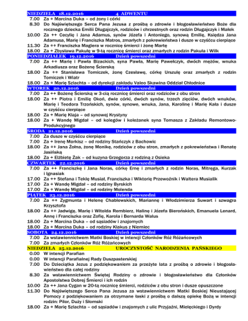 NIEDZIELA 18.12.2016 4 ADWENTU . 7.00 Za + Marcina Duka – od żony i córki 8.30 Do Najświętszego Serca Pana Jezusa z prośbą o zdrowie i błogosławieństwo Boże dla rocznego dziecka Emilii Długajczyk, rodziców i chrzestnych oraz rodzin Długajczyk i Małek 10.00 Za ++ Cecylię i Jana Adamus, synów Józefa i Antoniego, synową Emilię, Księdza Jana Adamusa, Marię i Franciszka Matros, zmarłych z pokrewieństwa i dusze w czyśćcu cierpiące 11.30 Za ++ Franciszka Magiera w rocznicę śmierci i żonę Martę 18.00 Za + Zbysława Pakułę w 9-tą rocznicę śmierci oraz zmarłych z rodzin Pakuła i Wilk PONIEDZIAŁEK 19.12.2016 Dzień powszedni . 7.00 Za ++ Marię i Pawła Bizackich, syna Pawła, Marię Pawełczyk, dwóch mężów, wnuka Arkadiusza oraz Bożenę Ścierską 18.00 Za ++ Stanisława Tomiczek, żonę Czesławę, córkę Urszulę oraz zmarłych z rodzin Tomiczek i Wiatr 18.00 Za + Marię Szlachta – od dyrekcji zakładu Valeo Skawina Oddział Chłodnice WTOREK 20.12.2016 Dzień powszedni . 7.00 Za ++ Bożenę Ścierską w 3-cią rocznicę śmierci oraz rodziców z obu stron 18.00 Za ++ Piotra i Emilię Okoń, dwie córki, dwóch synów, trzech zięciów, dwóch wnuków, Marię i Teodora Trzońskich, synów, synowe, wnuka, Jana, Karolinę i Marię Kała i dusze w czyśćcu cierpiące 18.00 Za + Marię Klaja – od synowej Krystyny 18.00 Za + Wandę Migdał – od kolegów i koleżanek syna Tomasza z Zakładu RemontowoProdukcyjnego ŚRODA 21.12.2016 Dzień powszedni . 7.00 Za dusze w czyśćcu cierpiące 7.00 Za + Irenę Morkisz – od rodziny Stańczyk z Bachowic 18.00 Za ++ Jana Żołna, żonę Monikę, rodziców z obu stron, zmarłych z pokrewieństwa i Renatę Jasińską 18.00 Za + Elżbietę Żak – od kuzyna Grzegorza z rodziną z Osieka CZWARTEK 22.12.2016 Dzień powszedni . 7.00 Za ++ Franciszkę i Jana Noras, córkę Ernę i zmarłych z rodzin Noras, Mitręga, Kurzak i Ignasiak 17.00 Za ++ Stefana i Teklę Musiał, Franciszka i Wiktorię Przewoźnik i Waltera Musialik 17.00 Za + Wandę Migdał – od rodziny Byrskich 17.00 Za + Wandę Migdał – od rodziny Molenda PIĄTEK 23.12.2016 Dzień powszedni . 7.00 Za ++ Zygmunta i Helenę Chablewskich, Mariannę i Włodzimierza Suwart i szwagra Krzysztofa 18.00 Za ++ Jadwigę, Marię i Witolda Rembierz, Halinę i Józefa Bierońskich, Emanuela Lenard, Annę i Franciszka oraz Zofię, Karola i Bernarda Walus 18.00 Za + Marcina Duka – od sąsiadów i znajomych 18.00 Za + Marcina Duka – od rodziny Klakus z Niemiec SOBOTA 24.12.2016 Dzień powszedni . 7.00 Za wstawiennictwem Matki Boskiej w intencji Członków Róż Różańcowych 7.00 Za zmarłych Członków Róż Różańcowych NIEDZIELA 25.12.2016 UROCZYSTOŚĆ NARODZENIA PAŃSKIEGO . 0.00 W intencji Parafian 0.00 W intencji Parafialnej Rady Duszpasterskiej 7.00 Do Dzieciątka Jezus z podziękowaniem za przeżyte lata z prośbą o zdrowie i błogosławieństwo dla całej rodziny 8.30 Za wstawiennictwem Świętej Rodziny o zdrowie i błogosławieństwo dla Członków Apostolstwa Dobrej Śmierci i ich rodzin 10.00 Za ++ Jana Cygan w 20-tą rocznicę śmierci, rodziców z obu stron i dusze opuszczone 11.30 Do Najświętszego Serca Pana Jezusa za wstawiennictwem Matki Boskiej Nieustającej Pomocy z podziękowaniem za otrzymane łaski z prośbą o dalszą opiekę Bożą w intencji rodzin: Pilor, Duży i Słomski 18.00 Za + Marię Szlachta – od sąsiadów i znajomych z ulic Przyjaźni, Mielęckiego i Dyrdy