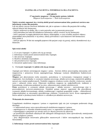 ULOTKA DLA PACJENTA: INFORMACJA DLA PACJENTA ASPARGIN 17 mg jonów magnezu + 54 mg jonów potasu, tabletki Magnesii hydroaspartas + Kalii hydroaspartas Należy uważnie zapoznać się z treścią ulotki przed zastosowaniem leku, ponieważ zawiera ona informacje ważne dla pacjenta. Lek ten należy zawsze stosować dokładnie tak, jak to opisano w ulotce dla pacjenta lub według zaleceń lekarza lub farmaceuty. - Należy zachować tę ulotkę, aby w razie potrzeby móc ją ponownie przeczytać. - Jeśli potrzebna jest rada lub dodatkowa informacja, należy zwrócić się do farmaceuty. - Jeśli u pacjenta wystąpią jakiekolwiek objawy niepożądane, w tym wszelkie możliwe objawy niepożądane niewymienione w tej ulotce, należy powiedzieć o tym lekarzowi lub farmaceucie. Patrz punkt 4. - Jeśli po upływie 30 dni nie nastąpiła poprawa lub pacjent czuje się gorzej, należy skontaktować się z lekarzem. Spis treści ulotki 1. Co to jest Aspargin i w jakim celu się go stosuje. 2. Informacje ważne przed zastosowaniem leku Aspargin. 3. Jak stosować Aspargin. 4. Możliwe działania niepożądane. 5. Jak przechowywać Aspargin. 6. Zawartość opakowania i inne informacje. 1. Co to jest Aspargin i w jakim celu się go stosuje Aspargin jest lekiem zawierającym magnez i potas. Zawiera dobrze przyswajalną mieszaninę soli magnezowej i potasowej kwasu asparaginowego, będącego ważnym składnikiem budulcowym organizmu. Magnez jest aktywatorem wielu enzymów, pośredniczy w wytwarzaniu i transporcie energii w organizmie. Jest niezbędny w czynności mięśnia sercowego, układu nerwowego, mięśniówki gładkiej naczyń oraz mięśni prążkowanych. Niedobór magnezu zwiększa ryzyko choroby wieńcowej, zawału serca i zaburzeń rytmu serca. Objawami niedoboru magnezu są: nadpobudliwość, trudności z koncentracją, zwiększona podatność na stres, zaburzenia pracy mięśni szkieletowych. Potas uczestniczy w czynności układu nerwowego i układu sercowo - naczyniowego oraz w przewodnictwie nerwowo-mięśniowym. Niedobór potasu stanowi zagrożenie dla prawidłowej czynności układu krwionośnego, układu wydalniczego i regulacji gospodarki wodno – elektrolitowej (odpowiedzialnej za utrzymanie prawidłowego ciśnienia i kwasowości krwi). Kwas asparaginowy bierze udział w przekazywaniu bodźców w ośrodkowym układzie nerwowym. Wskazania do stosowania: Uzupełnianie niedoboru magnezu i potasu w organizmie (gdy nie jest wymagane podawanie drogą dożylną): - w zaburzeniach pracy serca spowodowanych niedoborem magnezu i potasu; - zapobiegawczo w chorobie niedokrwiennej serca i w zagrożeniu zawałem serca; - wspomagająco u pacjentów po zawale serca (w okresie powrotu do zdrowia); - po przebytych chorobach zakaźnych lub zabiegach chirurgicznych, które spowodowały zmniejszenie stężenia magnezu i potasu; - przy długotrwałym stosowaniu glikozydów nasercowych i leków moczopędnych (np. tiazydów, furosemidu). 2. Informacje ważne przed zastosowaniem leku Aspargin 1 Kiedy nie stosować leku Aspargin - jeśli pacjent ma uczulenie (nadwrażliwość) na substancje czynne lub którykolwiek z pozostałych składników leku (wymienione w punkcie 6); - jeśli pacjent ma hipermagnezemię (nadmiar magnezu we krwi); - jeśli pacjent ma hiperkaliemię (nadmiar potasu we krwi); - jeśli pacjent ma ciężką niewydolność nerek (klirens kreatyniny mniejszy od 30 ml/min); - jeśli pacjent ma zakażenia dróg moczowych (pęcherza moczowego, nerek); - jeśli pacjent ma zaburzenia pracy serca (uczucie zbyt wolnego, szybkiego lub nierównego bicia serca); - jeśli pacjent ma myasthenia gravis (rzadka choroba, której towarzyszy zwiotczenie mięśni); - jeśli pacjent ma znaczne niedociśnienie tętnicze krwi. Ostrzeżenia i środki ostrożności Należy zachować ostrożność, jeśli: - u pacjenta występuje ostre odwodnienie, - u pacjenta doszło do rozległego zniszczenia tkanek (np. oparzenia dużych powierzchni ciała), - pacjent stosuje inne leki zawierające potas, - pacjent ma chorobę wrzodową żołądka, - wcześniej stwierdzono u pacjenta nietolerancję niektórych cukrów. Podczas długotrwałego stosowania i w razie wystąpienia biegunki oraz u pacjentów leczonych glikozydami nasercowymi należy kontrolować stężenia potasu i magnezu w surowicy krwi, a w razie potrzeby także w erytrocytach (lekarz zaleci wykonanie odpowiednich analiz). Lek zawiera sacharozę (cukier). Jedna tabletka zawiera 53 mg sacharozy. Należy wziąć to pod uwagę u pacjentów chorych na cukrzycę. Jeżeli wcześniej stwierdzono u pacjenta nietolerancję niektórych cukrów, pacjent powinien skontaktować się z lekarzem przed przyjęciem leku. Nie podawać bez wiedzy lekarza w chorobach nowotworowych. Inne leki i Aspargin Należy powiedzieć lekarzowi lub farmaceucie o wszystkich lekach przyjmowanych obecnie lub ostatnio a także o lekach, które pacjent planuje stosować. Nie należy stosować leku Aspargin jednocześnie z następującymi lekami: - antybiotyki z grupy tetracyklin, gdyż sole magnezu zmniejszają wchłanianie tych antybiotyków; należy zachować co najmniej 3-godzinną przerwę pomiędzy podaniem tych leków; - doustne leki przeciwzakrzepowe pochodne kumaryny, fluorochinolony, fluor; - leki i suplementy diety zawierające fosforany, wapń i żelazo, gdyż magnez zmniejsza ich wchłanianie; - atropina lub hioscyjamina, gdyż wzrasta ryzyko owrzodzeń jelita, które może wystąpić przy doustnym przyjmowaniu soli potasu. Glikozydy naparstnicy (leki nasercowe) stosowane w połączeniu z potasem mogą prowadzić do zaburzeń rytmu serca. Leki moczopędne (amiloryd, spironolakton, triamteren) oraz inhibitory konwertazy angiotensyny (leki stosowane w chorobach układu krążenia, np. kaptopryl i enalapryl) powodują wzrost stężenia potasu we krwi. Antybiotyki aminoglikozydowe, leki moczopędne pętlowe, cisplatyna, cykloseryna, mitramycyna, amfoterycyna B oraz mineralokortykosteroidy nas