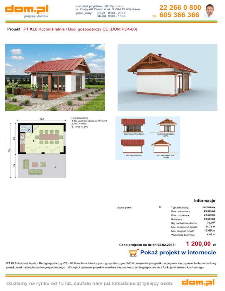 sprzedaż projektów: IMO Sp. z o.o., ul. Grupy AK Północ 4 lok. 9, 00-713 Warszawa pracujemy: pn-pt 8:00 - 20:00 sb-nd 9:00 - 15:00 22 266 0 800 tel. 605 366 366 Projekt PT KL6 Kuchnia letnia / Bud. gospodarczy CE (DOM PD4-86) Rzut przyziemia 1. Biesiadzisko ogrodowe 19.75m2 2. WC 1.47m2 3. Taras 19.6m2 Informacje Liczba pokoi: 3 Typ zabudowy: parterowy Pow. zabudowy: 26,02 m2 Pow. użytkowa: 21,22 m2 Kubatura: 68,00 m3 Kąt nachylenia dachu: 30,00 0 Min. szerokość działki: 11,75 m Min. długość działki: 13,05 m Wysokość budynku: 4,56 m Cena projektu na dzień 02.02.2017: 1 200,00 zł Pokaż projekt w internecie PT KL6 Kuchnia letnia / Bud.gospodarczy CE - KL6 kuchnia letnia z pom.gospodarczym, WC ii tarasemW przypadku ubiegania się o pozwolenie na budowę projekt nosi nazwą budynku gospodarczego. W części opisowej projektu znajduje się pomieszczenie gospodarcze z funkcjami aneksu kuchennego. Działamy na rynku od 15 lat. Zaufało nam już kilkadziesiąt tysięcy osób.