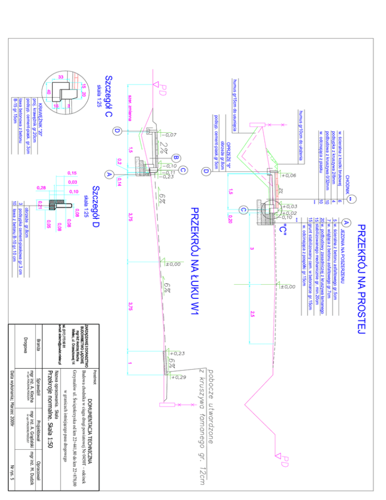 enia B D C CHODNIK A B 6 4 10 10 30 C JEZDNIA NA POSZERZENIU PRZEKRÓJ NA PROSTEJ A 5 w. cieralna z betonu asfaltowego gr.5cm ca z betonu asfaltowego gr.7cm 7 w. wi 20 w. podbudowy zasadniczej z kruszywa amanego 15 stabilizowanego mechanicznie gr. min.20cm 15 grunt stabilizowany cem. w betoniarce gr.15cm w. odcinaj ca z pospó ki gr.15cm 62 "C" PRZEKRÓJ NA UKU W1 obrze e gr.8cm 3 podsypka cement-piaskowa gr.3 cm 10 awa z betonu B-10 gr.10 cm skala 1:25 Szczegó D w. cieralna z kostki brukowej podsypka z kruszywa 2/8mm podbudowa z kruszywa 0/32mm w. odcinaj ca z piasku humus gr10cm do u D humus gr15cm do usuni cia OPRZE E "8" obrze e gr.8cm podsyp. cement-piask.gr 5cm Szczegó C skala 1:25 KRAW NIK "20" proj. kraw nik gr.20cm podsyp. cement-piask. gr.3cm awa betonowa z betonu B-15 gr.15cm Bran a Drogowa Przedmiot DOMUMENTACJA TECHNICZNA Budowa chodnika w ci gu drogi powiatowej Nr 0450T – odcinek Grzyma ów ul. wi tokrzyska od km 22+441,80 do km 22+878,00 w granicach istniej cego pasa drogowego Nazwa opracowania. Skala nr upr.PDK/0090/POOD/07 Nr rys. 5 Projektowa Opracowa mgr in . A. Gr dalski mgr in . M. Dudzik Przekroje normalne. Skala 1:50 nr upr.PDK/0046/POOD/04 Sprawdzi mgr in . A. Klecha Data wykonania; Marzec 2009r