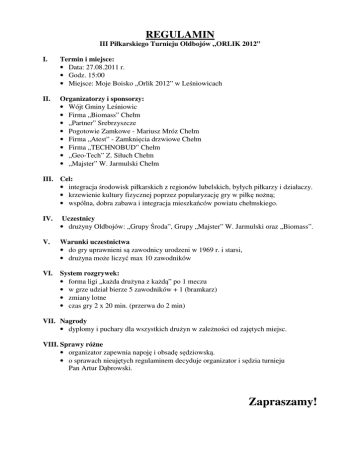 REGULAMIN III Piłkarskiego Turnieju Oldbojów „ORLIK 2012” I. Termin i miejsce: • Data: 27.08.2011 r. • Godz. 15:00 • Miejsce: Moje Boisko „Orlik 2012” w Leśniowicach II. Organizatorzy i sponsorzy: • Wójt Gminy Leśniowic • Firma „Biomass” Chełm • „Partner” Srebrzyszcze • Pogotowie Zamkowe - Mariusz Mróz Chełm • Firma „Atest” - Zamknięcia drzwiowe Chełm • Firma „TECHNOBUD” Chełm • „Geo-Tech” Z. Siłuch Chełm • „Majster” W. Jarmulski Chełm III. Cel: • integracja środowisk piłkarskich z regionów lubelskich, byłych piłkarzy i działaczy. • krzewienie kultury fizycznej poprzez popularyzację gry w piłkę nożną; • wspólna, dobra zabawa i integracja mieszkańców powiatu chełmskiego. IV. Uczestnicy • drużyny Oldbojów: „Grupy Środa”, Grupy „Majster” W. Jarmulski oraz „Biomass”. V. Warunki uczestnictwa • do gry uprawnieni są zawodnicy urodzeni w 1969 r. i starsi, • drużyna może liczyć max 10 zawodników VI. System rozgrywek: • forma ligi „każda drużyna z każdą” po 1 meczu • w grze udział bierze 5 zawodników + 1 (bramkarz) • zmiany lotne • czas gry 2 x 20 min. (przerwa do 2 min) VII. Nagrody • dyplomy i puchary dla wszystkich drużyn w zależności od zajętych miejsc. VIII. Sprawy różne • organizator zapewnia napoję i obsadę sędziowską. • o sprawach nieujętych regulaminem decyduje organizator i sędzia turnieju Pan Artur Dąbrowski. Zapraszamy!