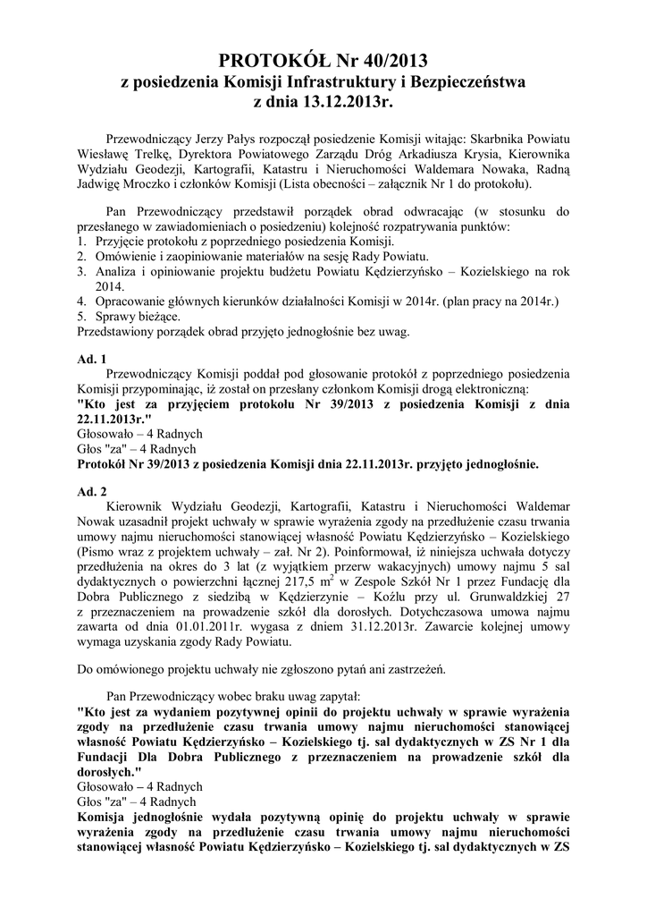 PROTOKÓŁ Nr 40/2013 z posiedzenia Komisji Infrastruktury i Bezpieczeństwa z dnia 13.12.2013r. Przewodniczący Jerzy Pałys rozpoczął posiedzenie Komisji witając: Skarbnika Powiatu Wiesławę Trelkę, Dyrektora Powiatowego Zarządu Dróg Arkadiusza Krysia, Kierownika Wydziału Geodezji, Kartografii, Katastru i Nieruchomości Waldemara Nowaka, Radną Jadwigę Mroczko i członków Komisji (Lista obecności – załącznik Nr 1 do protokołu). Pan Przewodniczący przedstawił porządek obrad odwracając (w stosunku do przesłanego w zawiadomieniach o posiedzeniu) kolejność rozpatrywania punktów: 1. Przyjęcie protokołu z poprzedniego posiedzenia Komisji. 2. Omówienie i zaopiniowanie materiałów na sesję Rady Powiatu. 3. Analiza i opiniowanie projektu budżetu Powiatu Kędzierzyńsko – Kozielskiego na rok 2014. 4. Opracowanie głównych kierunków działalności Komisji w 2014r. (plan pracy na 2014r.) 5. Sprawy bieżące. Przedstawiony porządek obrad przyjęto jednogłośnie bez uwag. Ad. 1 Przewodniczący Komisji poddał pod głosowanie protokół z poprzedniego posiedzenia Komisji przypominając, iż został on przesłany członkom Komisji drogą elektroniczną: "Kto jest za przyjęciem protokołu Nr 39/2013 z posiedzenia Komisji z dnia 22.11.2013r." Głosowało – 4 Radnych Głos "za" – 4 Radnych Protokół Nr 39/2013 z posiedzenia Komisji dnia 22.11.2013r. przyjęto jednogłośnie. Ad. 2 Kierownik Wydziału Geodezji, Kartografii, Katastru i Nieruchomości Waldemar Nowak uzasadnił projekt uchwały w sprawie wyrażenia zgody na przedłużenie czasu trwania umowy najmu nieruchomości stanowiącej własność Powiatu Kędzierzyńsko – Kozielskiego (Pismo wraz z projektem uchwały – zał. Nr 2). Poinformował, iż niniejsza uchwała dotyczy przedłużenia na okres do 3 lat (z wyjątkiem przerw wakacyjnych) umowy najmu 5 sal dydaktycznych o powierzchni łącznej 217,5 m2 w Zespole Szkół Nr 1 przez Fundację dla Dobra Publicznego z siedzibą w Kędzierzynie – Koźlu przy ul. Grunwaldzkiej 27 z przeznaczeniem na prowadzenie szkół dla dorosłych. Dotychczasowa umowa najmu zawarta od dnia 01.01.2011r. wygasa z dniem 31.12.2013r. Zawarcie kolejnej umowy wymaga uzyskania zgody Rady Powiatu. Do omówionego projektu uchwały nie zgłoszono pytań ani zastrzeżeń. Pan Przewodniczący wobec braku uwag zapytał: "Kto jest za wydaniem pozytywnej opinii do projektu uchwały w sprawie wyrażenia zgody na przedłużenie czasu trwania umowy najmu nieruchomości stanowiącej własność Powiatu Kędzierzyńsko – Kozielskiego tj. sal dydaktycznych w ZS Nr 1 dla Fundacji Dla Dobra Publicznego z przeznaczeniem na prowadzenie szkół dla dorosłych." Głosowało – 4 Radnych Głos "za" – 4 Radnych Komisja jednogłośnie wydała pozytywną opinię do projektu uchwały w sprawie wyrażenia zgody na przedłużenie czasu trwania umowy najmu nieruchomości stanowiącej własność Powiatu Kędzierzyńsko – Kozielskiego tj. sal dydaktycznych w ZS Nr 1 dla Fundacji Dla Dobra Publicznego z przeznaczeniem na prowadzenie szkół dla dorosłych. Kolejno Kierownik Wydziału Geodezji omówił projekt uchwały w sprawie wyrażenia zgody na przedłużenie czasu trwania umowy najmu nieruchomości stanowiącej własność Powiatu Kędzierzyńsko – Kozielskiego (Projekt uchwały – zał. Nr 3a). Wyjaśnił, iż przedmiotem uchwały jest przedłużenie na czas do 3 lat umowy najmu lokalu użytkowego o powierzchni 18,2m2 w Zespole Szkół Żeglugi Śródlądowej Pani Alicji Jędrzejas z przeznaczeniem na prowadzenie gabinetu stomatologicznego. Dotychczasowa umowa wygasa z dniem 31.12.2013r. Zawarcie kolejnej umowy jest obwarowane uzyskaniem zgody Rady Powiatu. Do w/w projektu uchwały nie zgłoszono uwag. Przewodniczący Jerzy Pałys poddał pod głosowanie zapytanie: "Kto jest za pozytywnym zaopiniowaniem projektu uchwały w sprawie wyrażenia zgody na przedłużenie czasu trwania umowy najmu nieruchomości stanowiącej własność Powiatu Kędzierzyńsko – Kozielskiego tj. lokalu w ZSŻŚ dla Pani Alicji Jędrzejas w celu prowadzenia gabinetu stomatologicznego." Głosowało – 4 Radnych Głos "za" – 4 Radnych Komisja Infrastruktury i Bezpieczeństwa jednogłośnie pozytywnie zaopiniowała projekt uchwały w sprawie wyrażenia zgody na przedłużenie czasu trwania umowy najmu nieruchomości stanowiącej własność Powiatu Kędzierzyńsko – Kozielskiego tj. lokalu w ZSŻŚ dla Pani Alicji Jędrzejas w celu prowadzenia gabinetu stomatologicznego. Kierownik Wydziału Geodezji, Kartografii, Katastru i Nieruchomości Waldemar Nowak omówił następnie projekt uchwały w sprawie wyrażenia zgody na zbycie w trybie przetargowym prawa własności nieruchomości stanowiącej własność Powiatu Kędzierzyńsko – Kozielskiego. (Projekt uchwały - Zał. Nr 3b). Poinformował, że przedmiotem uchwały jest umożliwienie zbycia w trybie przetargu nieograniczonego zlokalizowanej przy ul. Judyma 4 nieruchomości oznaczonej jako działka 1043/9 zabudowanej budynkiem o powierzchni 131,70 m2, w którym dotąd spółka cywilna Kormoran na podstawie umowy dzierżawy zawartej z SP ZOZ prowadziła aptekę "Melisa". Z dniem 31.08.2013r. apteka uległa likwidacji, a budynek nie jest użytkowany. Wartość nieruchomości została na podstawie operatu szacunkowego z dnia 15.10.2013r. ustalona na kwotę 350 000 zł. Do uzasadnionego projektu uchwały nie wniesiono uwag ani pytań. Przewodniczący Komisji podał pod głosowanie zapytanie: "Kto jest za pozytywnym zaopiniowaniem projektu uchwały w sprawie wyrażenia zgody na zbycie w trybie przetargowym prawa własności nieruchomości stanowiącej własność Powiatu Kędzierzyńsko – Kozielskiego – tj. nieruchomości po byłej aptece "Melisa" przy ul. Judyma 4." Głosowało – 4 Radnych Głos "za" – 4 Radnych Członkowie Komisji jednogłośnie pozytywnie zaopiniowali projekt uchwały w sprawie wyrażenia zgody na zbycie w trybie przetargowym prawa włas