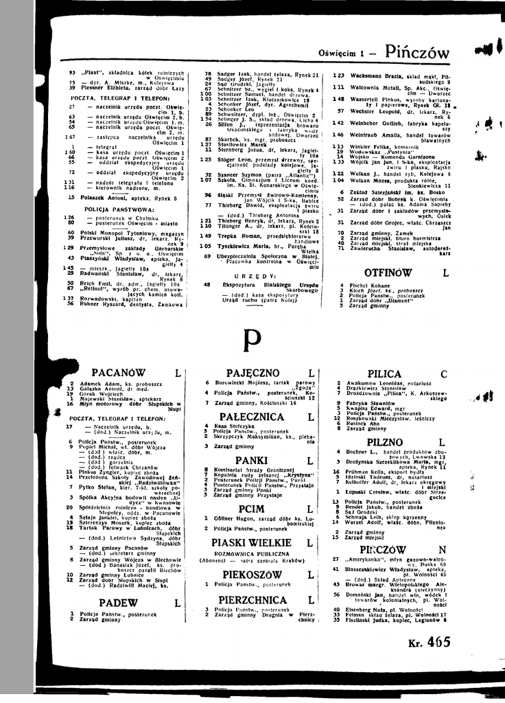 Oświęcim 1 93 73 39 ,,Piast", składnica kółek rolniczych w Oświęcimiu — dyr. A. Miszke, m.. Kolejowa Plessner Elżbieta, zarząd dóbr Łazy POCZTA, TELEORAF 1 TELEFON: 27 — naczelnik urzędu poczt. Oświę cim 1 , b. 63 — naczelnik urzędu Oświęcim 2, b. 54 — naczelnik urzędu Oświęcim 1, m. 65 — naczelnik urzędu poczt. Oświę cim 2, m. 167 — zastępca naczelnika urzędu Oświęcim 1 1 — telegral 160 — kasa urzędu poczt. Oświęcim 1 66 — kasa urzędu poczt. Oświęcim 2 55 — oddział ekspedycyjny urzędu Oświęcim 1 72 — oddział ekspedycyjny urzędu Oświęcim 2 131 — nadzór telegrafu I telefonu 116 — kierownik nadzoru, m. 15 126 80 Polaszek Antoni, apteka, Rynek 5 POLICJA PAŃSTWOWA: — posterunek w Chełmku — posterunek Oświęcim - miasto 60 59 Polski Monopol Tytoniowy, magazyn Przeworski Juliusz, dr, lekarz. Ry nek 9 129 Przemysłowe zakłady Garbarskie „ S o l a " , Sp. z o. o., Oświęcim 43 Ptaszyńskl Władysław, apteka, Ja giełły 4 145 — mleszk., Jagiełły lOa 29 Radwański Stanisław, dr, lekarz, Rynek 8 50 Reich Emil, dr, adw., Jagiełły lOa 67 „Reflnol", wyrób pr. chem. usuwa jących kamień kotl. 137 Rozwadowski, kapitan 56 RUbner Ryszard, dentysta, Zamkowa 78 49 24 67 100 103 4 23 89 154 26 87 127 11 125 32 107 96 77 1U 110 149 109 69 48 Sadger Izak, handel żelaza. Rynek21 Sadger Józef, Rynek 21 Sad Grodzki, Jagiełły Schnltzer Sz., węgiel i koks. Rynek 4 Schnltzer Samuel, handel drzewa. Schnltzer Izak, Klucznikowlce 19 Schönker Józef, dyr. Agrochemli Schönker Leo Schweitzer, dypl. Int., Oświęcim 2 Sellnger J. S., sktad drzewa. Cicha 4 Sllten J., reprezentacja browaru Okocimskiego i labryka wody sodowej. Dworzec Skarbek, ks. mgr, proboszcz Stasllowlcz Marek Sternberg Jozua, dr, lekarz, Jagieł ły lOa Stöger Leon, przemysł drzewny, spe cjalność podkłady kolejowe, Ja giełły 6 Szancer Szymon (patrz ..Atlantic") Szkoła, Oimnazjum I Liceum koed. im. Ks. St. Konarskiego w Oświę cimiu śląski Przemysł Iwlrowo-Kamlenay, Jan Wójcik I S-ka. Babice Thleberg Dawid, eksploatacja żwiru I plasku — (dod.) Thleberg Antonina Thleberg Henryk, dr, lekarz, Rynek 3 Tlllinger A., dr. M a r z , p l . Kościu szki 18 Trepka Roman, przedsiębiorstwo handlowe Tyszkiewicz Marla, hr., Porębą Wielka Ubezpleczalnla Społeczna w Białej, • Placówka kontrolna w Oświęci miu 1 23 111 148 97 148 146 113 19 14 133 122 104 6 98 31 51 70 8 40 71 - PinCZÓW Wacusmann Bracia, skład mąki, Pił sudskiego 9 Walcownia Metali, Sp. Akc, Oświę cim — Dworzec Wassertell Plnkus, wyroby kartona ży I papierowe, Rynek Ol. 18 Wechsler Leopold, dr, lekarz, Ry nek 6 Welnheber Ootlleb, fabryka kapelu szy Welntraub Amalia, kandel towarów btawatnych Winkler Feliks, komornik Wodowskaz ,,Pustynia" Wojsko — Komenda Garnizonu Wójcik Jan Jan. I S-ka, eksploatacja żwiru 1 plasku. Rajsko Wulkan J., handel ryb, Kolejowa 8 Wulkan Mozes, produkt! rolne, Sienkiewicza 11 Zakład Salezjański ha. ks. Bosko Zarząd dóbr Bobrek k. Oświęcimia (dod.) pałac ks. Adama Sapiehy Zarząd dóbr 1 zakładów przemysło wych. Osiek Zarząd dóbr Grójec, właśc. Chrząszcz Jan Zarząd gminny. Zamek Zarząd miejski, bluzo burmistrza Zarząd miejski, strat miejska Zawierucha Stanisław, autodorożkarz OTFINÓW U R Z Ę D Y : Ekspozytura Bialskiego Urzędu Skarbowego — (dod.) kasa ekspozytury Urząd ruchu (patrz Kolej) L 4 Flschel Kohane 3 Kloch Józef, ks., proboszcz 2 Policja Państw., posterunek 1 Zarząd dóbr „Diament" 5 Zarząd gminny P PACANÓW 2 Adamek Adam, ks. proboszcz 13 Gałązka Antoni, dr med. 19 Górak Wojciech 1 Majewski Stanisław, aptekarz 16 Młyn motorowy dóbr Słupskich w Słupi POCZTA,TELEORAF I TELEFON: 17 — Naczelnik urzędu, b. — (dod.) Naczelnik urz;Ju, m. 6 Policja Państw., posterunek 9 Popiel Michał, w l . dóbr Wójcza — (dod.) właśc. dóbr, m. — (dod.) rządca — (dod.) gorzelnia — (dod.) folwark Chrzanów 11 Plnkus Zyngier, kupiec zboża 14 Przełożona Szkoły Zawodowej Żeń skiej „Radzlwillówka" 7 Pytko Stefan, kier. 7-kl. szkoły po wszechnej 3 Spotka Akcyjna hodowli nasion „ U dycz" w Kwasowle 20 Spółdzielnia rolniczo - handlowa w Stopniej, oddz. w Pacanowie 4 Sztajn Jankiel, kupiec zboża 19 Szterenzys Moszek, kupiec zboża 18 Tartak Parowy w Łubnicach, dóbr Słupskich — (dod.) Leśnictwo Sydzyna, dóbr Słupskich 5 Zarząd gminny Pacanów — (dod.) sekretarz gminny 8 Zarząd gminny Wójcza w Blechowie — (dod ) Banasiak józel, ks. pro boszcz paralH Blechów 10 Zarząd gminny Łubnice 18 Zarząd dóbr Słupskich w Słupi — (dod.) Radziwiłł Maciej, ks. - PADEW 1 8 Policja Państw., posterunek Zarząd gminny PAJĘCZNO 6 L Borowiecki Mojżesz, tartak narowy „Zgoda" 4 Policja Państw., posterunek, Ko ściuszki 12 7 Zarząd gminny, Kościuszki 16 PAŁECZNICA L 4 Kasa Stefczyka 5 Policja Państw., posterunek 2 Skrzypczyk Maksymilian, ks., pleba nia 3 Zarząd gminny PANKI PILICA 2 4 7 9 5 3 12 6 8 PILZNO 4 L 3 8 Komisariat Straży Oranlcznej 7 Kopalnia rudy żelaznej „Krystyna" 2 Posterunek Policji Państw., Panki 4 Posterunek Policji Państw., Przystajń 3 Zarząd gminny Panki 5 Zarząd gminny Przystajń 16 5 7 PCIM 1 2 L Oöllner Hugon, zarząd dóbr ka. Lubomlrskiej Policja Państw., posterunek PIASKI WIELKIE L ROZMÓWNICA PUBLICZNA (Abonenci — latrz centrala Kraków) PIEKOSZÓW 1 Policja Państw., posterunek PIERZCHNICA 3 2 Policja Państw., posterunek Zarząd gminny Drugnia w 1 13 9 8 6 14 2 15 27 L L Pierz chnicy Awakumaw Leonidas, notariusz Drążklevricz Stanisław Drożdżownia „Pilica", K. Arkuszew skiego Fabryka Sławnlów Kwapisz Edward, mgr Policja Państw., posterunek Roszkowski Mieczysław, leśniczy Rusinek Aba Zarząd gminny 41 43 56 40 33 35 Bochner L., handel produktów zbo żowych, Lwowska 13 Drożyńska Szczeklikowa Marla, mgr, apteka, Rynek 11 Friihman Kella, eksport bydła ldzlńsk] Tadeusz, dr, notariusz Kelhoffer Adolf, dr. lekarz okręgowy I miejski Ł
