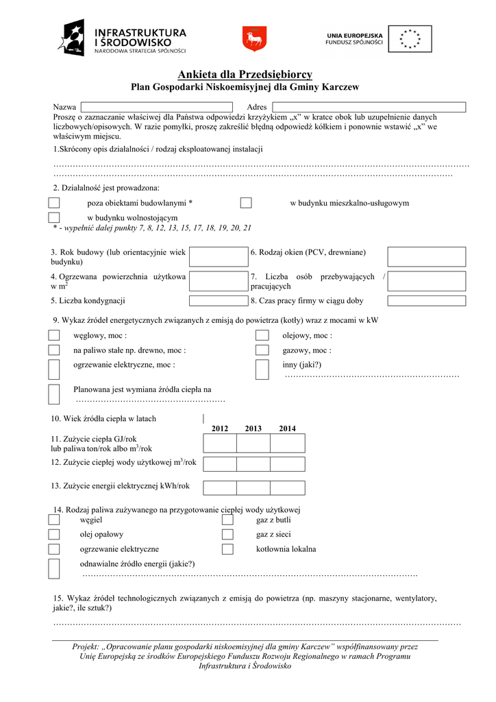 Ankieta dla Przedsiębiorcy Plan Gospodarki Niskoemisyjnej dla Gminy Karczew Nazwa Adres Proszę o zaznaczanie właściwej dla Państwa odpowiedzi krzyżykiem „x” w kratce obok lub uzupełnienie danych liczbowych/opisowych. W razie pomyłki, proszę zakreślić błędną odpowiedź kółkiem i ponownie wstawić „x” we właściwym miejscu. 1.Skrócony opis działalności / rodzaj eksploatowanej instalacji …………………………………………………………………………………………………………………………………… ……………………………………………………………………………………………………………………………… 2. Działalność jest prowadzona: poza obiektami budowlanymi * w budynku mieszkalno-usługowym w budynku wolnostojącym * - wypełnić dalej punkty 7, 8, 12, 13, 15, 17, 18, 19, 20, 21 3. Rok budowy (lub orientacyjnie wiek budynku) 6. Rodzaj okien (PCV, drewniane) 4. Ogrzewana powierzchnia użytkowa w m2 7. Liczba osób pracujących 5. Liczba kondygnacji 8. Czas pracy firmy w ciągu doby przebywających / 9. Wykaz źródeł energetycznych związanych z emisją do powietrza (kotły) wraz z mocami w kW węglowy, moc : olejowy, moc : na paliwo stałe np. drewno, moc : gazowy, moc : ogrzewanie elektryczne, moc : inny (jaki?) ……………………………………………………… Planowana jest wymiana źródła ciepła na ……………………………………………… 10. Wiek źródła ciepła w latach 2012 2013 2014 11. Zużycie ciepła GJ/rok lub paliwa ton/rok albo m3/rok 12. Zużycie ciepłej wody użytkowej m3/rok 13. Zużycie energii elektrycznej kWh/rok 14. Rodzaj paliwa zużywanego na przygotowanie ciepłej wody użytkowej węgiel gaz z butli olej opałowy gaz z sieci ogrzewanie elektryczne kotłownia lokalna odnawialne źródło energii (jakie?) …………………………………………………………………………………………………………. 15. Wykaz źródeł technologicznych związanych z emisją do powietrza (np. maszyny stacjonarne, wentylatory, jakie?, ile sztuk?) ………………………………………………………………………………………………………………………………… Projekt: „Opracowanie planu gospodarki niskoemisyjnej dla gminy Karczew” współfinansowany przez Unię Europejską ze środków Europejskiego Funduszu Rozwoju Regionalnego w ramach Programu Infrastruktura i Środowisko 16. Prace termomodernizacyjne - wymiana okien planowane wykonano - ocieplenie ścian / dachu planowane wykonano - ocieplenie stropu planowane wykonano 17. Liczba samochodów i rodzaj oraz ilość używanego rocznie paliwa? Zużycie w litrach w ciągu roku osobowe Liczba samochodów benzyna szt. LPG szt. diesel szt. bio-diesel szt. dostawcze benzyna LPG diesel bio-diesel szt. szt. szt. szt. ciężarowe benzyna diesel szt. szt. 2012 2013 2014 18. Jaki orientacyjny procent podróży samochodami odbywa się w granicach Gminy? 19. Czy jest Pan/Pani zainteresowany/a udziałem w działaniach Gminy na rzecz redukcji, CO2 na terenie Gminy, poprzez np. wymianę źródeł ciepła na niskoemisyjne? Tak Nie, ponieważ (np. brak funduszy, niedawno wymieniono źródło ciepła, nie widzę sensu takich działań) ………………………………………………………………………………………………… 20. Jeśli „tak” czy jest Pan/Pani skłonny/a wnieść wkład własny? Jaka inwestycja Pana/Panią interesuje? Tak, jaka maksymalnie kwota? Nie …………………….………………..PLN fotowoltaika, solary, pompy ciepła, wiatrak przydomowy, wymian pieca, kocioł na biomasę (właściwe podkreślić) 21. Roczna ilość wytworzonych odpadów komunalnych, niesegregowanych (zmieszanych) [ton] Uwagi lub spostrzeżenia: ……………………………………………………………………………………………………………………… W razie pytań lub wątpliwości prosimy o kontakt z Wykonawcą – Polskim Towarzystwem Biomasy (Kamil Roman, 22 542 11 56, [email protected]), Ankiety można wypełniać w wersji papierowej – wypełnione ankiety należy przekazywać do Urzędu Miejskiego w Karczewie, pokój 43. Ankiety w wersji elektronicznej należy wysyłać na e-mail: [email protected], w terminie do 17 kwietnia 2015 roku. Dziękujemy za współpracę! Projekt: „Opracowanie planu gospodarki niskoemisyjnej dla gminy Karczew” współfinansowany przez Unię Europejską ze środków Europejskiego Funduszu Rozwoju Regionalnego w ramach Programu Infrastruktura i Środowisko