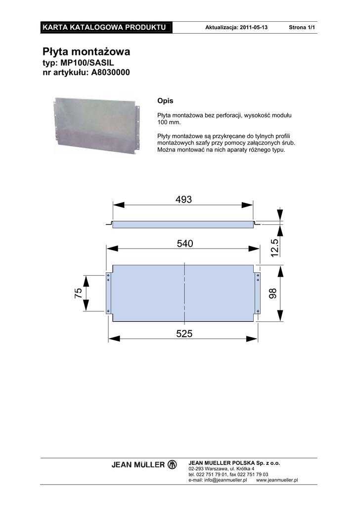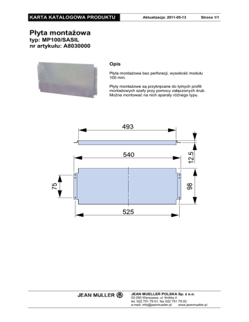 KARTA KATALOGOWA PRODUKTU Aktualizacja: 2011-05-13 Strona 1/1 Płyta montażowa typ: MP100/SASIL nr artykułu: A8030000 Opis Płyta montażowa bez perforacji, wysokość modułu 100 mm. Płyty montażowe są przykręcane do tylnych profili montażowych szafy przy pomocy załączonych śrub. Można montować na nich aparaty różnego typu. JEAN MUELLER POLSKA Sp. z o.o. 02-293 Warszawa, ul. Krótka 4 tel. 022 751 79 01, fax 022 751 79 03 e-mail: [email protected] www.jeanmueller.pl