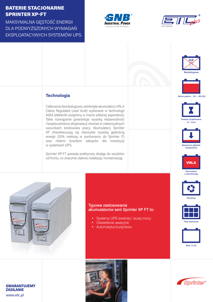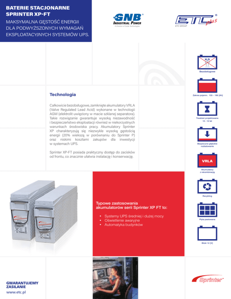 BATERIE STACJONARNE SPRINTER XP-FT MAKSYMALNA GĘSTOŚĆ ENERGII DLA PODWYŻSZONYCH WYMAGAŃ EKSPLOATACYJNYCH SYSTEMÓW UPS. Bezobsługowe Technologia Zakres pojemn. 155 – 186 [Ah] Całkowicie bezobsługowe, zamknięte akumulatory VRLA (Valve Regulated Lead Acid) wykonane w technologii AGM (elektrolit uwięziony w macie szklanej separatora). Takie rozwiązanie gwarantuje wysoką niezawodność i bezpieczeństwo eksploatacji również w niekorzystnych warunkach środowiska pracy. Akumulatory Sprinter XP charakteryzują się niezwykle wysoką gęstością energii (20% wiekszą w porównaniu do Sprinter P) oraz niskimi kosztami zakupów dla inwestycji w systemach UPS. Sprinter XP-FT posiada praktyczny dostęp do zacisków od frontu, co znacznie ułatwia instalację i konserwację. Trwałość projektowana 10 - 12 lat Bezpieczne głębokie rozładowanie VRLA Akumulatory z rekombinacją Recykling Typowe zastosowania akumulatorów serii Sprinter XP FT to: • Systemy UPS średniej i dużej mocy • Oświetlenie awaryjne • Automatyka budynków Płyta pastowana Bloki 12 [V] BATERIE STACJONARNE SPRINTER XP-FT MAKSYMALNA GĘSTOŚĆ ENERGII DLA PODWYŻSZONYCH WYMAGAŃ EKSPLOATACYJNYCH SYSTEMÓW UPS. Sprinter XP FT - Specyfikacja: •Akumulatory Sprinter XP FT wykonane są w technologii AGM (elektrolit uwięziony w macie separatora). •XP FT (Front terminal) - praktyczny dostęp do zacisków od frontu baterii. •Duża gęstość energii, wysoka niezawodność. •Całkowicie bezobsługowe (brak dolewania wody) przez cały okres eksploatacji. •Zakres pojemności: 155 ÷ 186 Ah C10. •Żywotność projektowana: 10-12 lat (do 80% pojemności znamionowej). •Pastowana płyta ze stopem wapniowym. •Krótki czas ładowania. •Niewielkie samoczynne rozładowanie. •Bezpieczne głębokie rozładowanie zgodnie z normą DIN 43539 T5. •Bezproblemowy transport gotowych do pracy bloków. Akumulatory Sprinter mogą być bezpiecznie transportowane powietrzem, koleją lub drogą. (wg. IATA, DGR clause A 67). •Recykling: Akumulatory ołowiowe są wartościowym surowcem. Przetwarzanie powtórnie akumulatorów Sprinter XP FT przekracza 90%. •Dostępne w obudowach standardowych lub trudnopalnych (zgodnych z UL 94-V0). •Projektowane zgodnie z normą EN 60896-21/-22. •Produkcja w Europie. Sprinter XP FT Zakres pojemności C10 do 1,80V przy 20˚C Trwałość projektowana Samorozładowanie na dzień Napięcie ładowania buforowego przy 25˚C Napięcie ładowania dla pracy cyklicznej przy 25˚C 155 – 186 [Ah] 10-12 lat < 0,1 [%] 2,27 [V/ogniwo] 2,35 [V/ogniwo] BATERIE STACJONARNE SPRINTER XP FT MAKSYMALNA GĘSTOŚĆ ENERGII DLA PODWYŻSZONYCH WYMAGAŃ EKSPLOATACYJNYCH SYSTEMÓW UPS. Typ Nap. znam. [V] Poj. znam.*) C10 [Ah] Moc 10min 1,60 Vpc 20˚C W/blok Wewnętrzna rezystancja [mΩ] Prąd Zwarcia [A] Waga [kg] Długość [mm] Szer. [mm] Wys. max [mm] Rodzaj wyprowadz. XP12V4400FT 12 155 4380 4,0 3160 54,3 559 125 283 F-M6-90° XP12V5300FT 12 186 5300 3,2 3892 62 559 125 318 F-M6-90° Wymagania dotyczące składowania, transportu oraz eksploatacji akumulatorów znajdują się w instrukcji eksploatacji akumulatorów Sprinter XP FT Szczegółowe dane techniczne są dostępne pod adresem : www.etc.pl *) do napięcia końcowego 1,80V/og. przy 20˚C. PROJEKTOWANIE INSTALACJE REMONTY I MODERNIZACJA PRZEGLĄDY UTYLIZACJA SERWIS ETC plus sp. z o.o. ul. Drukarska 14 27-400 Ostrowiec Świętokrzyski tel. +48 41 26 36 811 fax:+48 41 26 54 443 kom.+48 604 49 79 92 e-mail:[email protected]