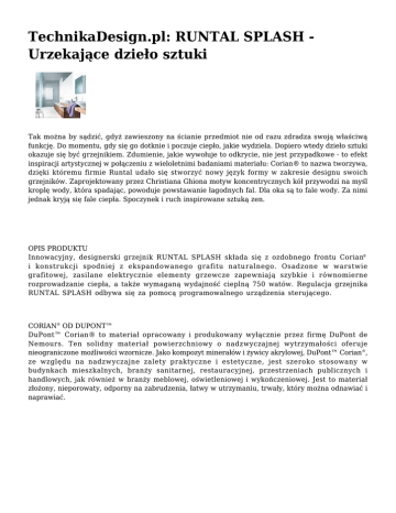 TechnikaDesign.pl: RUNTAL SPLASH Urzekające dzieło sztuki Tak można by sądzić, gdyż zawieszony na ścianie przedmiot nie od razu zdradza swoją właściwą funkcję. Do momentu, gdy się go dotknie i poczuje ciepło, jakie wydziela. Dopiero wtedy dzieło sztuki okazuje się być grzejnikiem. Zdumienie, jakie wywołuje to odkrycie, nie jest przypadkowe - to efekt inspiracji artystycznej w połączeniu z wieloletnimi badaniami materiału: Corian® to nazwa tworzywa, dzięki któremu firmie Runtal udało się stworzyć nowy język formy w zakresie designu swoich grzejników. Zaprojektowany przez Christiana Ghiona motyw koncentrycznych kół przywodzi na myśl kroplę wody, która spadając, powoduje powstawanie łagodnych fal. Dla oka są to fale wody. Za nimi jednak kryją się fale ciepła. Spoczynek i ruch inspirowane sztuką zen. OPIS PRODUKTU Innowacyjny, designerski grzejnik RUNTAL SPLASH składa się z ozdobnego frontu Corian® i konstrukcji spodniej z ekspandowanego grafitu naturalnego. Osadzone w warstwie grafitowej, zasilane elektrycznie elementy grzewcze zapewniają szybkie i równomierne rozprowadzanie ciepła, a także wymaganą wydajność cieplną 750 watów. Regulacja grzejnika RUNTAL SPLASH odbywa się za pomocą programowalnego urządzenia sterującego. CORIAN® OD DUPONT™ DuPont™ Corian® to materiał opracowany i produkowany wyłącznie przez firmę DuPont de Nemours. Ten solidny materiał powierzchniowy o nadzwyczajnej wytrzymałości oferuje nieograniczone możliwości wzornicze. Jako kompozyt minerałów i żywicy akrylowej, DuPont™ Corian®, ze względu na nadzwyczajne zalety praktyczne i estetyczne, jest szeroko stosowany w budynkach mieszkalnych, branży sanitarnej, restauracyjnej, przestrzeniach publicznych i handlowych, jak również w branży meblowej, oświetleniowej i wykończeniowej. Jest to materiał złożony, nieporowaty, odporny na zabrudzenia, łatwy w utrzymaniu, trwały, który można odnawiać i naprawiać. DANE TECHNICZNE Typ grzejnika płytowy Moc [W] 750 Typ podłączenia (boczne, dolne) boczne/dolne Temperatura pracy [°C] x Wymiary grzejnika (wys. x szer.) [mm] 1230 x 750 Wyposażenie regulacja odbywa się odbywa się za pomocą programowalnego urządzenia sterującego Model (typoszereg) SPAE-120-075/BP pokaż/ukryj więcej danych KONTAKT TechnikaDesign.pl E-mail: [email protected] WWW: www.technikadesign.pl Tel: +48 22 879 89 21 Adres: Ostrobramska 91 04-118 Warszawa