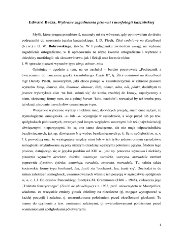 Edward Breza, Wybrane zagadnienia pisowni i morfologii kaszubskiej Myśli, które pragnę przedstawić, nasunęły mi się wówczas, gdy opiniowałem do druku podręczniki do nauczania języka kaszubskiego: I. D. Pioch, śëcé codniowé na Kaszëbach (b.r.w.) i II. W. Bobrowskiego, Kôrba. W I podręczniku zwróciłem uwagę na wybrane zagadnienia ortograficzne, w II opracowaniu na róŜne kwestie ortograficzne i wybrane z dziedziny morfologii: tak słowotwórstwa, jak i fleksji oraz kwestie róŜne. I. W sprawie pisowni wyrazów typu lómp, nómer, nóta Opiniując – zgodnie z tym, na co zasłuŜył – bardzo pozytywnie „Podręcznik z ćwiczeniami do nauczania języka kaszubskiego. Część II”, tj. śëcé codniowé na Kaszëbach mgr Danuty Pioch, zauwaŜyłem, jaki chaos panuje w kaszubszczyźnie w zakresie pisowni wyrazów lómp, lóntrus, lón, lónowac, lótowac, lóŜé, nómer, nóta, nól, pónkt; dodałbym tu jeszcze wykrzyknik róm ‘na bok, odsuń się’ do konia, rzadziej do krowy, zapoŜyczony z niem. skróconej formy rum, co z pełnej herum ‘koło, naokoło’; rozwaŜyć by teŜ trzeba przy tej okazji pisownię innych słów omawianego typu. Wszystkie wyliczone wyrazy i niektóre inne, do których przejdę, znamienne są tym, Ŝe etymologiczna samogłoska –u- lub –o- występuje w sąsiedztwie, a więc przed lub po tzw. spółgłoskach półotwartych, zwanych pod innym względem sonornymi lub teŜ (najwłaściwiej) dźwięcznymi nieparzystymi, bo są one same dźwięczne, ale nie mają odpowiedników bezdźwięcznych, jak np. dźwięczne b, g wobec bezdźwięcznych p, k. Są to spółgłoski m, n, r, l, ł; powodują one, Ŝe występujące między nimi lub w ich tylko jednostronnym sąsiedztwie samogłoski artykułowane są przy niŜszym (rzadziej wyŜszym) połoŜeniu języka. Śladem tego procesu, datującego się w języku polskim od XIII w., jest np. potoczna wymowa i niekiedy pisownia wyrazów derektor, Ŝeletka, amonicja, saradela, suteryna, martadela zamiast poprawnie dyrektor, Ŝyletka, amunicja, seradela, suterena, mortadela. Tu naleŜą takŜe kociewskie formy typu bochanek, lan, Ŝanić sia ‘bochenek, len, Ŝenić się’. Dochodzi tu do zmian zaleŜnych samogłosek, uwarunkowanych właśnie ich pozycją w sąsiedztwie spółgłosek m, n, r, l, ł. Od czasów francuskiego fonetyka M. Grammonta (1866 – 1948), zwłaszcza jego „Traktatu fonetycznego” (Traité de phonétique) z r. 1933, prof. uniwersytetu w Montpellier, wiadomo, Ŝe wszystkie zmiany głosek dzielimy na niezaleŜne (tj. mogące występować w kaŜdej pozycji) i zaleŜne, tj. uwarunkowane połoŜeniem przed określonymi głoskami. Tu mamy do czynienia z tzw. zmianami zaleŜnymi, tj. uwarunkowanymi połoŜeniem przed wymienionymi spółgłoskami półotwartymi. 1 Etymologicznie rzecz traktując, wszystkie z wyliczonych (i za chwilę rozwaŜanych) wyrazów Kaszubi przejęli bezpośrednio z języka polskiego, jak np. lótowac, nómer, nóta, punkt i pokrewne; wśród nich nómer, nóta, punkt to poŜyczki z jęz. łacińskiego w polszczyźnie od kolejno łacińskich wyrazów numerus ‘liczba, cyfra’, nota ‘znak, znamię, piętno’, punctus albo punctum dosłownie ‘ukłucie’, realnie ‘kropka’ i w niemczyźnie z dodanym wyrazem nól z łacińskiego nullus ‘Ŝaden’; inne pochodzą z języka niemieckiego, najczęściej z gwar dolnoniemieckich i ich pochodzenie łatwo podać (tych bardziej zawiłych objaśniać nie będę), jak kómkara, kómpel, lóbzak lub róbzak z Rucksack ‘worek na plecy’, lófa lub lópa z (ostatecznie) górnoniem. laufen, dolnoniem. lopen lub löpen ‘biegać’ (z czego teŜ nazwisko Lepper), lómp, lóntrus, lón i pokrewne, lóz(ny) od los, rónkel lub rónkla z Runkel(rübe) ‘burak pastewny’ i pokrewne, szróba od średnio-wysoko-niem. schrūbe lub szrówa od dolnoniem. schruve; szrópa, znalazłyby się pewno i inne. W normatywnych wydawnictwach kaszubskich rzecz przedstawia się następująco. W Zasadach pisowni kaszubskiej E. Brezy i J. Tredera znalazły się (w dodanym Słowniczku): lómp, lóntrus, lózny, lózowac, lóŜé, nóta, nócëc, nórt ‘kąt’; teŜ z ang. w r. 1953 zapoŜyczony do polszczyzny nylon (od New York = Ny i Lon(don) = lon) jako nylón, szruba lub szruwa; według nich opracowany: 1) Słowôrz kaszëbsko-polscczi A. Labudy notuje: kumkara ‘taczka ze skrzynią’; lóz ‘wolny, wolno’; luńder ‘próŜniak’ i luńdrowac ‘próŜnować’; nóta i pochodne nócëc, ale juŜ notérowanié, notérënk; nómer i pochodne nómrowac; nórt ‘kąt’; rąkla ‘burak pastewny’; róra, rórka ‘rura, rurka’; szrópa ‘zgrzebło’, szrópowac ‘posługiwać się zgrzebłem’; szruwa; za Sych V 291 podany onomatopeiczny szrum ‘potańcówka’; 2) Słownik polsko-kaszubski J. Trepczyka zawiera: (z)lózowac, (z)lózowanié, lóznota, lózëna; nóta, ale numer i wszystkie pochodne: numerënk, numeracëjô, numrowac, numrowi, nôrt, pąkt, rąkla, szrót, szrótowac; szruwa; moŜe takŜe niektóre inne, które nie tak łatwo znaleźć w jednostronnej, polsko-kaszubskiej części. U Sychty znajdziemy m.in. lón, lónowac, rąkel, rąklowi, rąklowiska, srómpa ‘dziewczyna niezgrabna’, ruta, mutra. Propozycją dla piszących są Wskôzë kaszëbsczégo pisënku (zob. Słownik na s. 114 – 183) E. Gołąbka, gdzie znajdziemy: luńt, nórt, nótë, nótczi, pąkt, róra lub réra, szruba/szruwa. Pisownię tych i innych wyrazów trzeba ujednolicić, skoro tworzymy kaszubski język literacki i skoro uczymy języka kaszubskiego w szkole, pojawia się on w miejscach publicznych. Ogólne wskazówki znalazły się w Zasadach ... (z r. 1984, zwłaszcza p. 3 b, c) z przykładowymi wyrazami blós ‘tylko’, brót ‘bochenek chleba’, brózda, chróst, klóska, lómp ‘niegodziwiec’, lómpë ‘szmaty’, lóntrus ‘urwis’, lóz(ny), lózowac, lóŜé ‘niepowiązane zboŜe’, nórt ‘kąt’