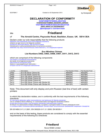 D2.08.05.14 Issue 17 Page 1 of 2 DC0758N.7 Created on 02 September 2013 DECLARATION OF CONFORMITY KONFORMITETSDEKLARATION OVERENSSTEMMELSESERKLÆRING VAATIMUSTENMUKAISUUSVAKUUTUS DEKLARACJA ZGODNOSCI Декларация о соответствии Friedland We of The Arnold Centre, Paycocke Road, Basildon, Essex. UK. SS14 3EA Declare under our sole responsibility that the following products deklarerar med uteslutande ansvar att de följande produkterna erklærer på eget ansvar at de følgende produkter Ilmoitamme yksinvastuullisena, että seuraavat tuotteet Oświadczamy z pełną opowiedzialnością, że wymienione produkty – Заявляем под нашу исключительную ответственность, что следующие изделия Evo Wirefree Chimes List Numbers D402, D403, D406, D407, D411, D412, D413 which are comprised of the following components som består av de följande komponenterna der består af de følgende komponenter, jotka koostuvat seuraavista osista, złożone z wyszczególnionych elementów – которые состоят из следующих компонентов List No. D402 D403 D406 D407 D411 D412 D413 Description Part Number Chime Part Number Push Evo-50 Silver Chime Kit Evo-50 White Chime Kit Evo-100 Silver Chime Kit Evo-100 White Chime Kit Evo-200 White Chime Kit Evo-200 Silver Chime with Strobe Kit Evo-200 White Chime with Strobe Kit 46400PL 46401PL 46402PL 46403PL 46405PL 46406PL 46415PL 46432PL 46376PL 46432PL 46432PL 46376PL 46432PL 46432PL Note: This document will only display and print Russian (last line of text) with certain printers to which this declaration relates, are in conformity with the test requirements of the following standards: för vilka denna deklaration gäller överensstämmer med testkraven för följande standarder: som er omfattet af denne erklæring, er i overensstemmelse med følgende standarders testkrav: ja joita tämä ilmoitus koskee, ovat seuraavien standardien testivaatimusten mukaiset : do których ma zastosowanie niniejsza deklaracja, są zgodne z wymogami testów w ramach nastpujących norm: и к которым имеет отношение данная декларация, соответствуют испытательным требованиям следующих стандартов: EN 301489-3:V1.3.1:2001, EN 300220-3:V1.3.1:2000, EN 60335-1 and on the basis of this testing, these products are considered to comply with the essential requirements of the following EU Directives Friedland Novar ED&S Limited Registered Office: Honeywell House, Skimped Hill Lane, Bracknell, Berks, RG12 1EB D2.08.05.14 Issue 17 Page 2 of 2 DC0758N.7 Created on 02 September 2013 och med dessa tester som grund anses dessa produkter överensstämma med de väsentliga kraven i följande EU-direktiv: og baseret på denne testning opfylder disse produkter de følgende EU-direktivers væsentlige krav ja näiden testien perusteella, näiden tuotteiden katsotaan olevan seuraavien EU-direktiivien vaatimusten mukaiset i na podstawie wspomnianych testów stwierdza się, że produkty te odpowiadają podstawowym wymogom następujących dyrektyw Unii Europejskiej : и на основании этих испытаний данные изделия признаны как соответствующие основным требованиям следующих директив ЕС: Low Voltage Directive (2006/95/EC), EMC Directive (2004/108/EC), R&TTE Directive (1999/5/EC), RoHS Directive (2011/65/EU). CE mark affixed – Before 2010 Support documentation reference: ET93S-04-082-01 ET93S-04-082-02 PSE-93-0335-1 Signature: Print Name: Keith Davis Function: Global Current Products Manager Novar ED&S Limited operates a Quality Management System which is certified to ISO9001 by a UKAS accredited certification body. Friedland Novar ED&S Limited Registered Office: Honeywell House, Skimped Hill Lane, Bracknell, Berks, RG12 1EB