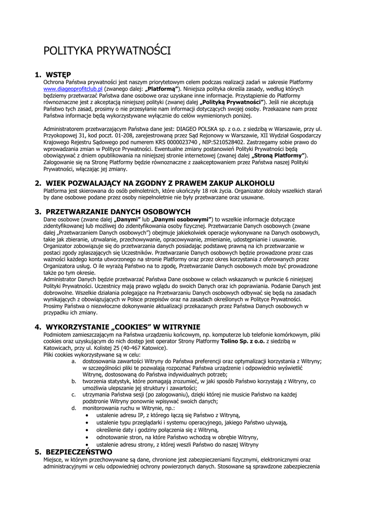 POLITYKA PRYWATNOŚCI 1. WSTĘP Ochrona Państwa prywatności jest naszym priorytetowym celem podczas realizacji zadań w zakresie Platformy www.diageoprofitclub.pl (zwanego dalej: „Platformą”). Niniejsza polityka określa zasady, według których będziemy przetwarzać Państwa dane osobowe oraz uzyskane inne informacje. Przystąpienie do Platformy równoznaczne jest z akceptacją niniejszej polityki (zwanej dalej „Polityką Prywatności”). Jeśli nie akceptują Państwo tych zasad, prosimy o nie przesyłanie nam informacji dotyczących swojej osoby. Przekazane nam przez Państwa informacje będą wykorzystywane wyłącznie do celów wymienionych poniżej. Administratorem przetwarzającym Państwa dane jest: DIAGEO POLSKA sp. z o.o. z siedzibą w Warszawie, przy ul. Przyokopowej 31, kod poczt. 01-208, zarejestrowaną przez Sąd Rejonowy w Warszawie, XII Wydział Gospodarczy Krajowego Rejestru Sądowego pod numerem KRS 0000023740 , NIP:5210528402. Zastrzegamy sobie prawo do wprowadzania zmian w Polityce Prywatności. Ewentualne zmiany postanowień Polityki Prywatności będą obowiązywać z dniem opublikowania na niniejszej stronie internetowej (zwanej dalej „Stroną Platformy”). Zalogowanie się na Stronę Platformy będzie równoznaczne z zaakceptowaniem przez Państwa naszej Polityki Prywatności, włączając jej zmiany. 2. WIEK POZWALAJĄCY NA ZGODNY Z PRAWEM ZAKUP ALKOHOLU Platforma jest skierowana do osób pełnoletnich, które ukończyły 18 rok życia. Organizator dołoży wszelkich starań by dane osobowe podane przez osoby niepełnoletnie nie były przetwarzane oraz usuwane. 3. PRZETWARZANIE DANYCH OSOBOWYCH Dane osobowe (zwane dalej „Danymi” lub „Danymi osobowymi”) to wszelkie informacje dotyczące zidentyfikowanej lub możliwej do zidentyfikowania osoby fizycznej. Przetwarzanie Danych osobowych (zwane dalej „Przetwarzaniem Danych osobowych”) obejmuje jakiekolwiek operacje wykonywane na Danych osobowych, takie jak zbieranie, utrwalanie, przechowywanie, opracowywanie, zmienianie, udostępnianie i usuwanie. Organizator zobowiązuje się do przetwarzania danych posiadając podstawę prawną na ich przetwarzanie w postaci zgody zgłaszających się Uczestników. Przetwarzanie Danych osobowych będzie prowadzone przez czas ważności każdego konta utworzonego na stronie Platformy oraz przez okres korzystania z oferowanych przez Organizatora usług. O ile wyrażą Państwo na to zgodę, Przetwarzanie Danych osobowych może być prowadzone także po tym okresie. Administrator Danych będzie przetwarzać Państwa Dane osobowe w celach wskazanych w punkcie 6 niniejszej Polityki Prywatności. Uczestnicy mają prawo wglądu do swoich Danych oraz ich poprawiania. Podanie Danych jest dobrowolne. Wszelkie działania polegające na Przetwarzaniu Danych osobowych odbywać się będą na zasadach wynikających z obowiązujących w Polsce przepisów oraz na zasadach określonych w Polityce Prywatności. Prosimy Państwa o niezwłoczne dokonywanie aktualizacji przekazanych przez Państwa Danych osobowych w przypadku ich zmiany. 4. WYKORZYSTANIE „COOKIES” W WITRYNIE Podmiotem zamieszczającym na Państwa urządzeniu końcowym, np. komputerze lub telefonie komórkowym, pliki cookies oraz uzyskującym do nich dostęp jest operator Strony Platformy Tolino Sp. z o.o. z siedzibą w Katowicach, przy ul. Kolistej 25 (40-467 Katowice). Pliki cookies wykorzystywane są w celu: a. dostosowania zawartości Witryny do Państwa preferencji oraz optymalizacji korzystania z Witryny; w szczególności pliki te pozwalają rozpoznać Państwa urządzenie i odpowiednio wyświetlić Witrynę, dostosowaną do Państwa indywidualnych potrzeb; b. tworzenia statystyk, które pomagają zrozumieć, w jaki sposób Państwo korzystają z Witryny, co umożliwia ulepszanie jej struktury i zawartości; c. utrzymania Państwa sesji (po zalogowaniu), dzięki której nie musicie Państwo na każdej podstronie Witryny ponownie wpisywać swoich danych; d. monitorowania ruchu w Witrynie, np.: ustalenie adresu IP, z którego łączą się Państwo z Witryną, ustalenie typu przeglądarki i systemu operacyjnego, jakiego Państwo używają, określenie daty i godziny połączenia się z Witryną, odnotowanie stron, na które Państwo wchodzą w obrębie Witryny, ustalenie adresu strony, z której weszli Państwo do naszej Witryny 5. BEZPIECZEŃSTWO Miejsce, w którym przechowywane są dane, chronione jest zabezpieczeniami fizycznymi, elektronicznymi oraz administracyjnymi w celu odpowiedniej ochrony powierzonych danych. Stosowane są sprawdzone zabezpieczenia chroniące przed nieuprawnionym ujawnieniem, wykorzystaniem, zmianą lub zniszczeniem danych osobowych udostępnianych nam przez użytkowników za pośrednictwem niniejszej witryny internetowej. 6. REZYGNACJA, DOSTĘP, PYTANIA I DODATKOWE INFORMACJE Na Państwa prośbę lub gdy jest to wymagane przez przepisy prawa, zobowiązujemy się do potwierdzenia, jakie Państwa Dane osobowe są przez nas przechowywane. W tym celu prosimy przesłać zapytanie na adres poczty elektronicznej [email protected] Każdy użytkownik może samodzielnie w dowolnym momencie dokonać modyfikacji lub aktualizacji swoich Danych osobowych. W każdym czasie użytkownik może także usunąć swoje Dane osobowe, co będzie równoznaczne z zaprzestaniem korzystania z usług dostarczanych przez Organizatora za pośrednictwem Strony Platformy. Rezygnację z Platformy można zgłosić także bezpośrednio na adres mailowy [email protected] lub za pośrednictwem infolinii 22 100 54 75 7. LINKI Ta Witryna może zawierać linki lub odnośniki do stron i witryn znajdujących się poza naszą kontrolą. Informujemy, że nie mamy możliwości kontrolowania tych stron i witryn oraz że nasze przepisy dotyczące ochrony prywatności ich nie obejmują. Zachęcamy Państwa do przeczytania zasad ochrony prywatności oraz regulaminów stron połączonych, na które Państwo wchodzą po opuszc