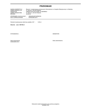 PRZEDMIAR NAZWA INWESTYCJI ADRES INWESTYCJI INWESTOR ADRES INWESTORA BRANŻA : : : : : Remont / modernizacja pomieszczeń Informatorium w Urzędzie Statystycznym w Gdańsku Ul. Danusi 4, 80-434 Gdańsk URZĄD STATYSTYCZNY W GDAŃSKU Ul. Danusi 4, 80-434 Gdańsk. sanitarna SPORZĄDZIŁ KALKULACJE : DATA OPRACOWANIA : ARKADIUSZ BURNICKI KWIECIEŃ 2014 Wartość kosztorysowa robót bez podatku VAT : 0.00 zł Słownie: zero i 00/100 zł WYKONAWCA : INWESTOR : Data opracowania KWIECIEŃ 2014 Data zatwierdzenia Dokument został opracowany przy pomocy programu NORMA STD URZĄD STATYSZTYCZNY - remont instalacji co - PRZEDMIAR.ath OBMIAR Lp. Podstawa Opis i wyliczenia 1 Instalacja grzejnikowa 1 KNR-W 2-15 Grzejniki stalowe jednopłytowe CV 11 600/1600 d.1 0418-03 4 j.m. szt. szt. 3 KNR-W 2-15 Głowica termostatyczna d.1 0412-04 4 szt. 4 KNR-W 2-15 Rury przyłączne z tworzyw sztucznych o śr. zewn. 16 mm do grzejników d.1 0429-01 4 kpl. szt. szt. kpl. 5 KNR-W 2-15 Rurociągi w instalacjach c.o. z tworzyw sztucznych o śr. zewnętrznej 16 mm o m d.1 0404-01 połączeniach zgrzewanych Uniwersalna rura flex 16 15 m 6 KNR-W 2-15 Rurociągi w instalacjach c.o. z tworzyw sztucznych o śr. zewnętrznej 32 mm o m d.1 0404-03 połączeniach zgrzewanych Uniwersalna rura flex 32 16 m 8 KNR 0-34 d.1 0101-11 Izolacja rurociągów śr.16 i 15mm otulinami Thermaflex FRZ - jednowarstwowy- m mi gr.13 mm (J) 15 m Izolacja rurociągów śr.32 mm otulinami Thermaflex FRZ - jednowarstwowymi gr.20 mm (N) 16 9 KNR-W 2-15 Próby z dokonaniem regulacji instalacji centralnego ogrzewania (na gorąco) d.1 0436-01 4 m 4.000 4.000 RAZEM 4.000 4.000 RAZEM 4.000 4.000 RAZEM 4.000 15.000 RAZEM 15.000 16.000 RAZEM 16.000 15.000 RAZEM 15.000 16.000 RAZEM 16.000 4.000 RAZEM 4.000 31.000 RAZEM 31.000 31.000 RAZEM 31.000 4.000 RAZEM 4.000 1.000 RAZEM 1.000 urz. urz. 11 KNR-W 2-15 Płukanie instalacji d.1 0128-02 31 m 12 KNR-W 4-02 Wpięcie w istniejącą instalację d.1 0505-02 4 szt. m szt. kpl. kpl. -2- Norma STD Wersja 4.41a Nr seryjny: 12935 Użytkownik: MS 4.000 RAZEM m 10 KNR-W 2-15 Próby szczelności instalacji c.o. z rur z tworzyw sztucznych - dodatek za próbę m d.1 0406-05 w budynkach niemieszkalnych 31 m 2 Roboty budowlane towarzyszące. 13 Roboty budowlane towarzyszące d.2 kalk. własna 1 Razem szt. 2 KNR-W 2-15 Zawory grzejnikowe o śr. nominalnej 20 mm RLV-KS d.1 0412-03 4 7 KNR 0-34 d.1 0101-06 Poszcz