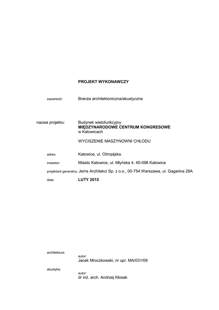 PROJEKT WYKONAWCZY zawartość: nazwa projektu: Branża architektoniczna/akustyczna Budynek wielofunkcyjny MIĘDZYNARODOWE CENTRUM KONGRESOWE w Katowicach WYCISZENIE MASZYNOWNI CHŁODU adres: Katowice, ul. Olimpijska. inwestor: Miasto Katowice, ul. Młyńska 4, 40-098 Katowice projektant generalny: Jems data: Architekci Sp. z o.o., 00-754 Warszawa, ul. Gagarina 28A LUTY 2015 architektura: autor: Jacek Mroczkowski, nr upr. MA/031/09 akustyka: autor: dr inż. arch. Andrzej Kłosak MIĘDZYNARODOWE CENTRUM KONGRESOWE W KATOWICACH 1. WRZESIEŃ 2014 DANE FORMALNE ................................................................................................................................................. 2 1.1. 1.2. 1.3. 1.4. 2. PRZEDMIOT OPRACOWANIA ............................................................................................................................................. 2 INWESTOR ................................................................................................................................................................... 2 CEL OPRACOWANIA ....................................................................................................................................................... 2 AUTORZY PROJEKTU ....................................................................................................................................................... 2 OPIS TECHNICZNY................................................................................................................................................. 2 2.1. 2.2. 2.3. 2.4. 2.5. 2.6. 2.7. 2.8. 3. OBSZAR OBJĘTY ZMIANAMI .............................................................................................................................................. 2 KONCEPCJA WYCISZENIA ................................................................................................................................................. 2 ZMIANY W KONSTRUKCJI I POSADOWIENIU .......................................................................................................................... 2 OCHRONA PRZECIWPOŻAROWA ........................................................................................................................................ 2 KOLORYSTYKA .............................................................................................................................................................. 2 SZCZEGÓLNA STARANNOŚĆ WYKONANIA.............................................................................................................................. 2 POŁĄCZENIA SPAWANE ................................................................................................................................................... 3 ZAPIS DOTYCZĄCY MAREK REFERENCYJNYCH ......................................................................................................................... 3 SPIS DOKUMENTACJI ............................................................................................................................................ 3 3.1. 3.2. OPIS .......................................................................................................................................................................... 3 SPIS RYSUNKÓW............................................................................................................................................................ 3 1 MIĘDZYNARODOWE CENTRUM KONGRESOWE W KATOWICACH 1. WRZESIEŃ 2014 DANE FORMALNE 1.1. PRZEDMIOT OPRACOWANIA Przedmiotem opracowania jest projekt wykonawczy wygłuszenia maszynowni chłodniczej, stanowiącej fragment inwestycji p.n. Międzynarodowe Centrum Kongresowe. 1.2. INWESTOR Inwestorem jest Miasto Katowice, ul. Młyńska 4, 40-098 Katowice 1.3. CEL OPRACOWANIA Niniejsze opracowanie powstało w celu zapobieżenia problemowi generowania nadmiernego hałasu przez chillery znajdujące się w maszynowni chłodniczej, produkującej chłód dla Spodka i MCK. 1.4. AUTORZY PROJEKTU Projekt został wykonany w firmie JEMS Architekci Sp. z o. o. przy współpracy biur projektów branżowych przez następujących autorów i sprawdzających: Architektura JEMS Architekci ........................................................................................................... JEMS Architekci Projektant .......................................................................................................................... arch. Jacek Mroczkowski Akustyka:.............................................................................................................................................. archAKUSTIK Projaktant ........................................................................................................................................... Andrzej Kłosak 2. OPIS TECHNICZNY 2.1. OBSZAR OBJĘTY ZMIANAMI Obszar opracowania obejmuje maszynownię chłodu, która zajmuje obszar na zapleczu Spodka, wskazany przez Mosir Katowice na ten cel. 2.2. KONCEPCJA WYCISZENIA Koncepcja wyciszenia zakłada 3 główne elementy, składające się na całość rozwiązania. Elementy te obejmują: - tłumik kulisowy umieszczony na zadaszeniu maszynowni, na całej jego powierzchni. Tłumik składa się z paneli kulis z ramy stalowej wypełnionej wełną mineralną z welonem, zabezpieczonej przed wypadaniem i odkształcaniem siatką stalową. Kulisy te montowane będą na konstrukcji zadaszenia. Zakłada się demontaż istniejącej kraty WEMA. Zakłada się też konieczne uzupełnienia konstrukcji (w postaci dodatkowych rygli). - ścianka tłumika z detalem połączenia z murem i ogrodzeniem oraz dodatkowe wygłuszenie z wełny mineralnej umieszczone na wewnętrznej stronie okalającego muru oraz żaluzja akustyczna od strony nowego ogrodzenia (od strony hotelu). - wygłuszenie sprężarek chillerów wykonane z obudów z wełny mineralnej i blachy (poza zakresem niniejszego opracowania). 2.3. 